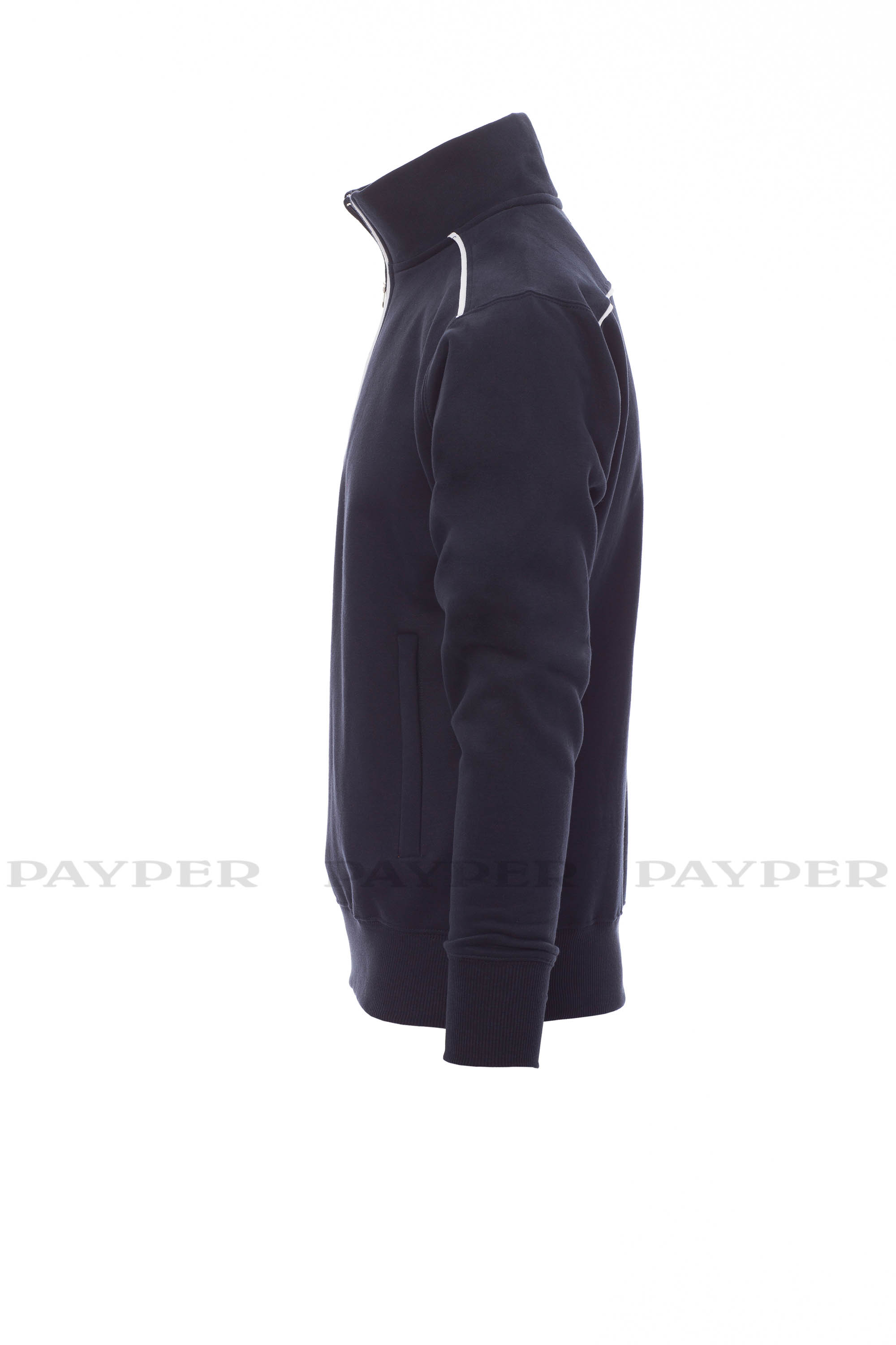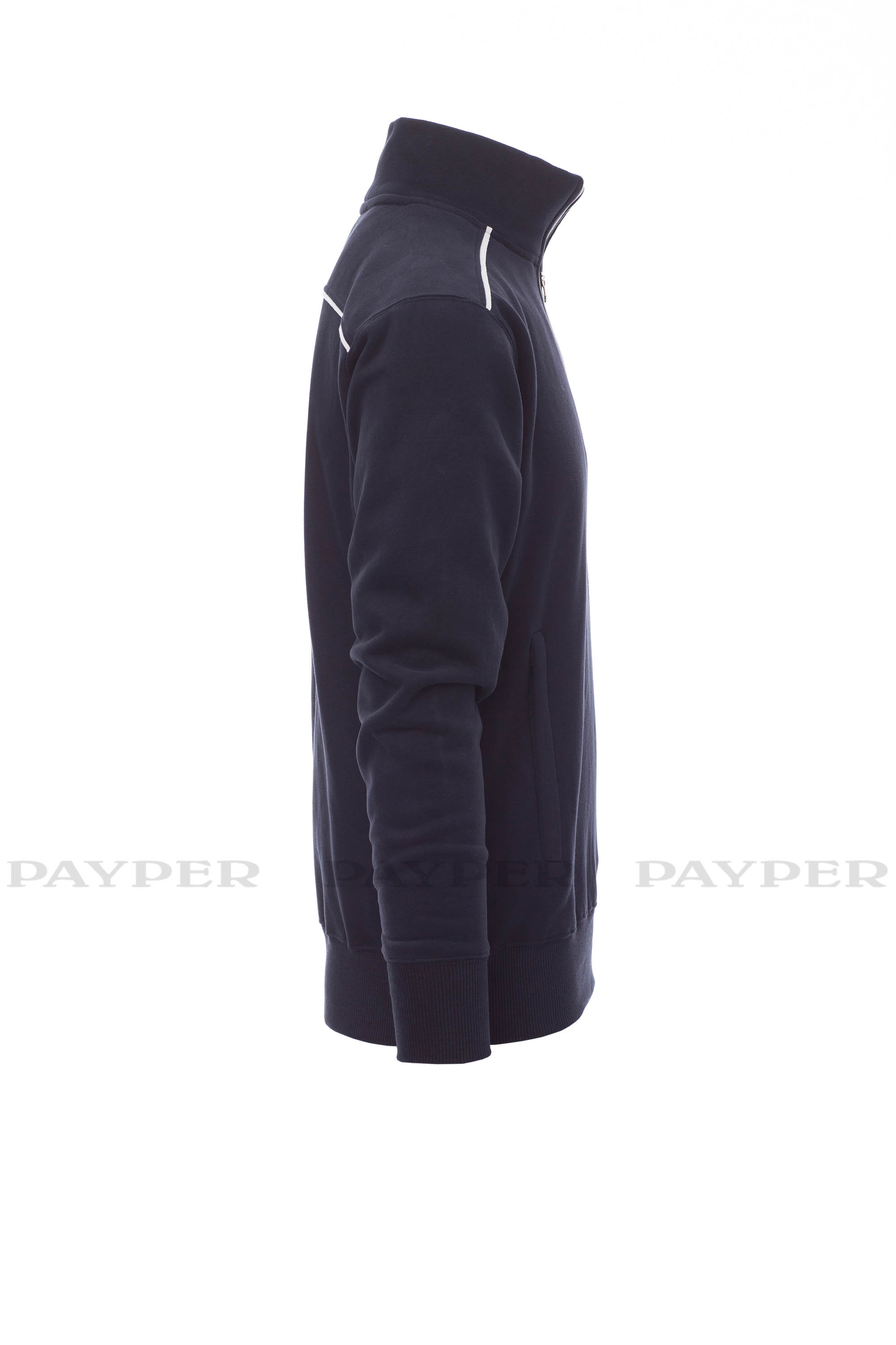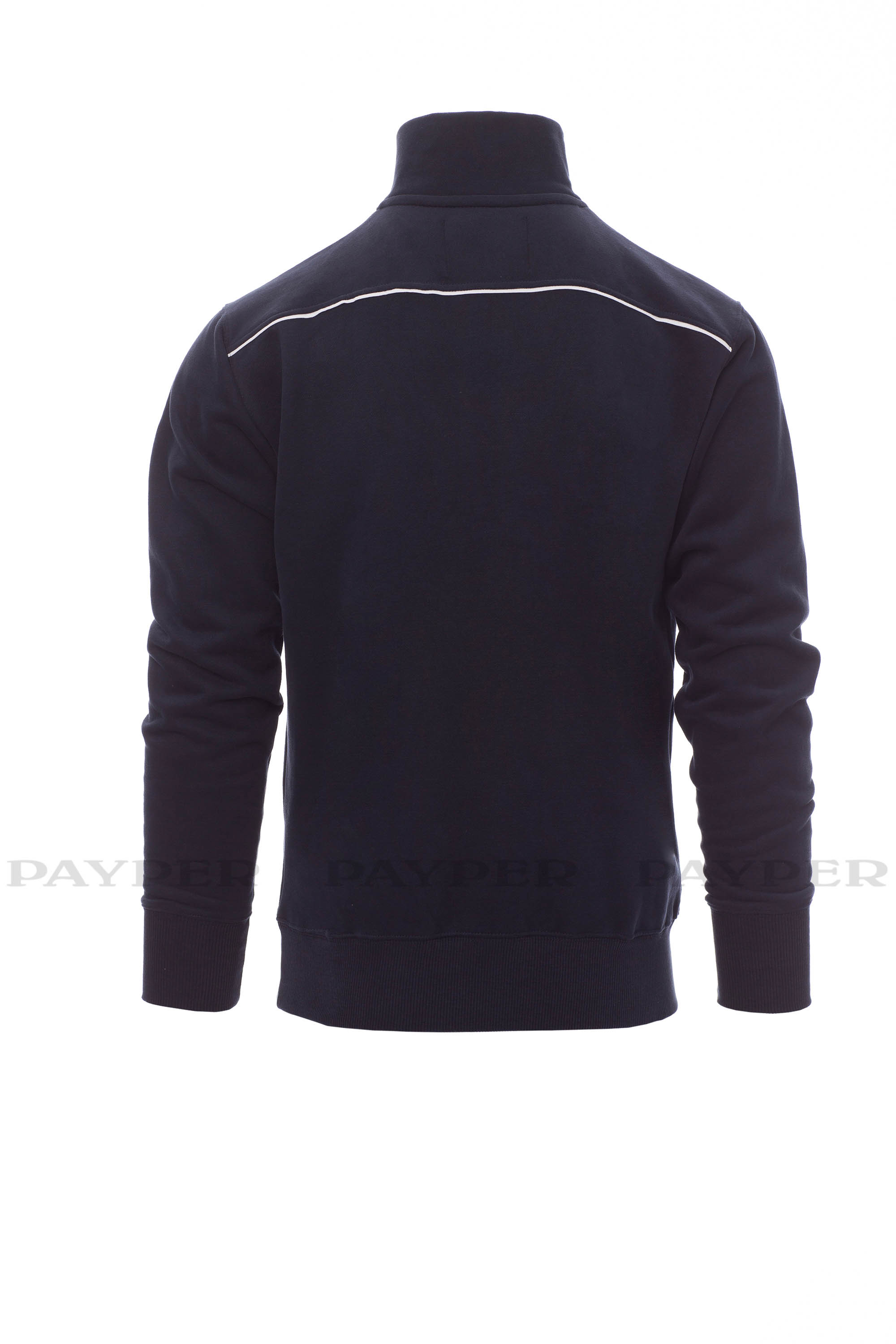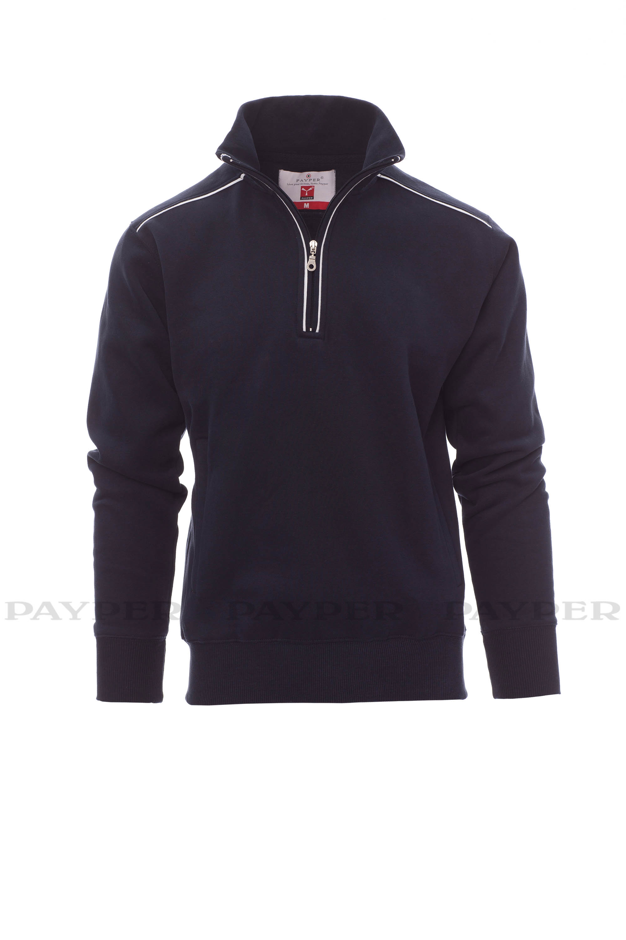 Sudadera con media cremallera de plástico con tirador metálico, ribete de contraste en hombros, borde de la cremallera y espalda. Dos bolsillos con cremallera, puños y dobladillo elásticos