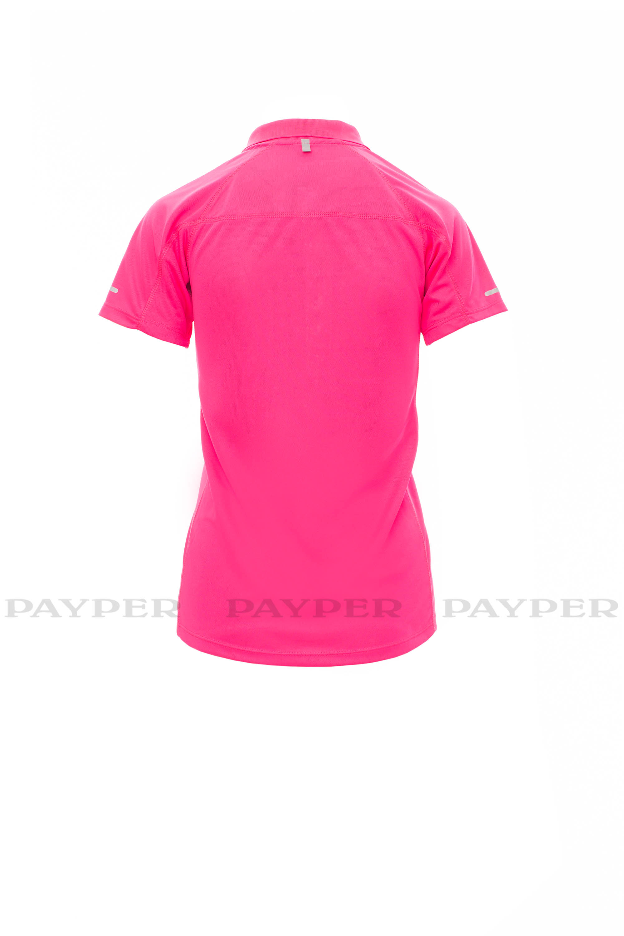 Camiseta polo técnica deportiva entallada para mujer de manga corta con seis botones a juego, mangas ranglán, doble costura lateral para mayor confort, fondo contorneado más largo en la parte posterior, aplicación reflectante en las mangas y en la parte posterior del cuello, etiqueta de transferencia.