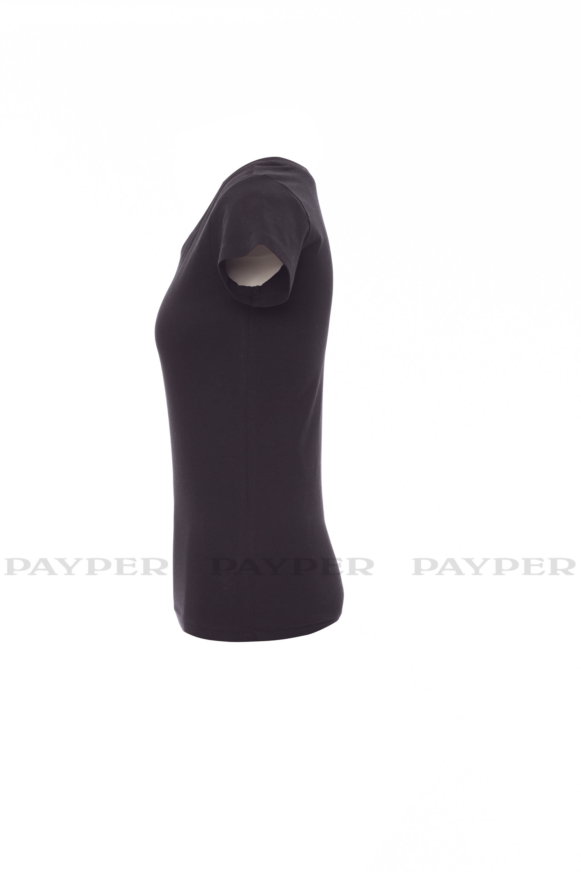Camiseta entallada para mujer manga corta con amplio escote redondo, cuello bajo mezclado con elastano de 1,2 cm, mangas cortas y ajustadas, costuras laterales para un ajuste mejor, costuras a dos agujas en hombros y posterior del cuello y cintas de algodón.