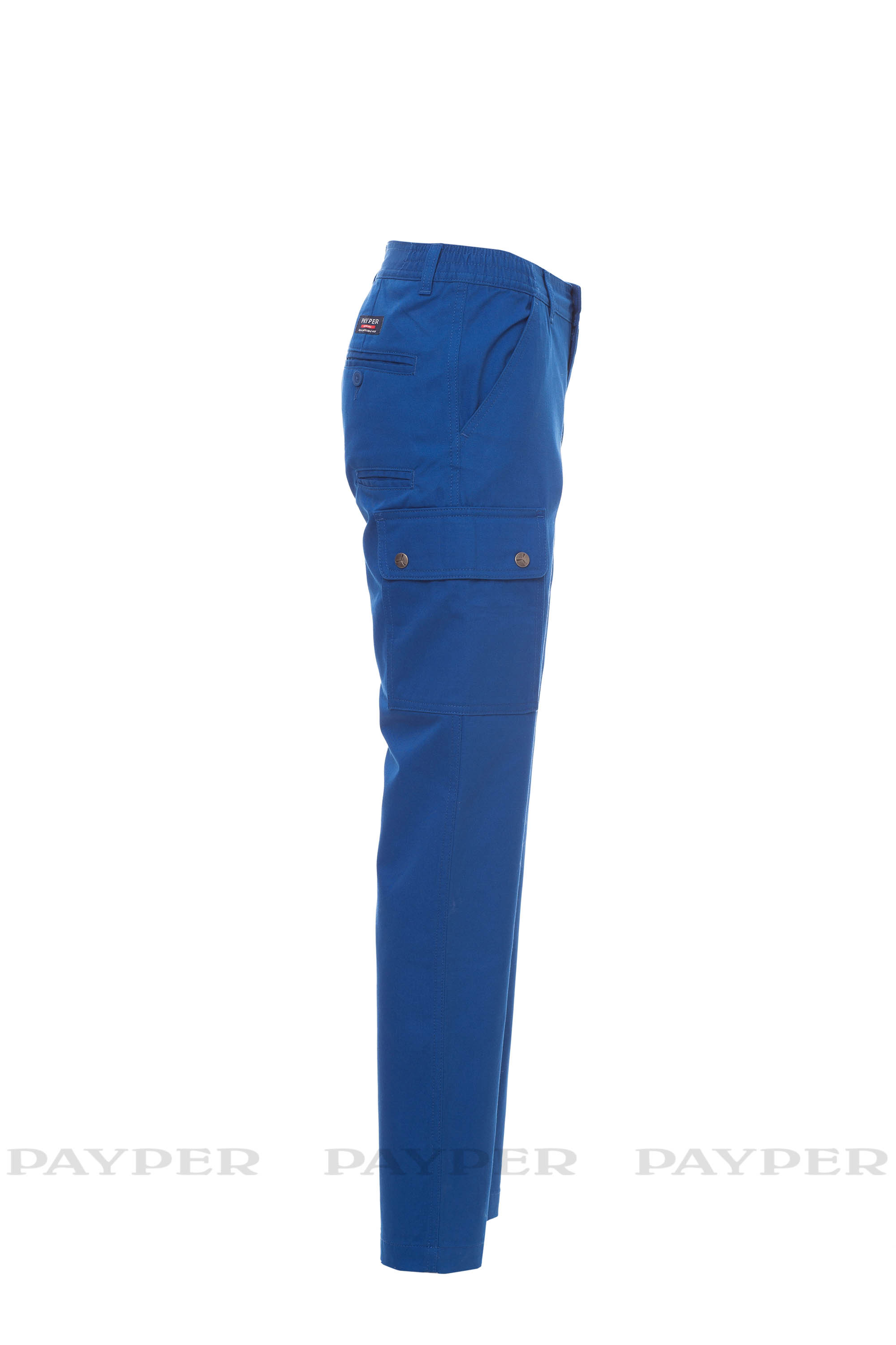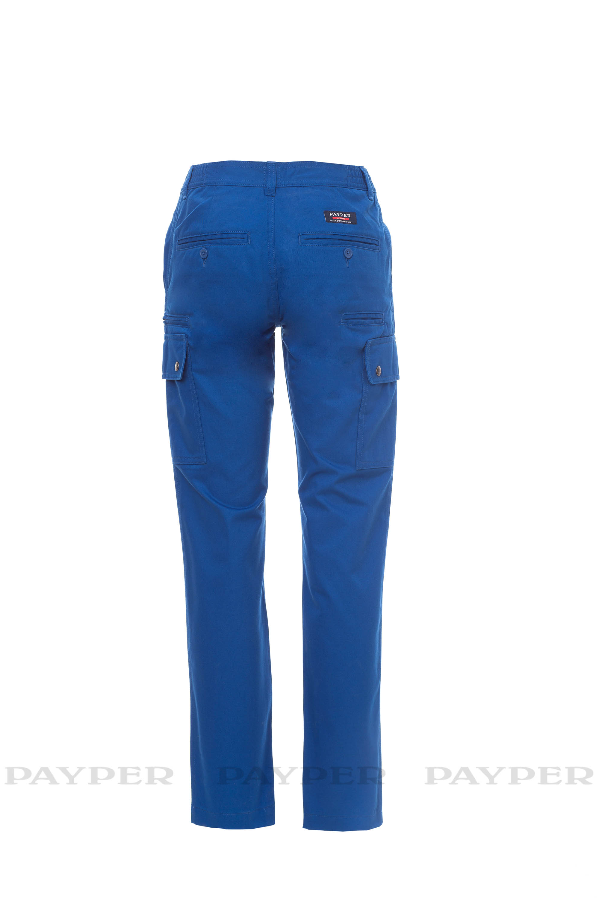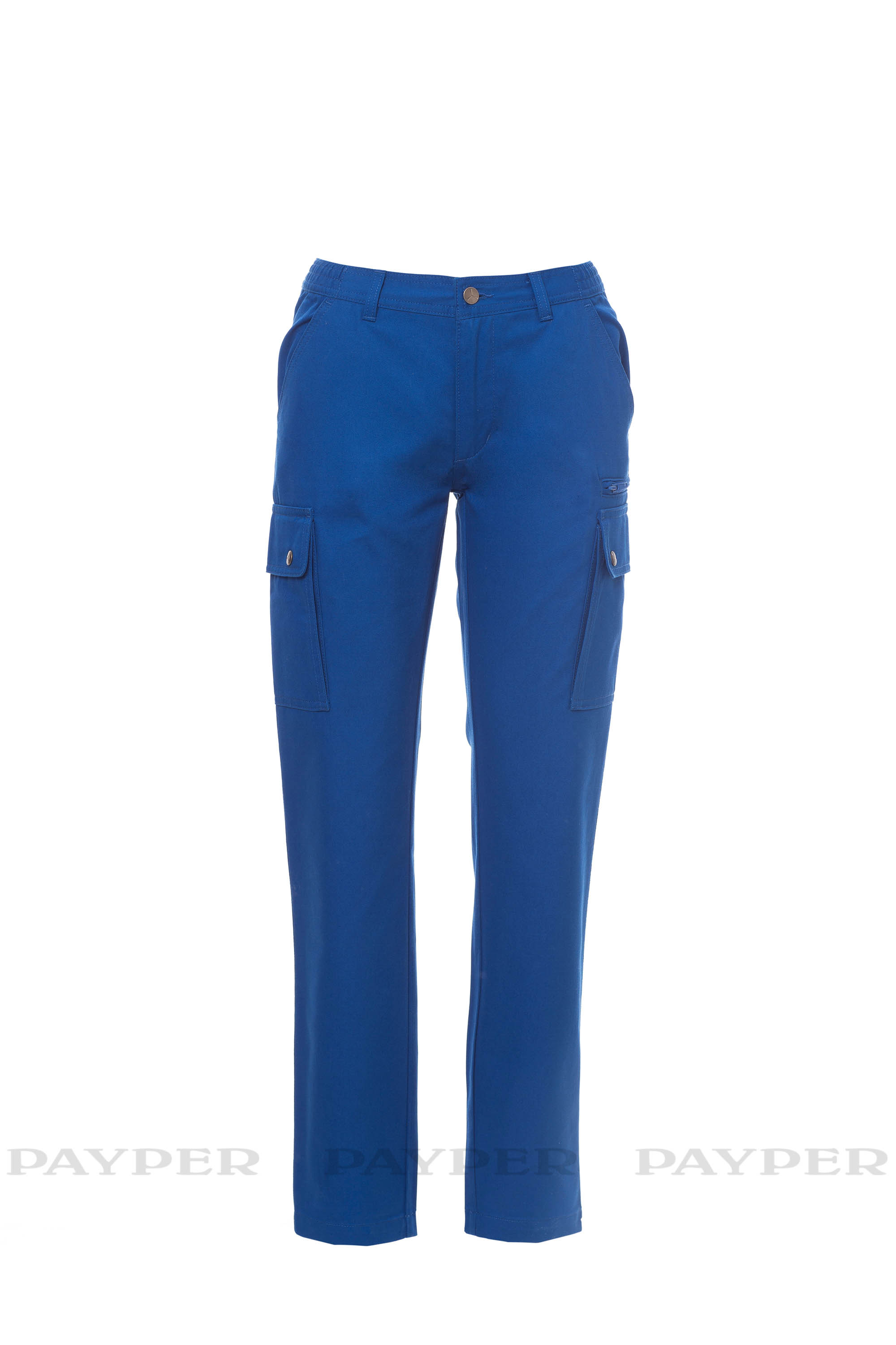 Pantalón clásico para mujer para todo el año con lateral elástico y trabillas en la cintura. Cierre con cremallera y botón metálico, dos bolsillos delanteros, dos bolsillos laterales con solapa y cierres a presión, un bolsillo con cremallera en la izquierda, un bolsillo plegable para la cinta métrica en la derecha, dos bolsillos traseros con botón y ojal.