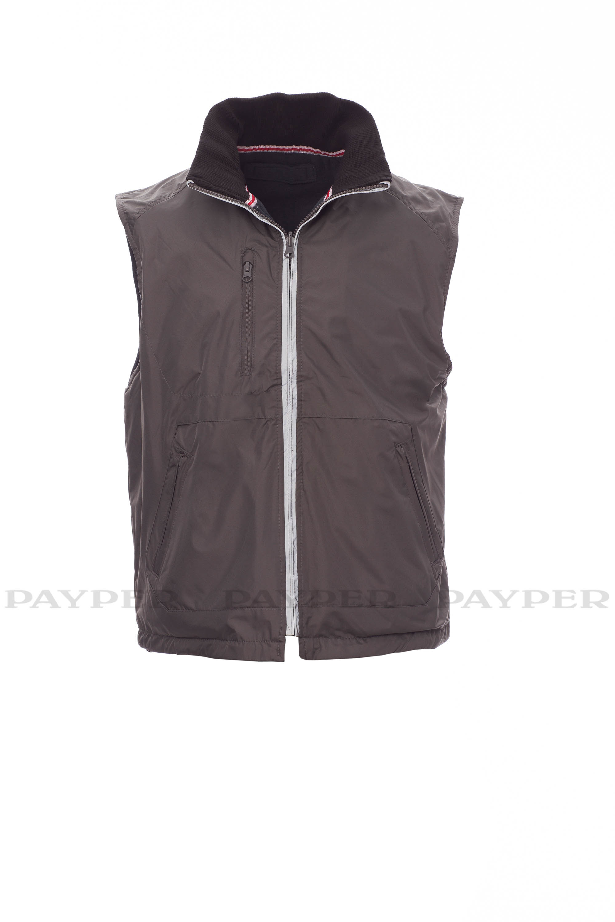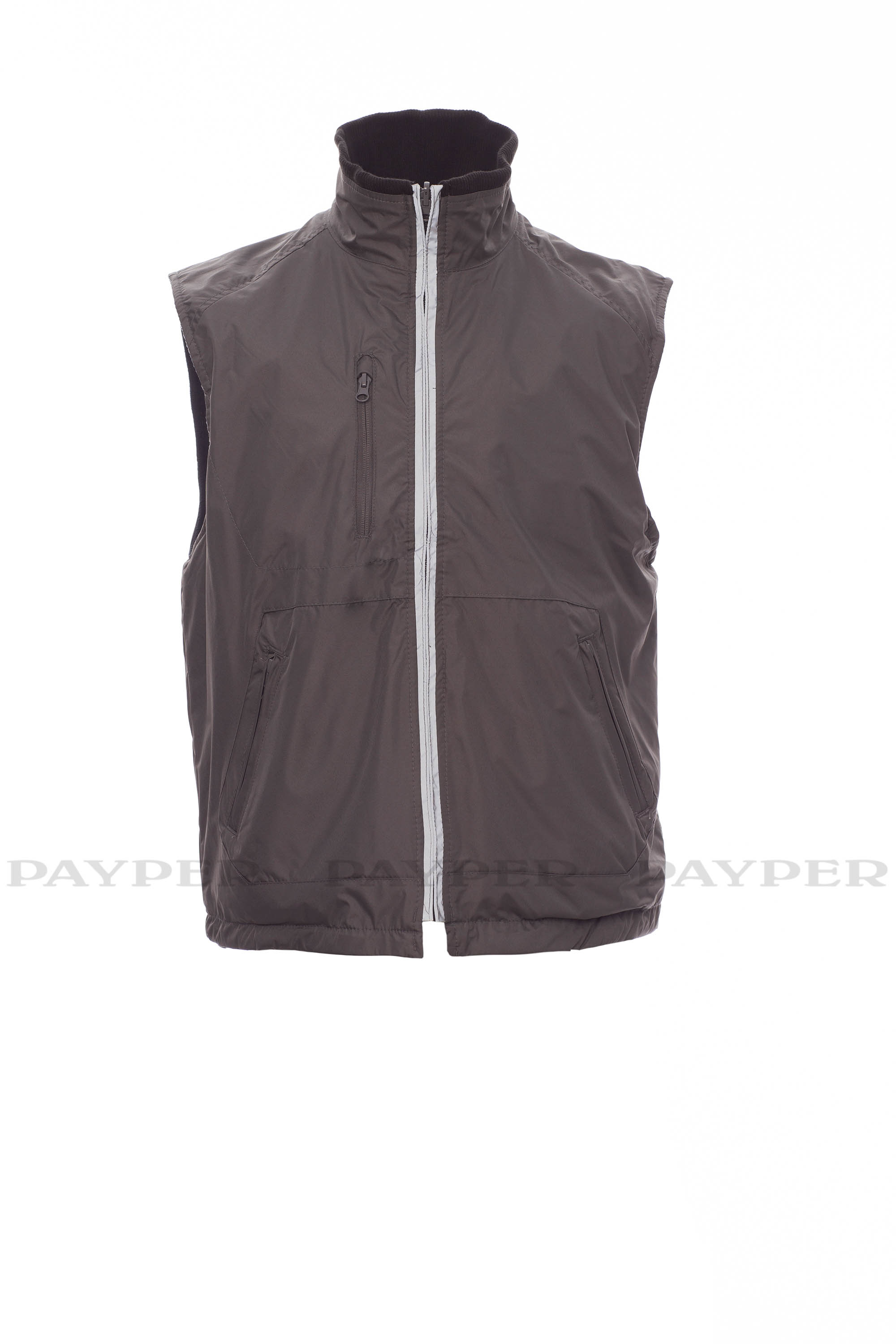 Chaleco unisex reversible, cremallera de plástico cubierta con ribete reflectante, cintura con cordón, tres bolsillos exteriores. Interior: forro polar, cuello en tejido RIB elástico, dos bolsillos y cremallera a la altura del pecho para facilitar la impresión y el bordado.