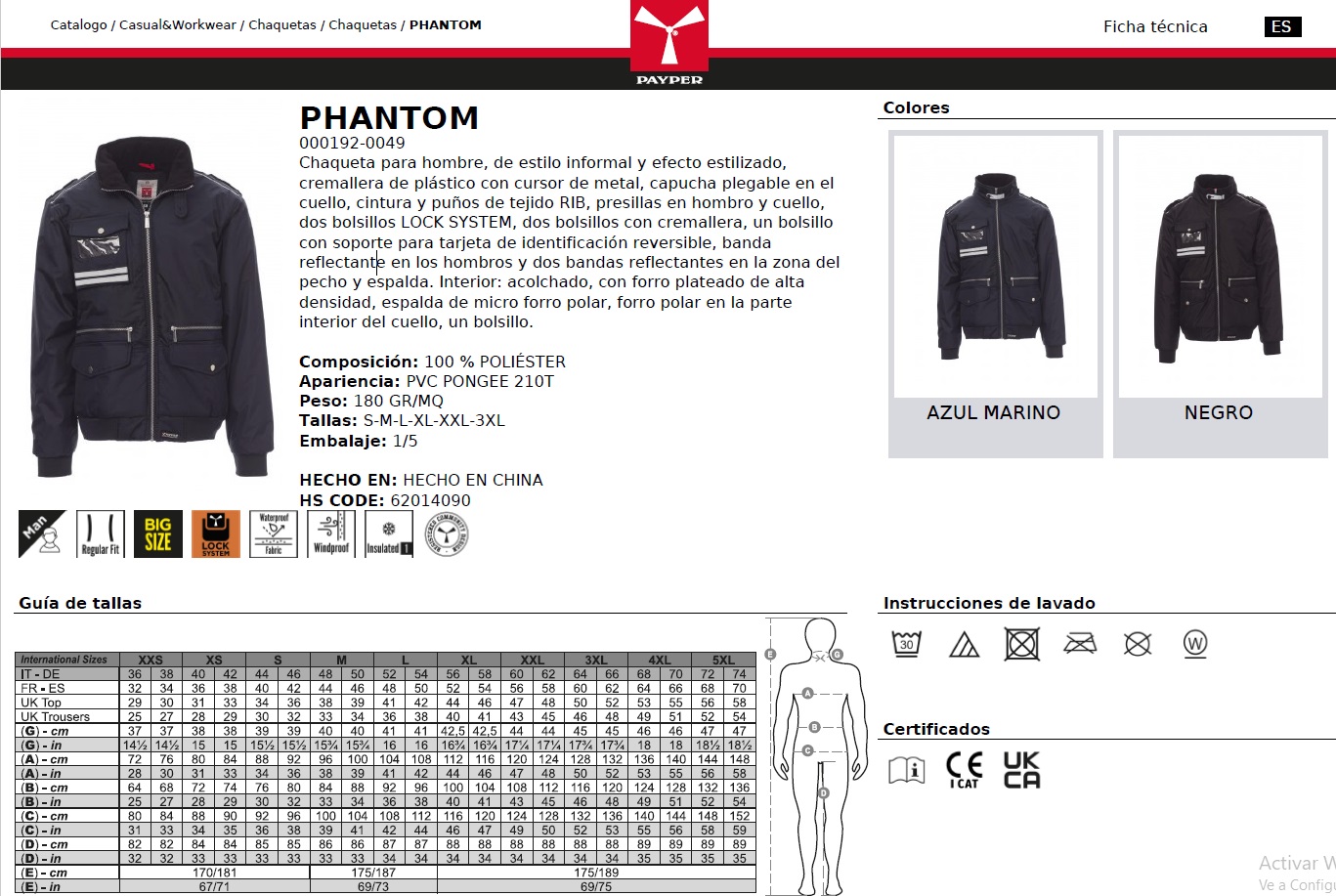 CHAQUETA PHANTOM · WATERPROOF · CORTAVIENTOS · INSULATED 1 · CAPUCHA PLEGABLE · CE I CAT