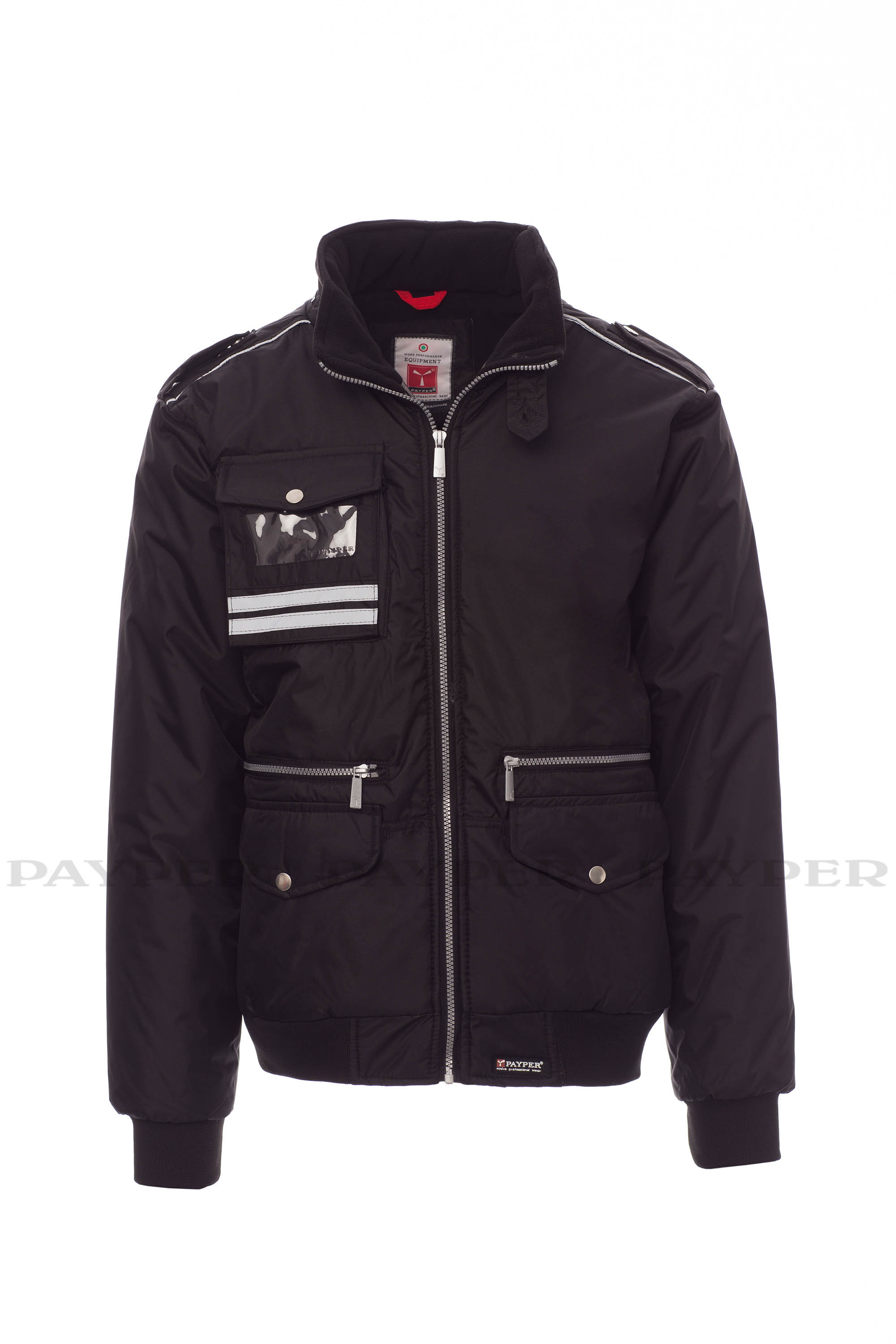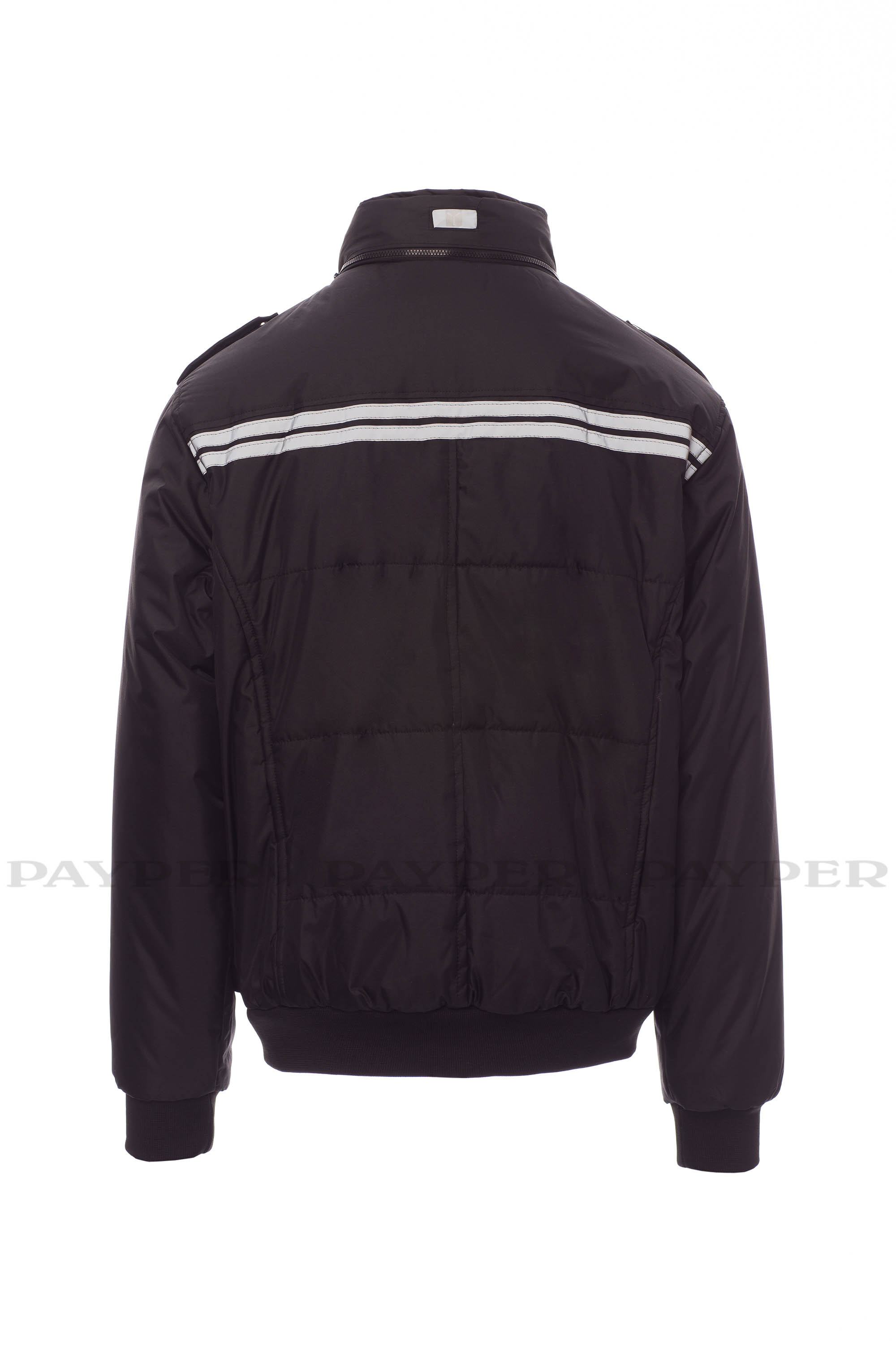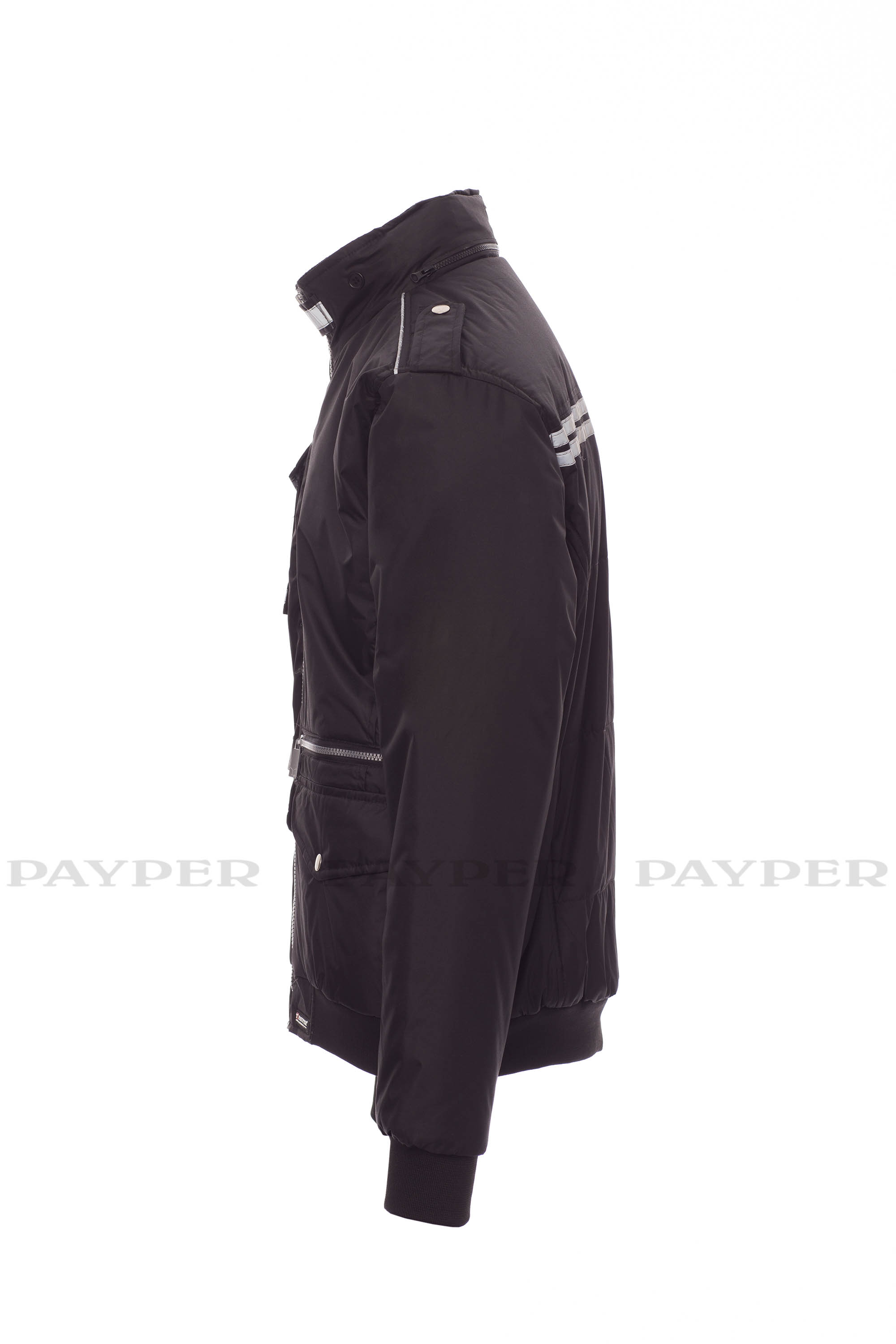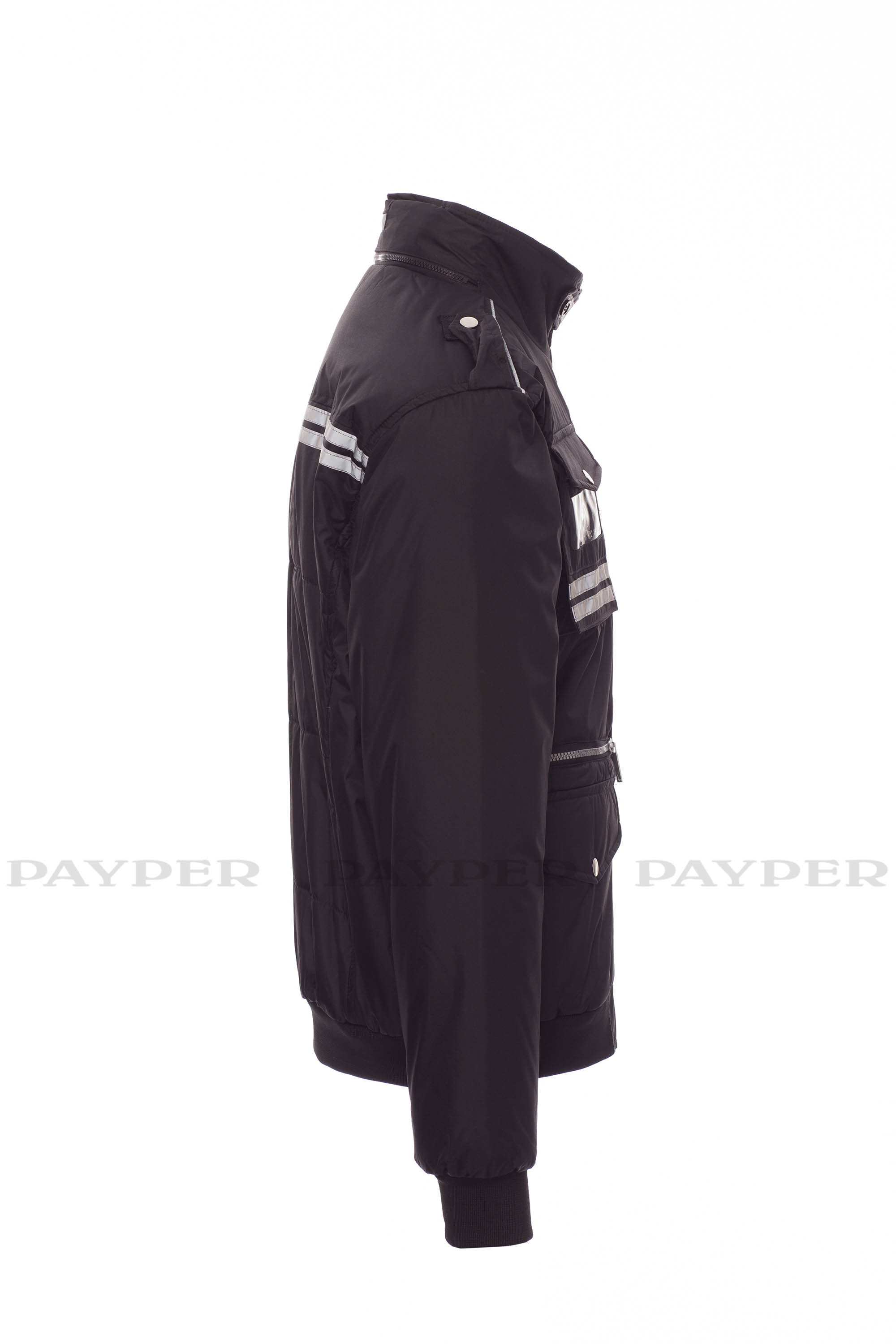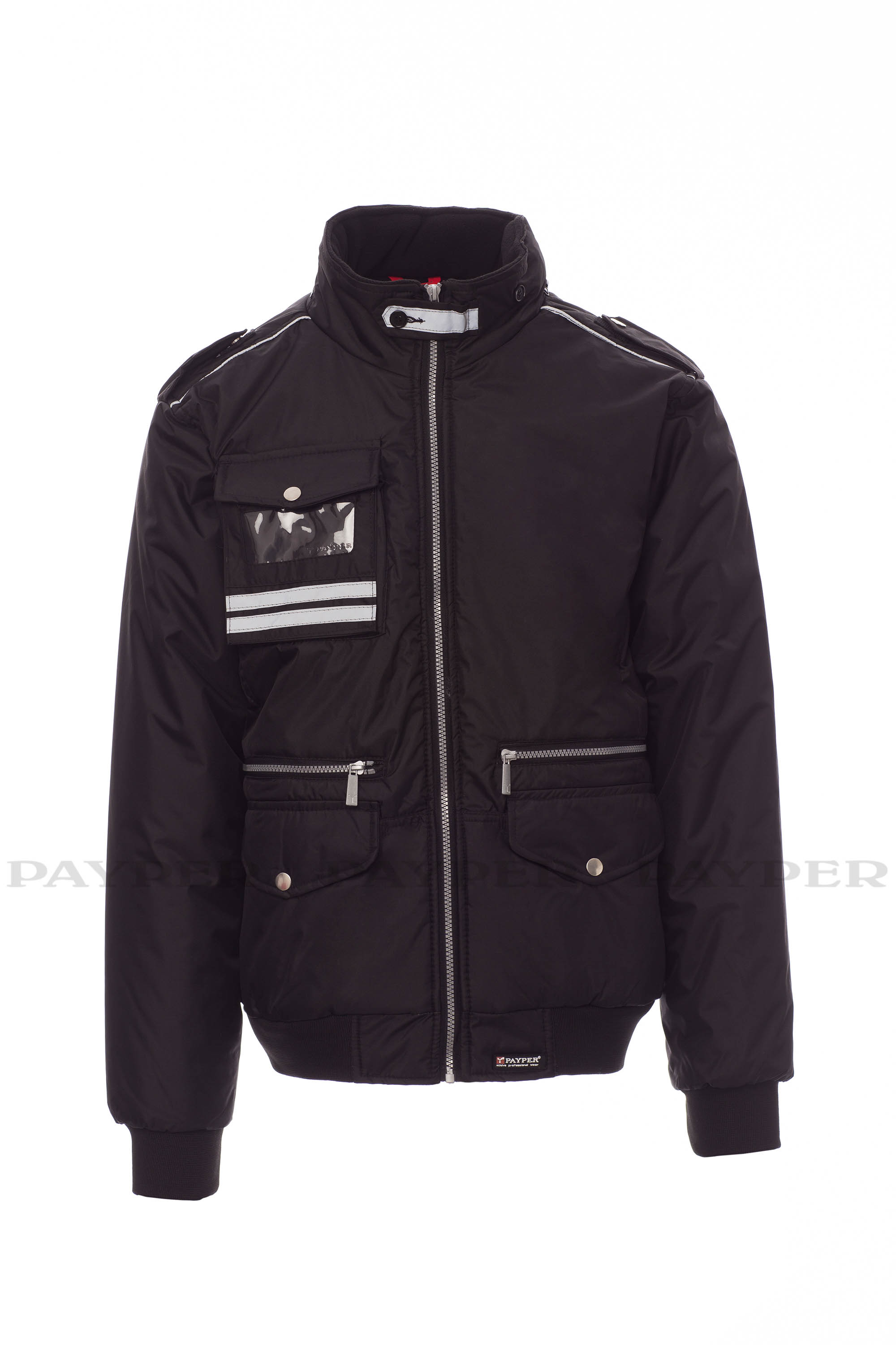 Chaqueta para hombre, de estilo informal y efecto estilizado, cremallera de plástico con cursor de metal, capucha plegable en el cuello, cintura y puños de tejido RIB, presillas en hombro y cuello, dos bolsillos LOCK SYSTEM, dos bolsillos con cremallera, un bolsillo con soporte para tarjeta de identificación reversible, banda reflectante en los hombros y dos bandas reflectantes en la zona del pecho y espalda. Interior: acolchado, con forro plateado de alta densidad, espalda de micro forro polar, forro polar en la parte interior del cuello, un bolsillo.