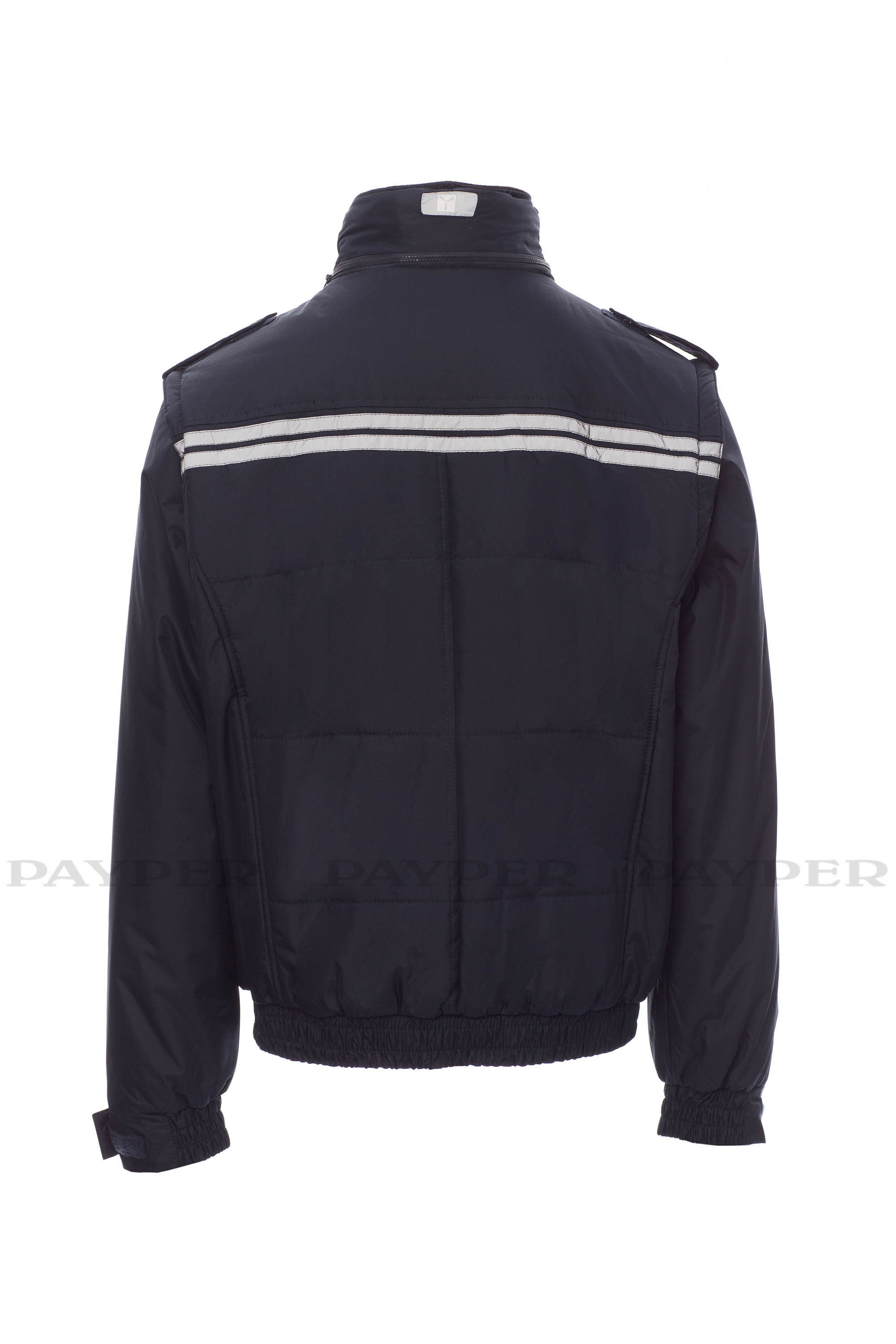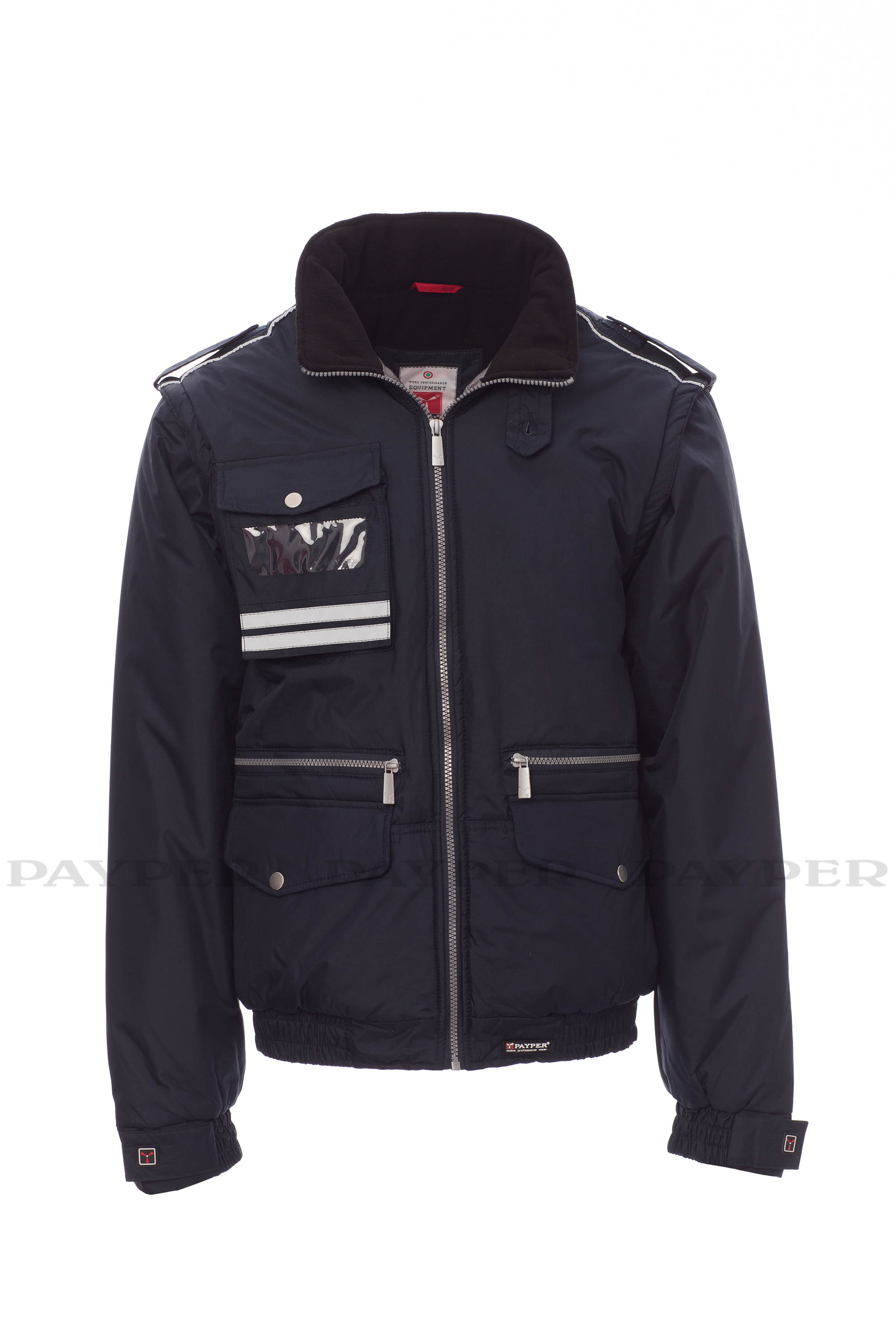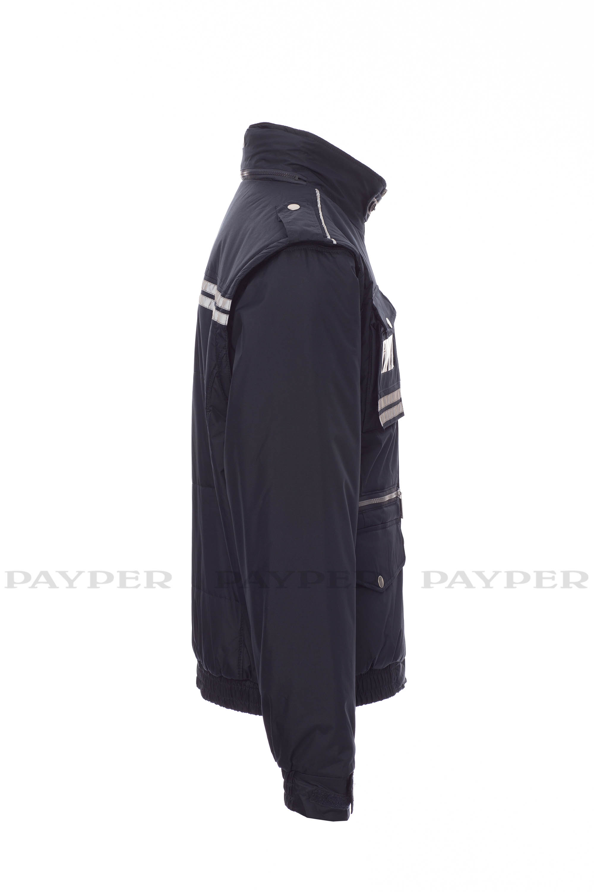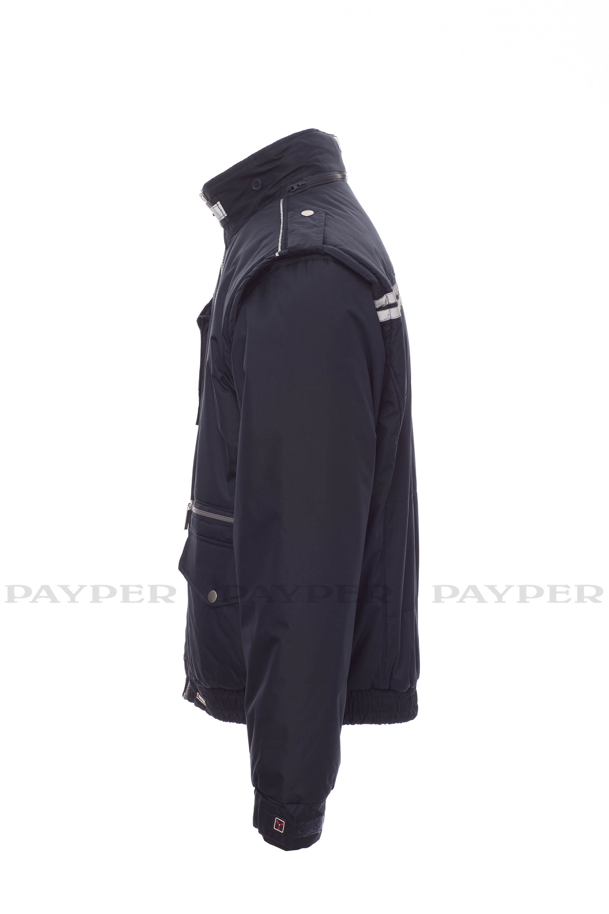 Chaqueta para hombre, de estilo informal y efecto estilizado, con mangas extraíbles, cremallera de plástico con cursor de metal, capucha plegable en el cuello, cintura elástica y puños ajustables, presillas en hombro y cuello, dos bolsillos LOCK SYSTEM, dos bolsillos con cremallera, un bolsillo con soporte para tarjeta de identificación reversible, banda reflectante en los hombros y dos bandas reflectantes en la zona del pecho y espalda. Interior: acolchado, con forro plateado de alta densidad, espalda de micro forro polar, forro polar en la parte interior del cuello, un bolsillo.