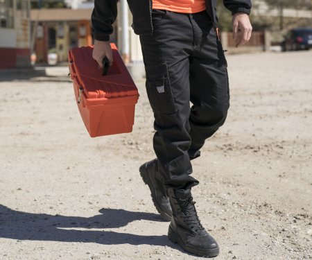 Pantalón unisex para todo el año con lateral elástico y trabillas en la cintura. Cierre con cremallera y botón metálico, tres bolsillos delanteros estilo vaquero, un bolsillo lateral LOCK SYSTEM y un bolsillo con cremallera, un bolsillo multifunción, dos bolsillos traseros, uno abierto y otro con solapa y velcro. Inserciones de contraste, bandas reflectantes en el bolsillo trasero.