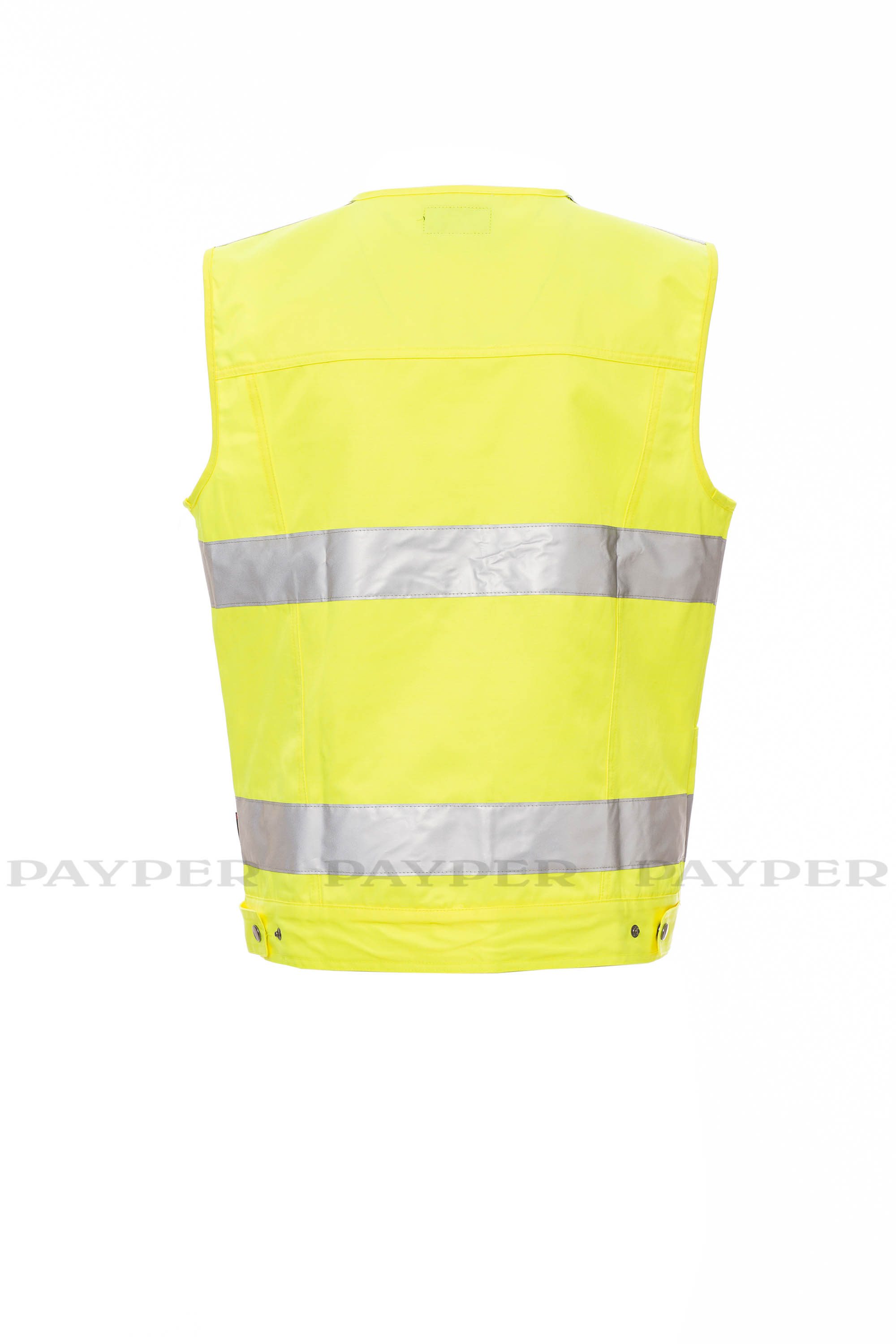 Chaleco de alta visibilidad con bandas 3M, cierre delantero con cremallera cubierta, ajuste con botones en la cintura, dos bolsillos LOCK SYSTEM delanteros modelo canguro con botón metálico, dos bolsillos a la altura del pecho, multifunción, soporte para tarjeta de identificación extraíble y plegable, modelo de corte tipo vaquero.