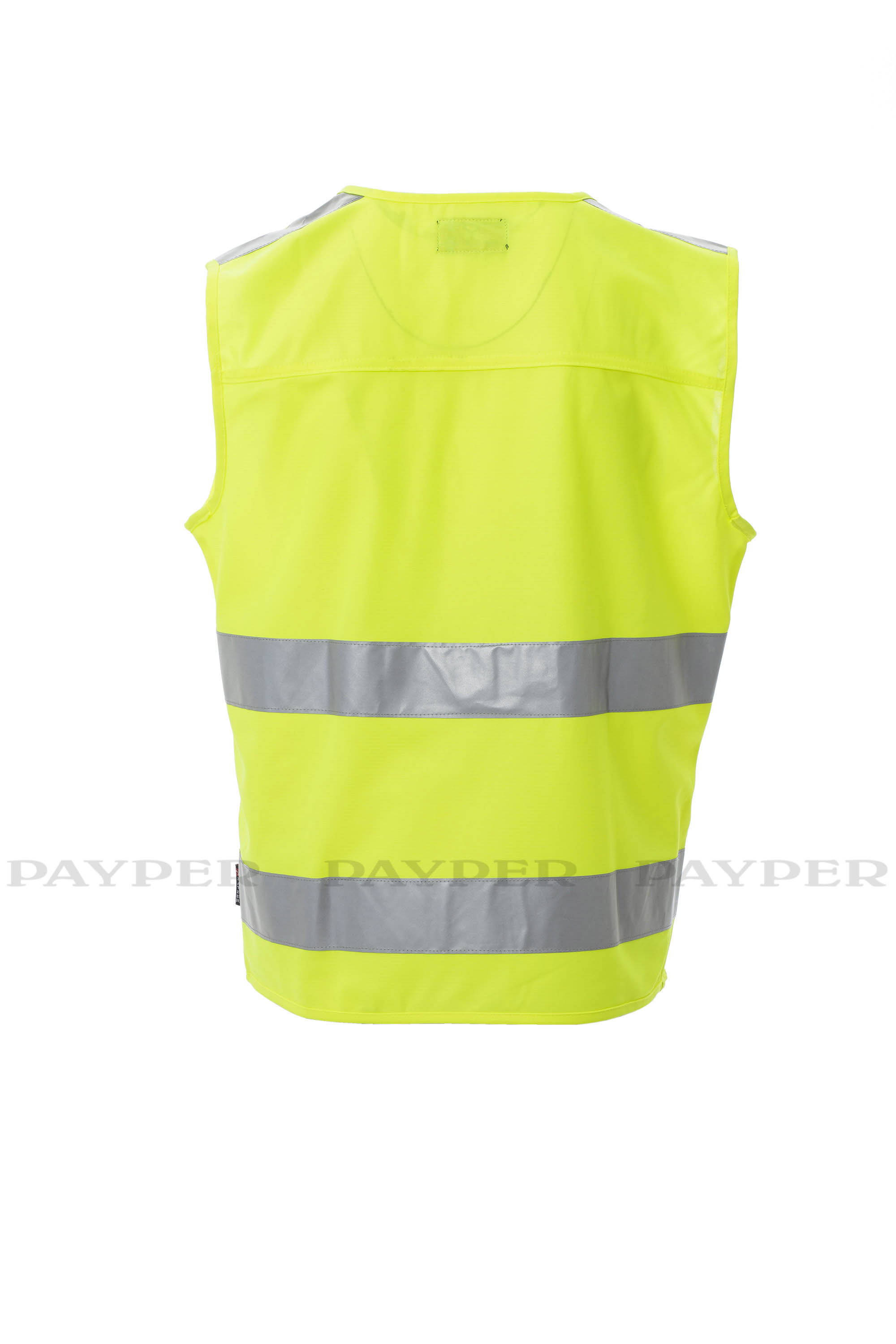 Chaleco de alta visibilidad con bandas 3M, cierre delantero con cremallera oculta, dos bolsillos delanteros canguro LOCK SYSTEM, soporte para insignia de identificación plegable y extraíble, un bolsillo a la altura del pecho con cremallera.
