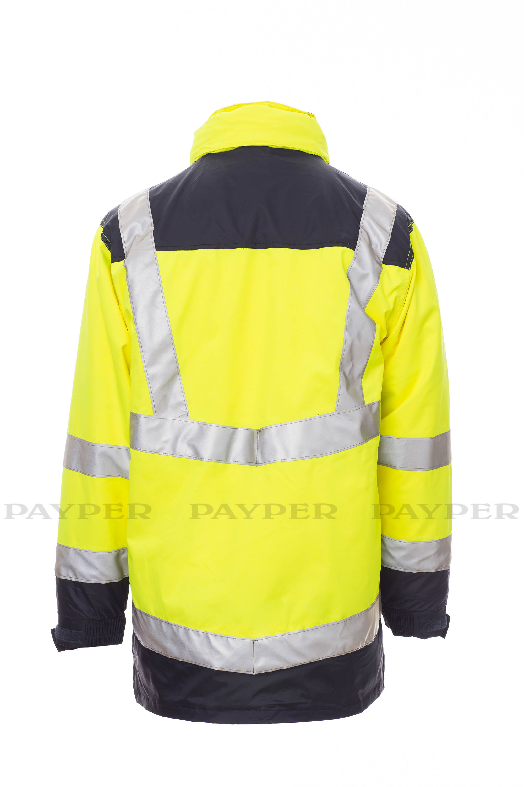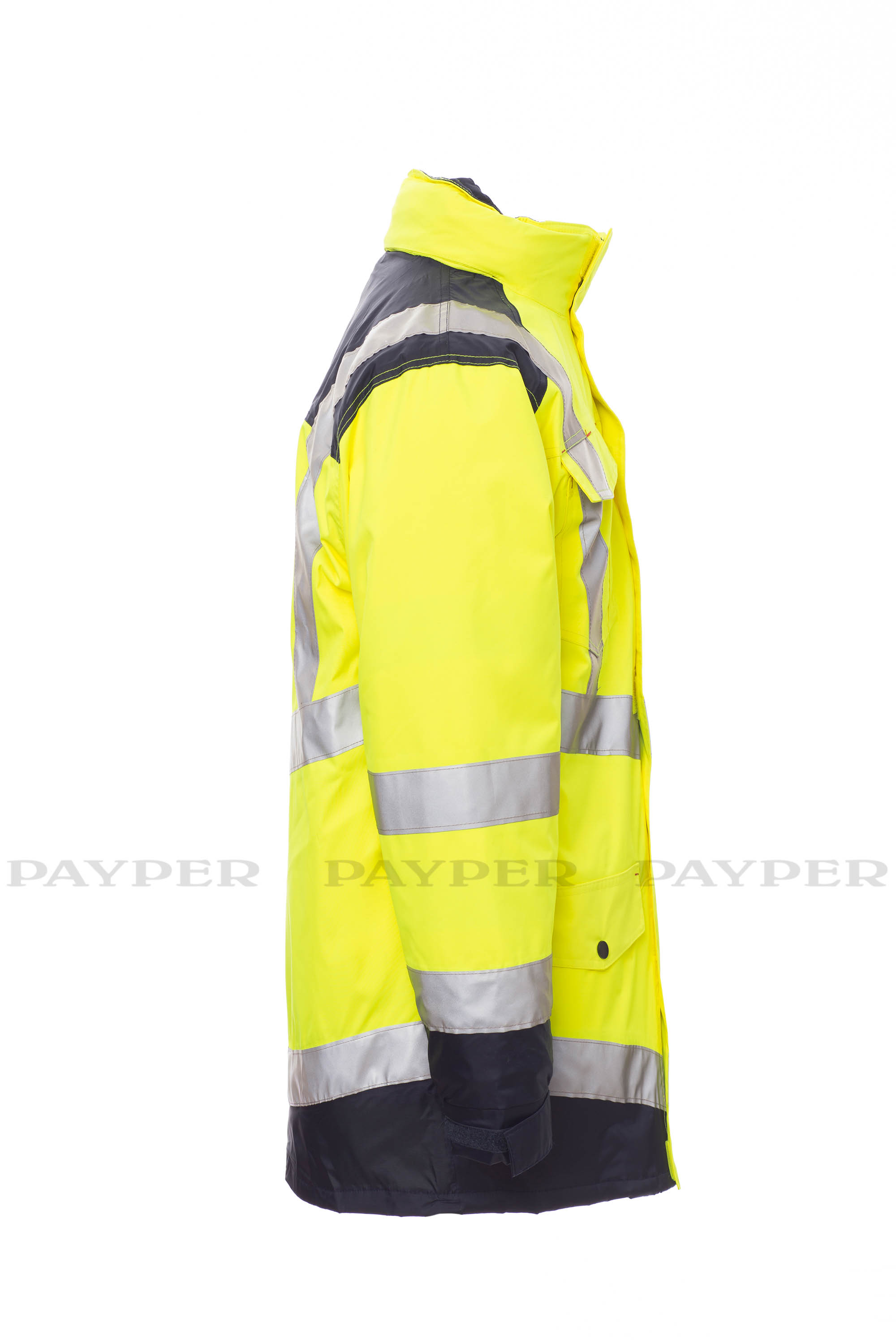 Parka bicolor 4 en 1 de alta visibilidad con bandas reflectantes. Chaqueta exterior sin forro, apertura con cremallera de plástico con tirador de metal cubierta con tapeta y velcro, capucha extraíble y/o plegable en el cuello ajustada con cordón, puños elásticos ajustables. 4 bolsillos frontales: bolsillo a la altura del pecho izquierdo con velcro, soporte para bolígrafos y para tarjeta de identificación escamoteable, bolsillo a la altura del corazón con cremallera; 2 bolsillos inferiores con cremallera y botón a presión y apertura lateral. Costuras termoselladas. Chaqueta interior desmontable acolchada con mangas extraíbles, cremallera de plástico con tirador de metal, puños elásticos. 4 bolsillos frontales: bolsillo a la altura del pecho izquierdo con velcro, soporte para bolígrafos y para tarjeta de identificación escamoteable, bolsillo a la altura del corazón con cremallera; 2 bolsillos inferiores con velcro. En ambas: cuello y hombros de micro forro polar, cremallera para facilitar la impresión y el bordado, dos bandas en tórax, hombros y mangas.