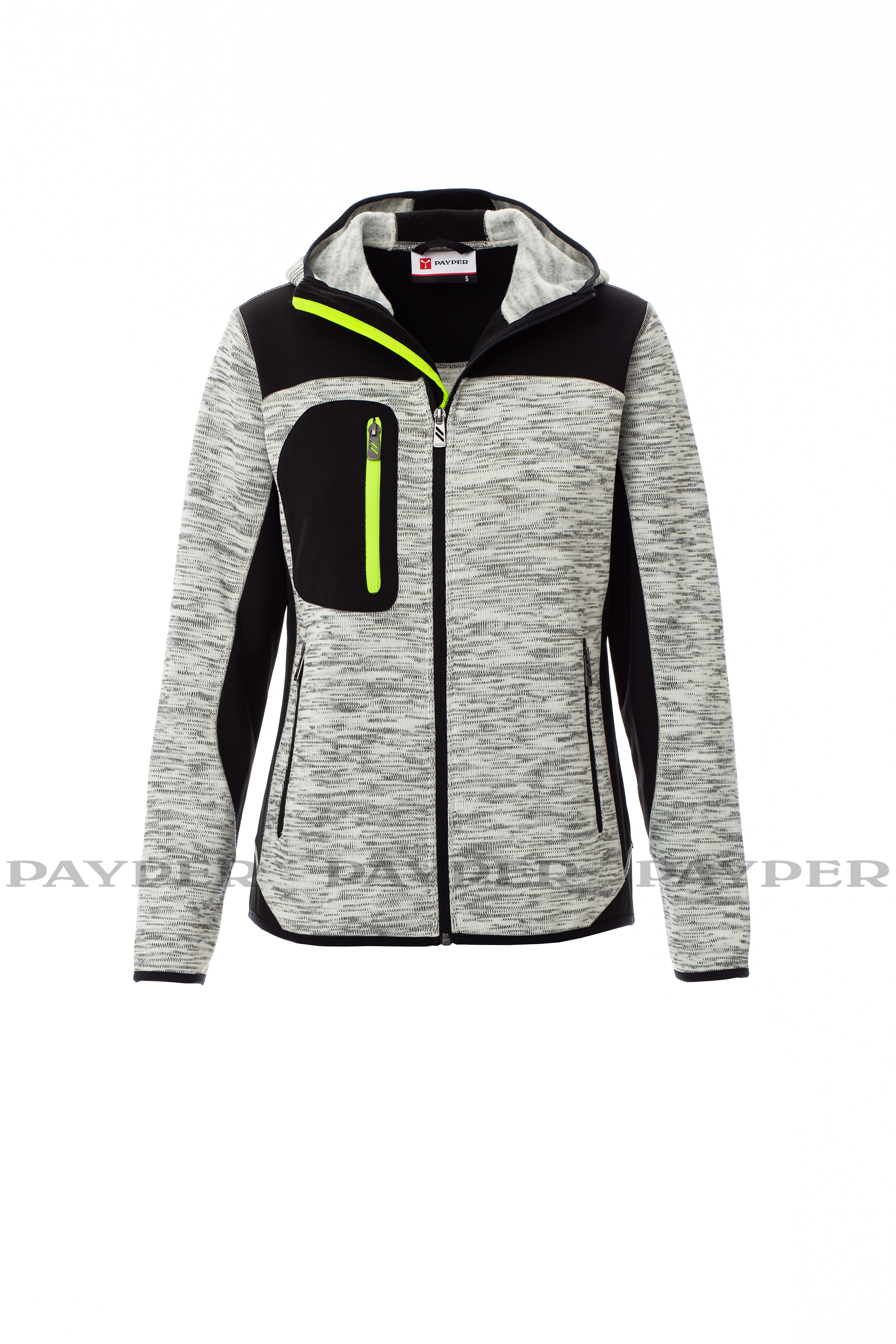 Chaqueta entallada para mujer, cremallera SBS larga con cinta, capucha con doble costura, fino ribeteado en puños y dobladillo, dos bolsillos laterales con cremallera, un bolsillo a la altura del pecho. Detalle con inserciones en tejido softshell negro.