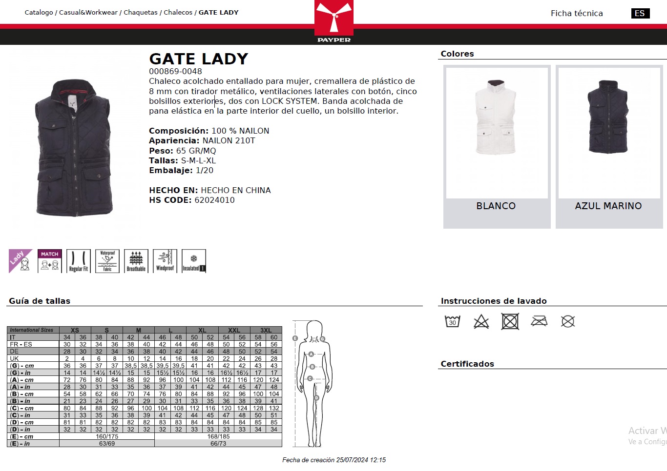 CHALECO GATE LADY · WATERPROOF · CORTAVIENTOS · INSULATED 1 · 100% NAILON