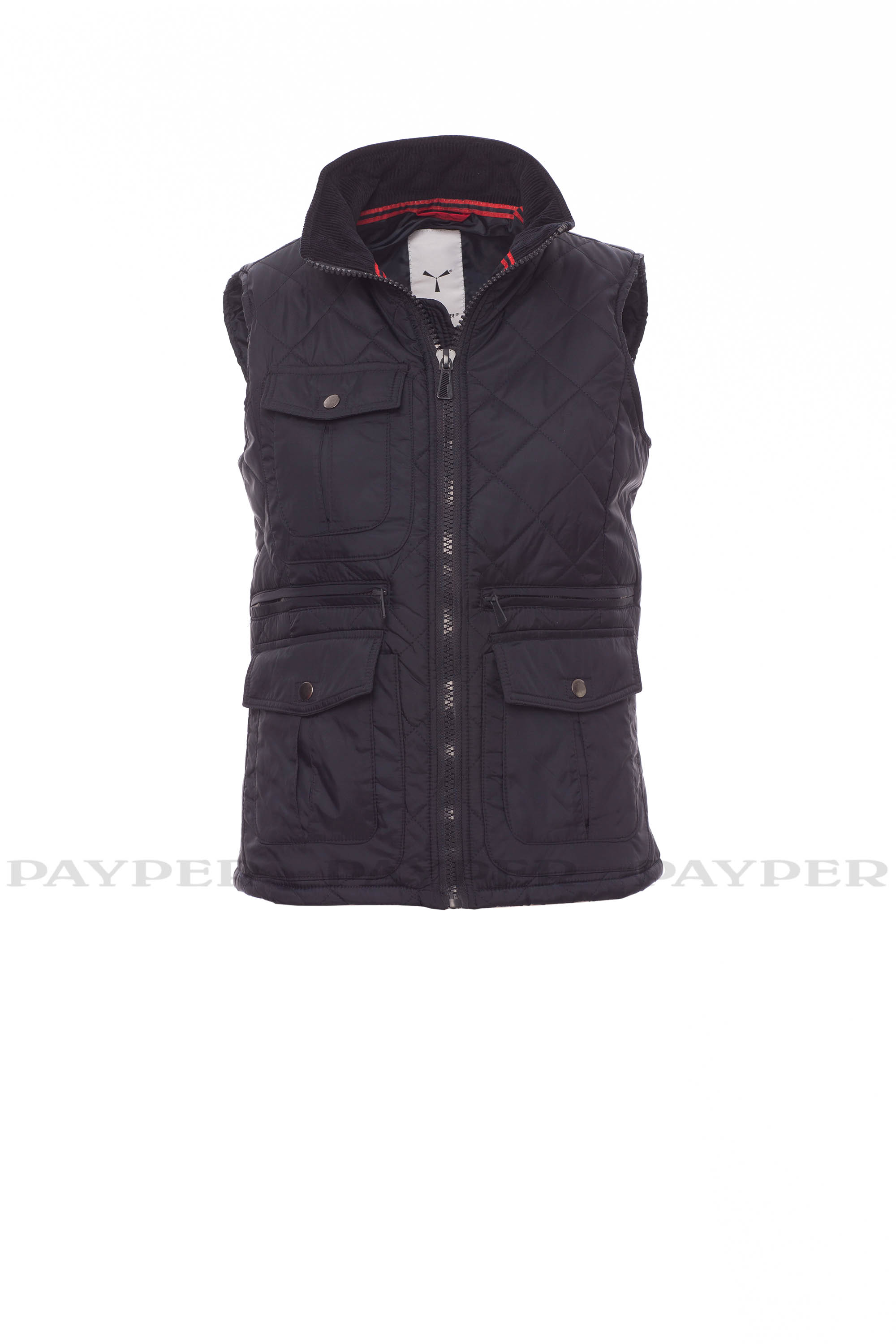 Chaleco acolchado entallado para mujer, cremallera de plástico de 8 mm con tirador metálico, ventilaciones laterales con botón, cinco bolsillos exteriores, dos con LOCK SYSTEM. Banda acolchada de pana elástica en la parte interior del cuello, un bolsillo interior.