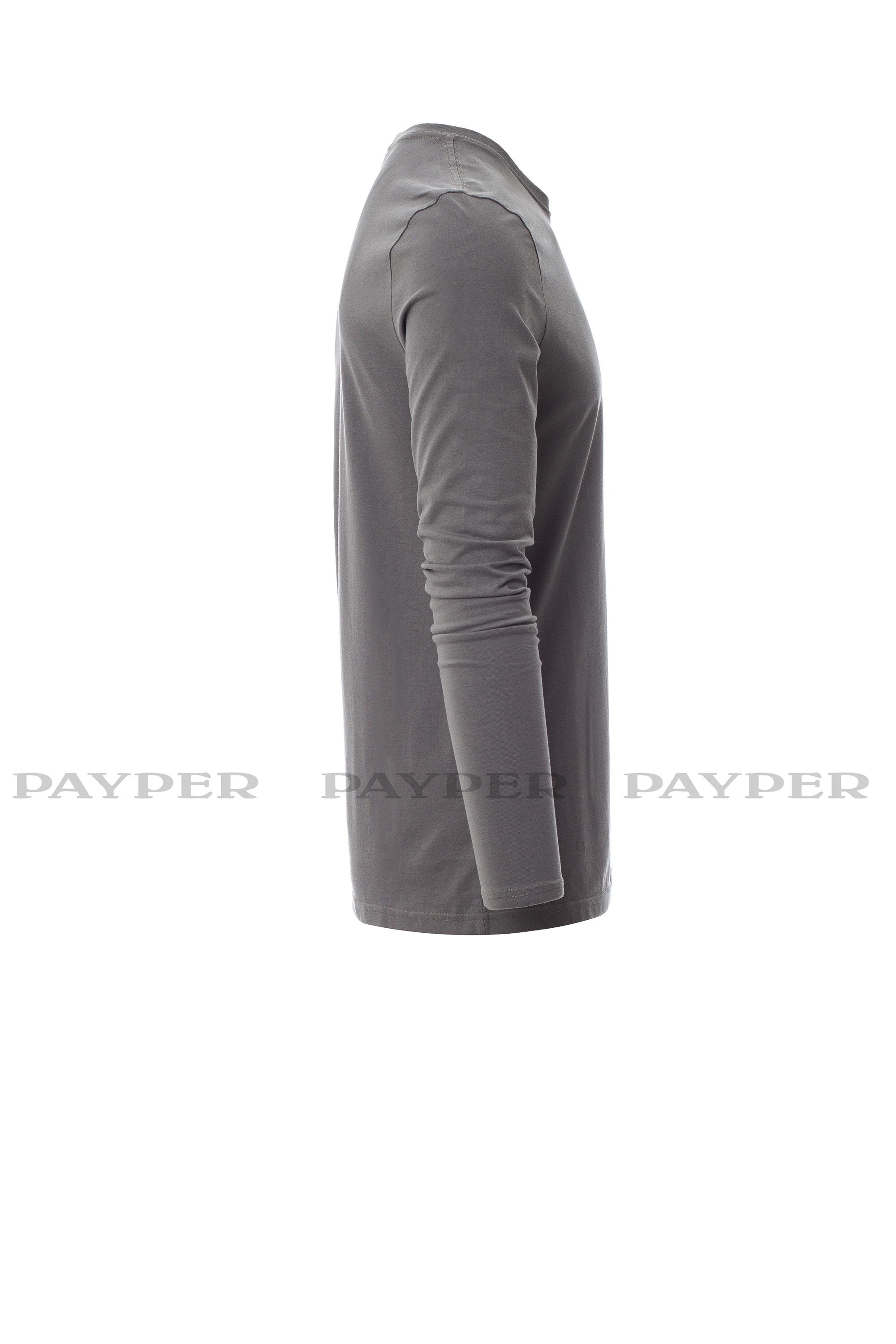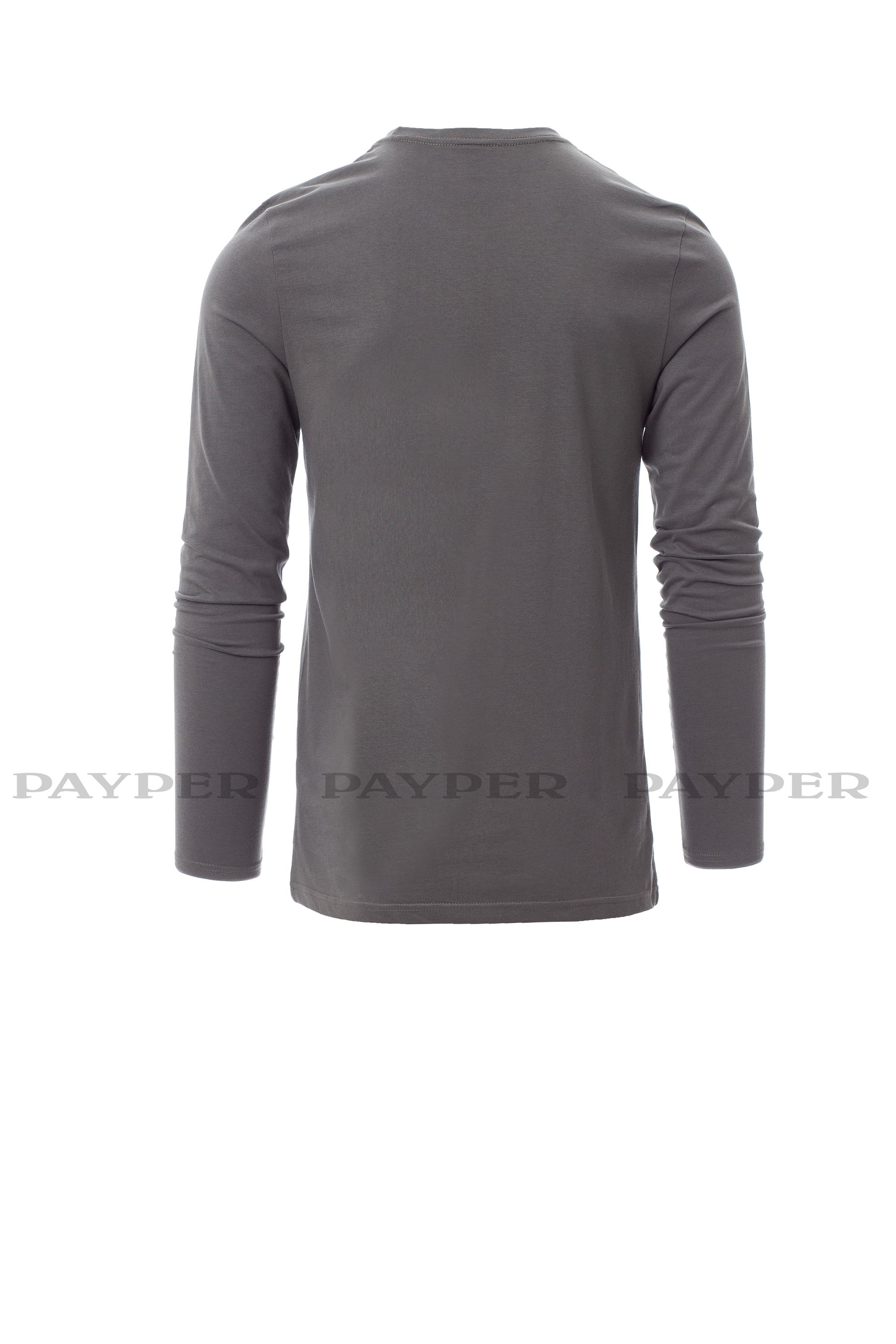 Camiseta de manga larga y cuello redondo para hombre, con banda elástica en cuello de elastano de 1,5 cm con pespunte superior en la parte delantera, cinta de refuerzo de contraste de hombro a hombro visible en la parte interior del cuello, costuras elásticas, costuras laterales