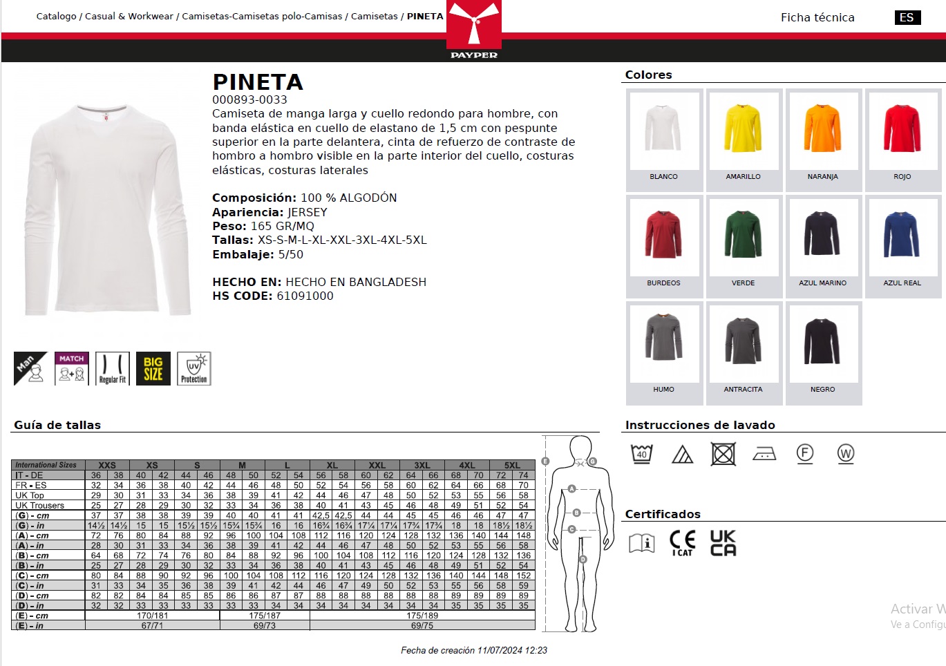 CAMISETA PINETA · ML · 100% ALGODON · CE I CAT · PROTECCION SOLAR >50