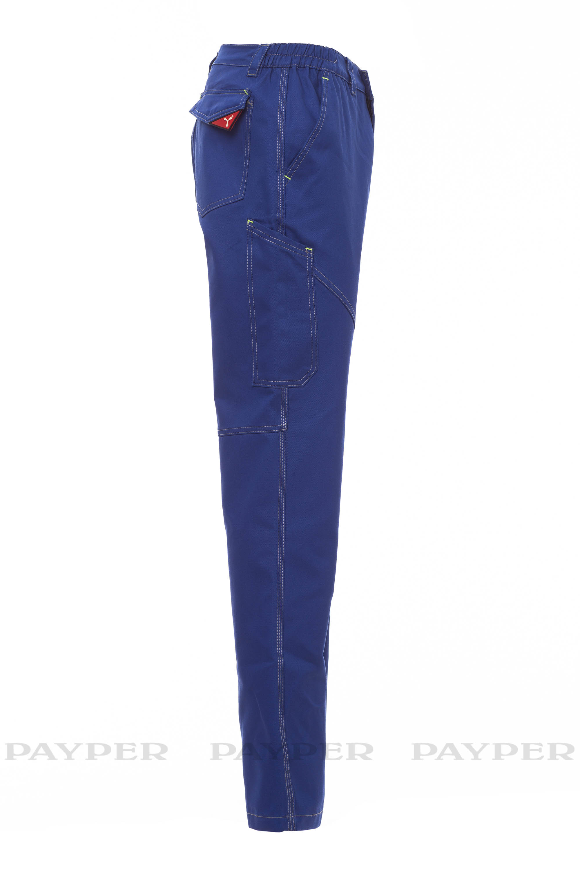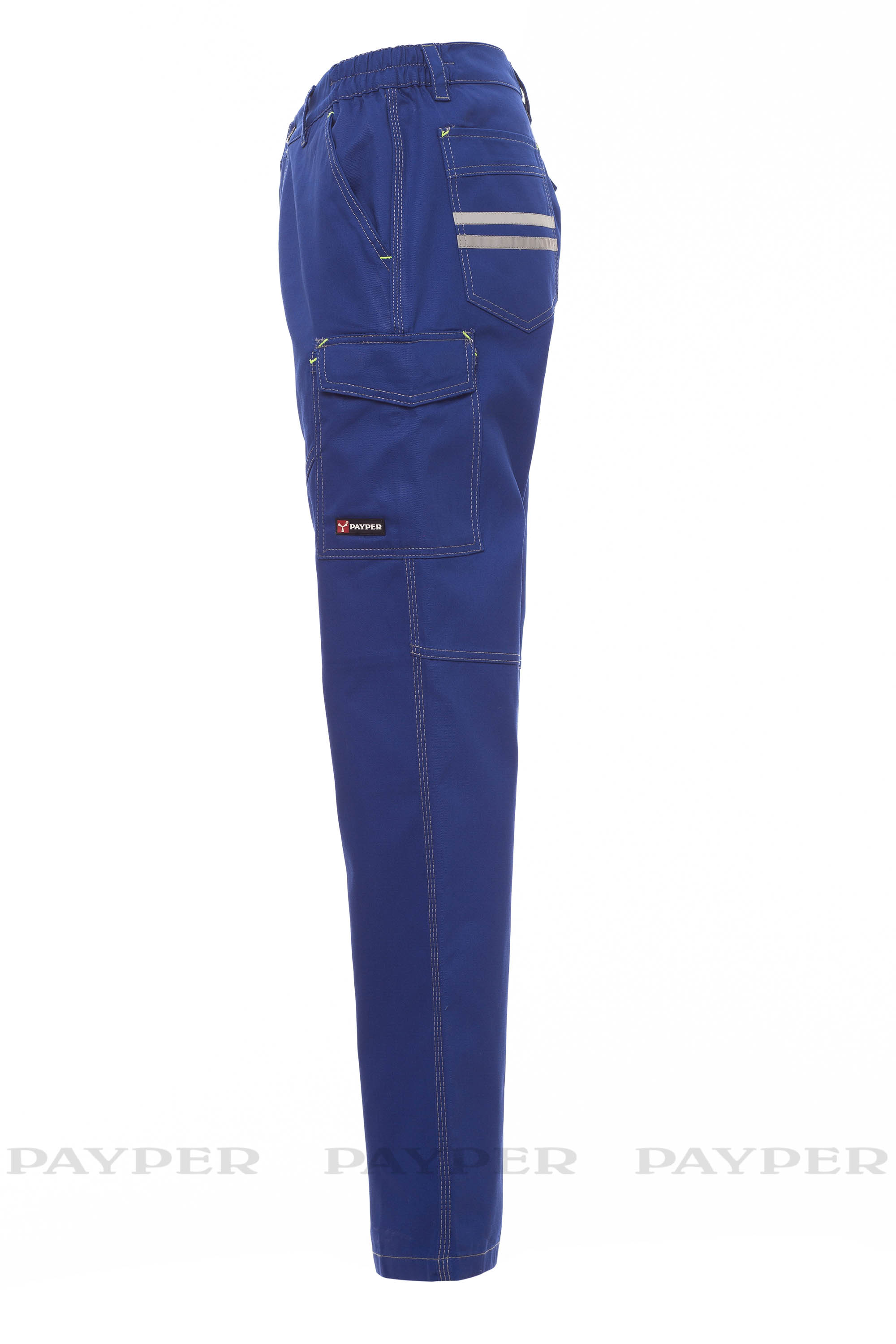 Pantalón unisex, multiestación, con elásticos laterales y trabillas en la cintura, cierre con cremallera y botón de plástico, dos bolsillos delanteros de corte clásico, un bolsillo lateral con LOCK SYSTEM, un soporte para metro; dos bolsillos traseros, uno con tapeta y velcro y otro abierto, aplicaciones y pespuntes en contraste, bandas reflectantes en el bolsillo trasero, costura triple. Botón con remache para el color blanco. Pespuntes y costuras a juego, con presillas en contraste de color amarillo fluorescente para el color Azul marino total.