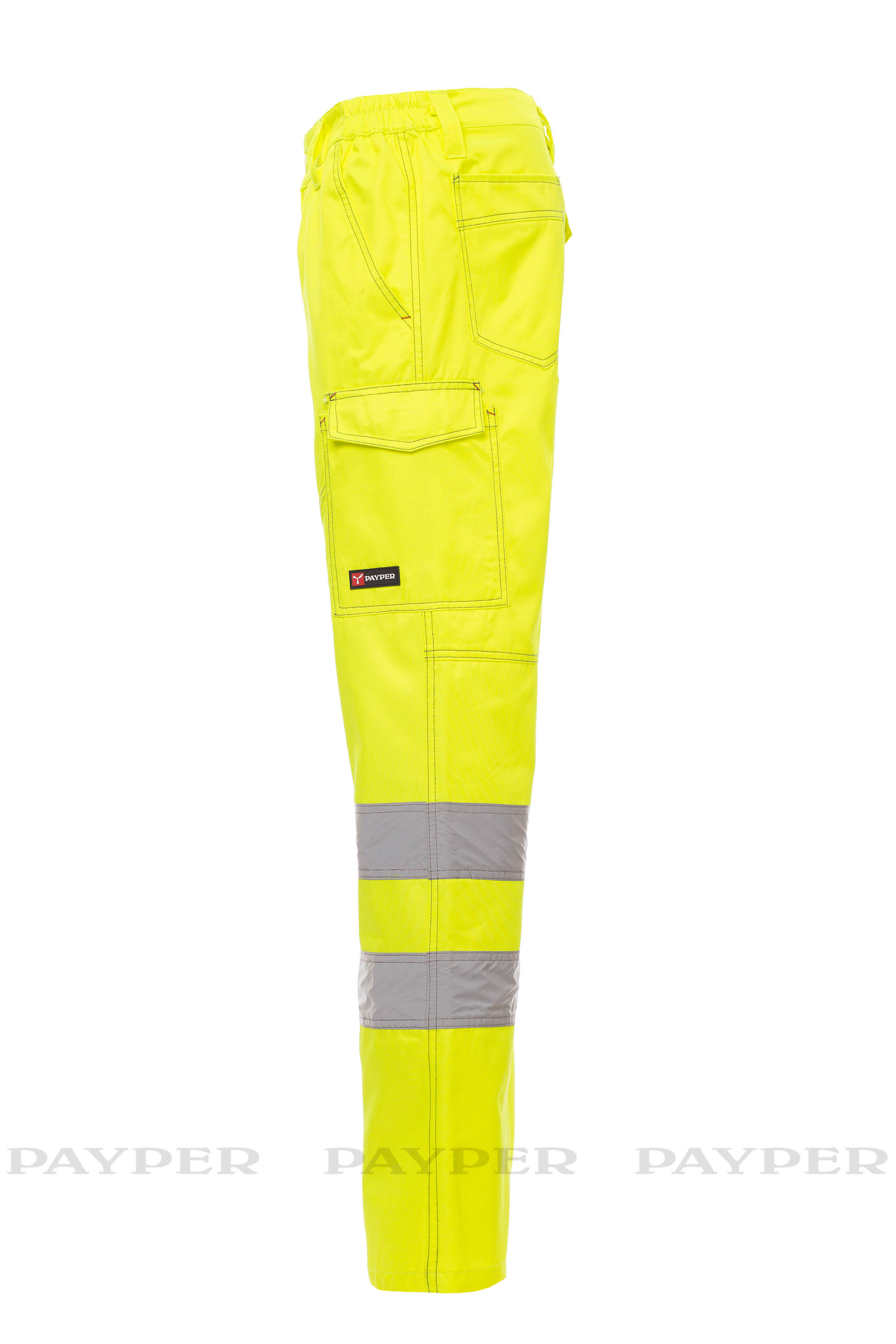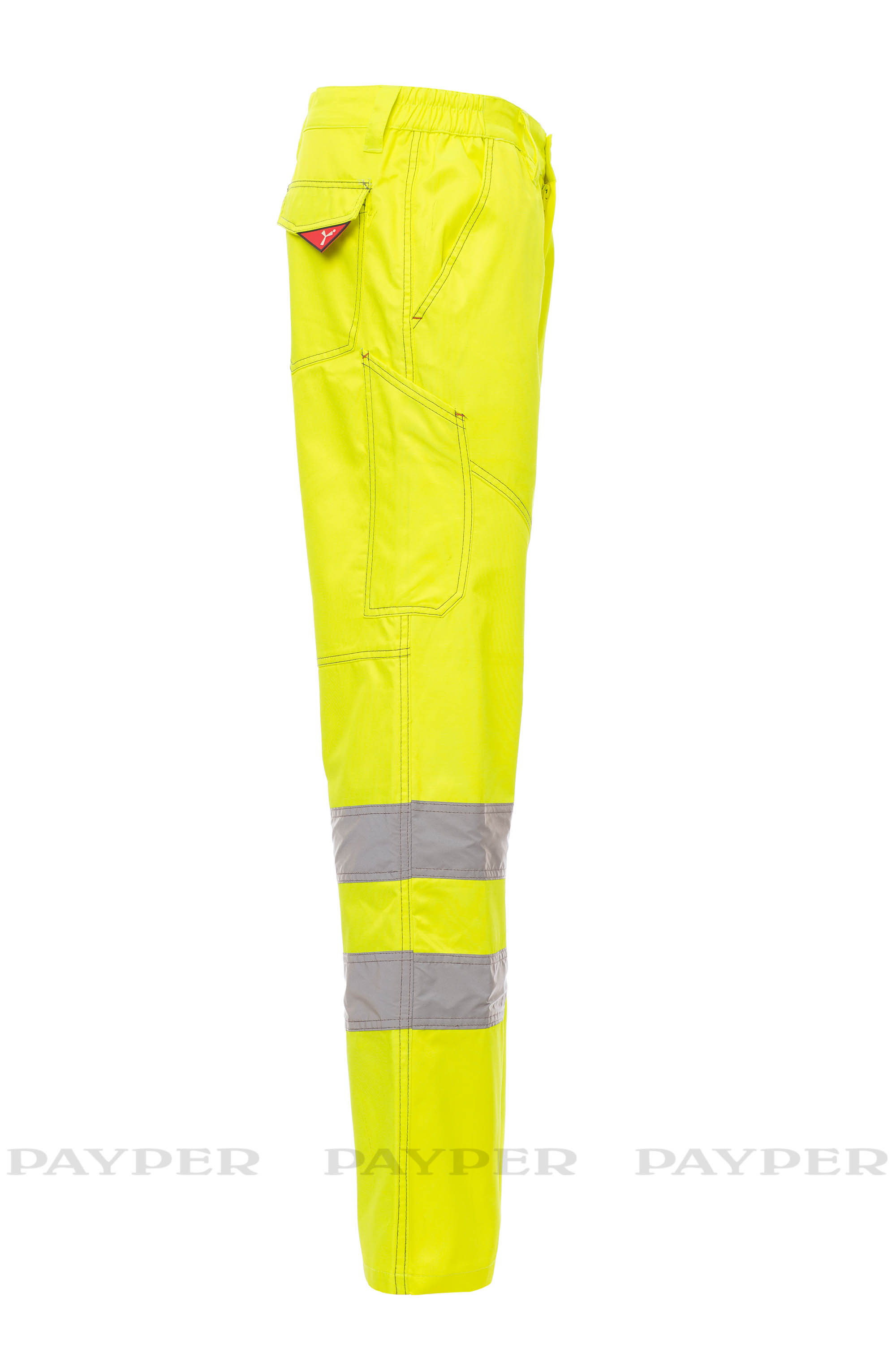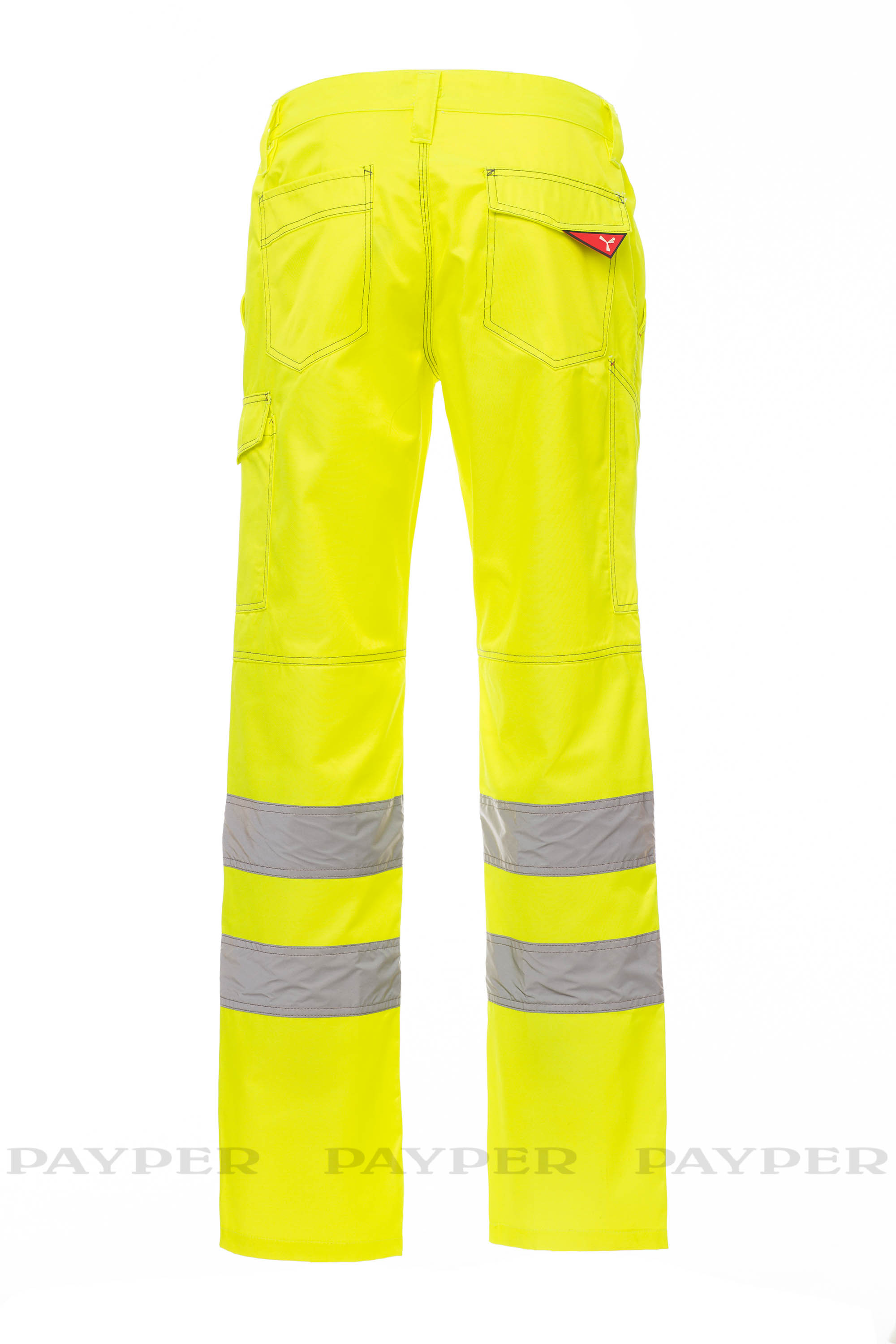Pantalón de alta visibilidad para todo el año para hombre con bandas reflectantes, lateral elástico y trabillas en la cintura. Cierre con cremallera y botón de plástico, dos bolsillos delanteros clásicos, un bolsillo lateral LOCK SYSTEM, un bolsillo para cinta métrica, dos bolsillos traseros, uno abierto y otro con solapa y velcro. Pespunte de contraste, triple costura en entrepierna y parte interior de la pernera.