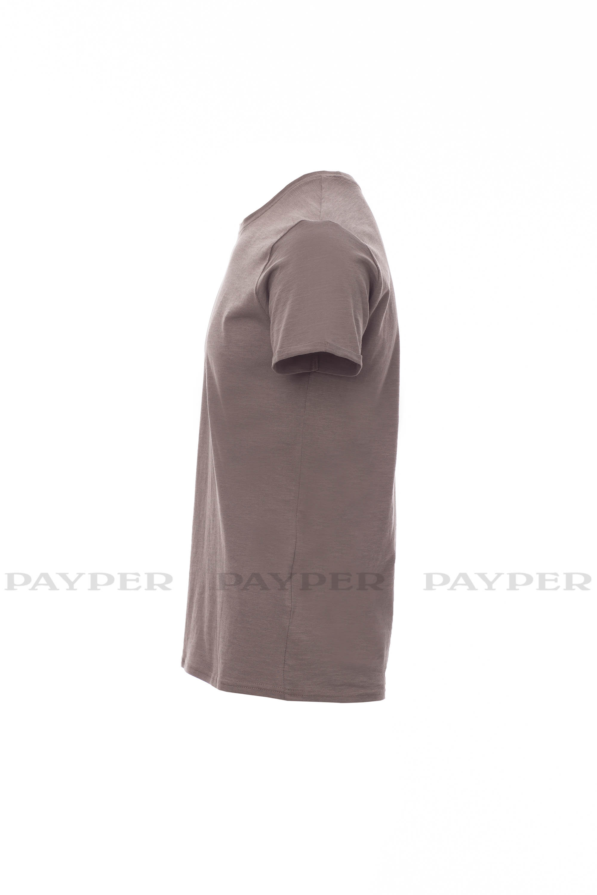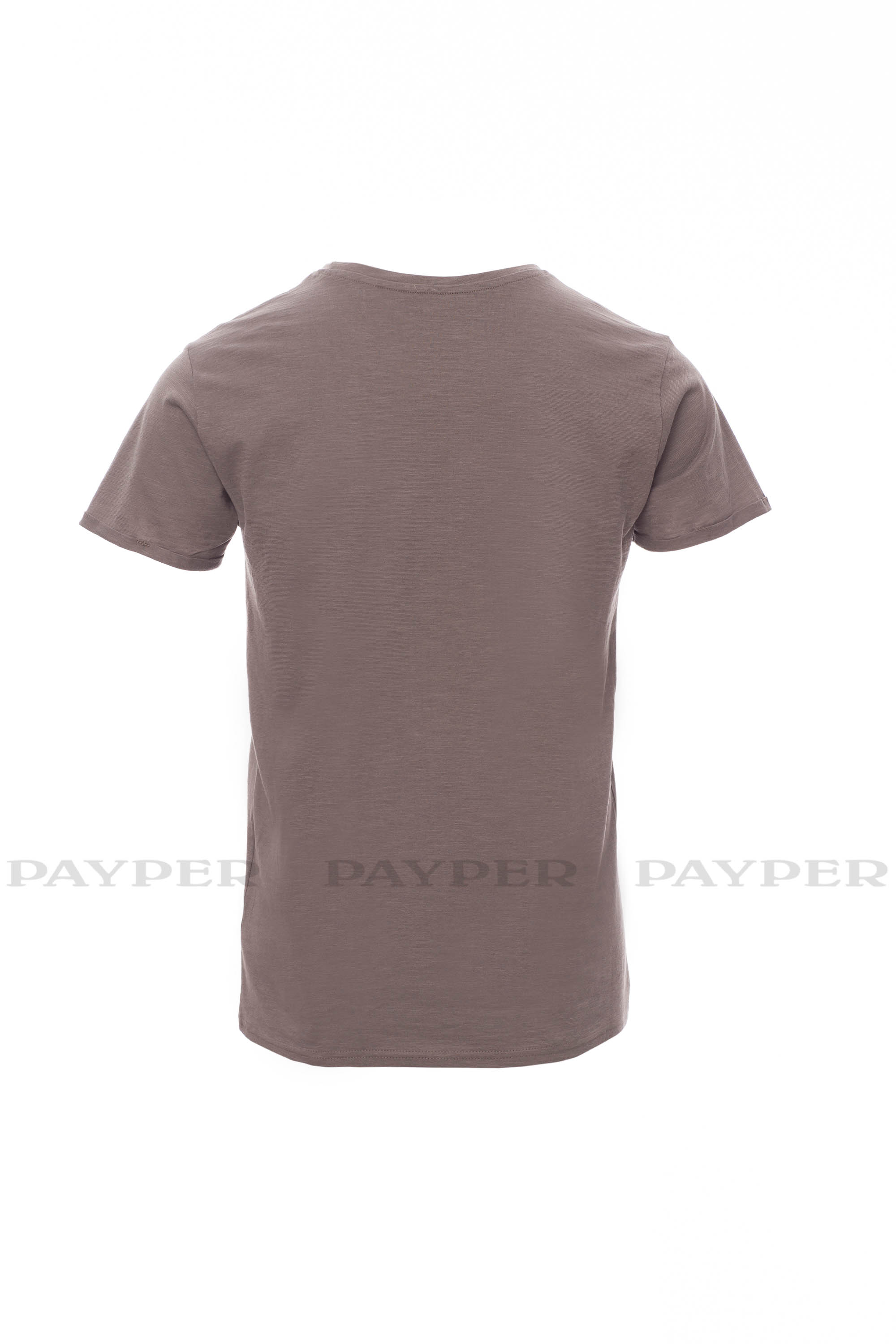Camiseta de manga corta para hombre con cuello ligeramente redondo, cuello bajo de 1 cm de elastano, hombros ajustados con doble costura en la parte interior, mangas con acabado rústico y con vuelta, costuras laterales, sin etiqueta