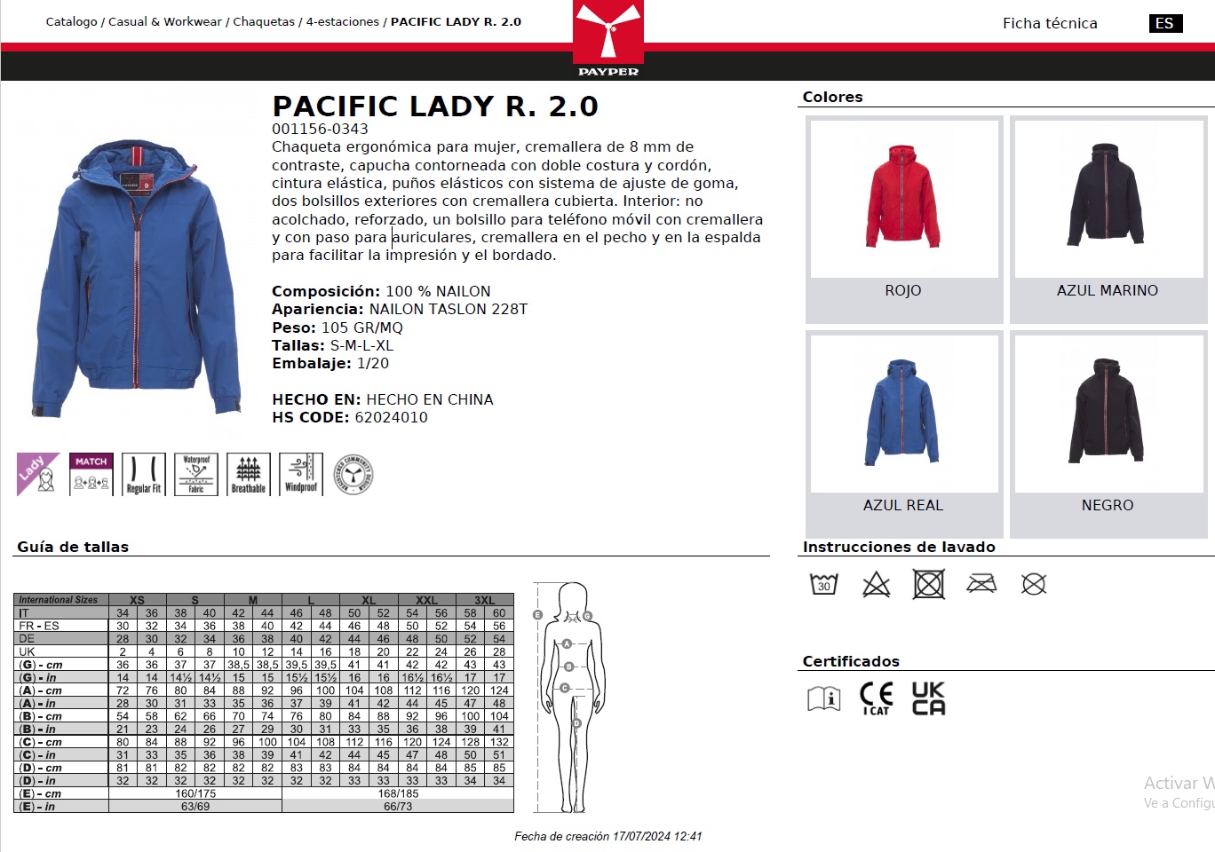 CHAQUETA PACIFIC LADY R. 2.0 · WATERPROOF · CORTAVIENTOS · 100% NAILON · CE I CAT