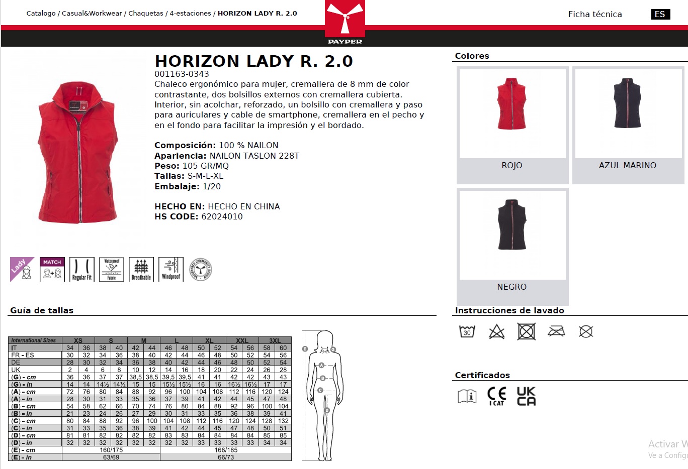 CHALECO HORIZON LADY R. 2.0 · WATERPROOF · CORTAVIENTOS · 100% NAILON · CE I CAT