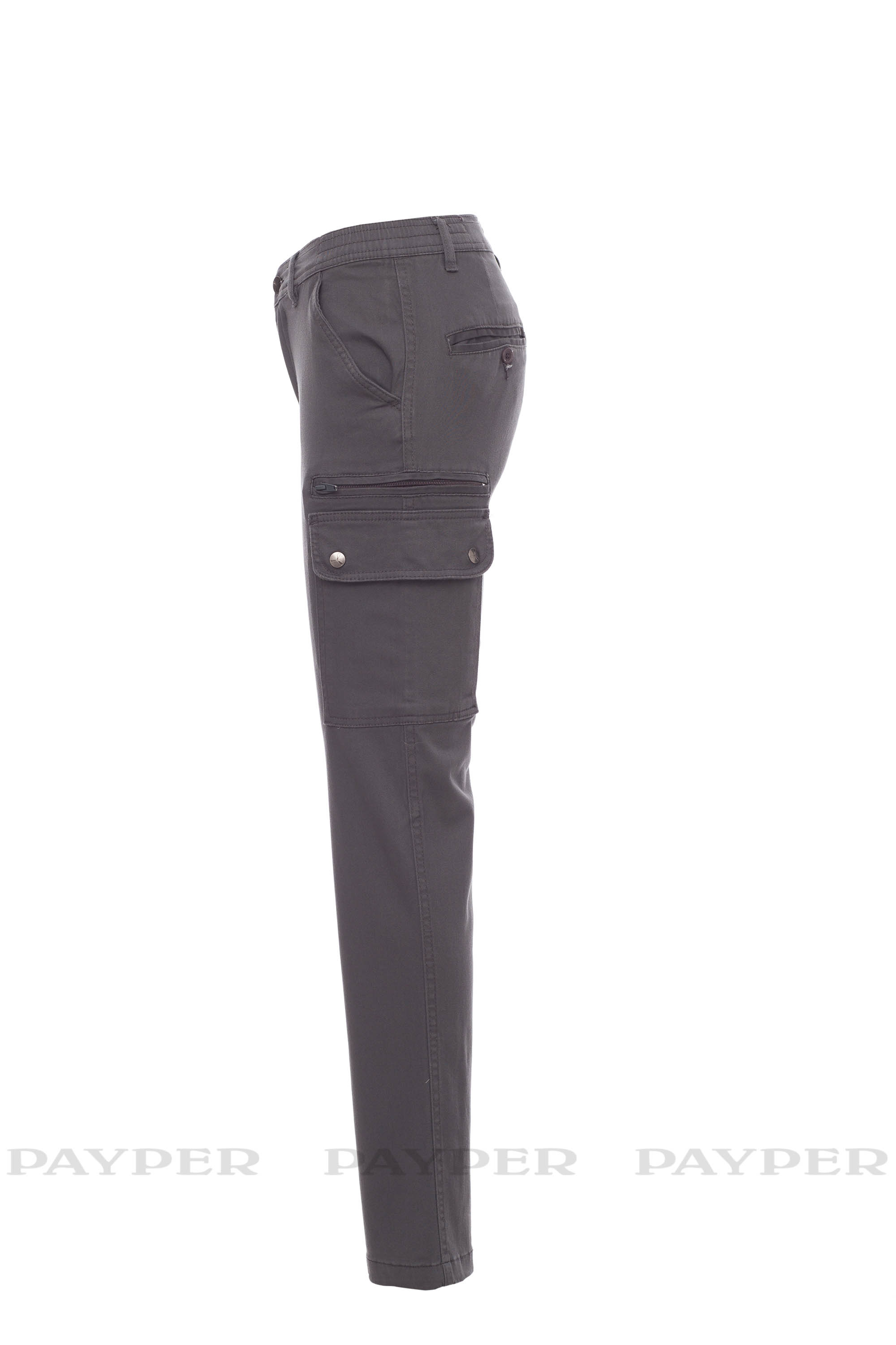 Pantalón clásico para mujer, stretch, multiestación con elásticos laterales y trabillas en la cintura, cierre con cremallera y botón de metal, dos bolsillos delanteros de corte clásico, dos bolsillos laterales con tapeta y botones a presión, un bolsillo con cremallera de seguridad en la parte izquierda, un soporte para metro retráctil a la derecha, dos bolsillos traseros de ribete con ojal y botón.