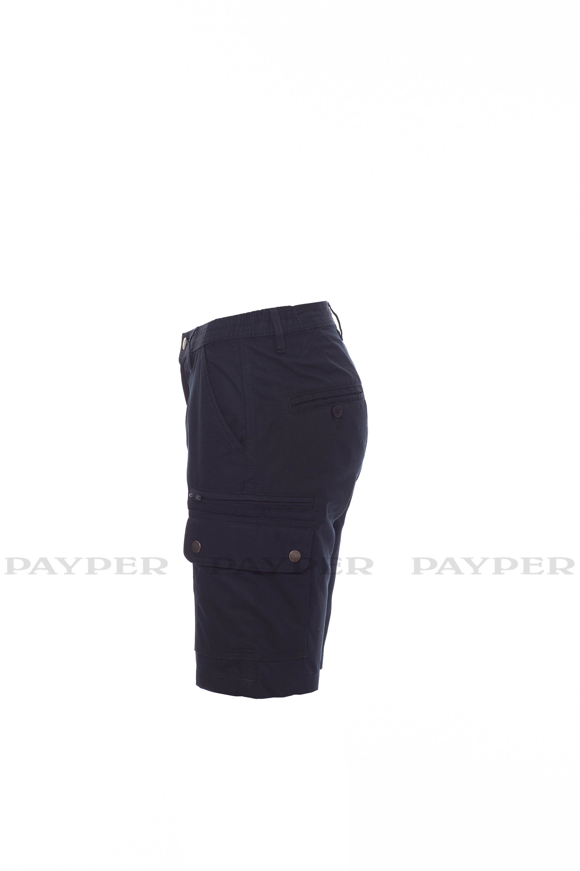 Bermudas para mujer con elásticos laterales y trabillas en la cintura, cierre con cremallera y botón de metal, dos bolsillos delanteros de corte clásico, dos bolsillos laterales con tapeta y botones a presión, un bolsillo con cremallera de seguridad en la parte izquierda, un soporte para metro retráctil a la derecha, dos bolsillos traseros de ribete con ojal y botón.