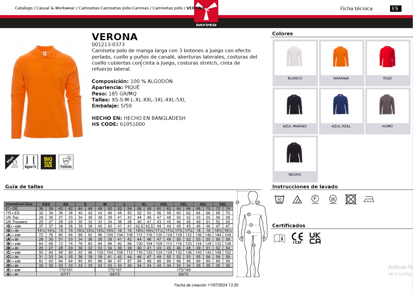 POLO VERONA · ML · 100% ALGODON · CE I CAT · PROTECCION SOLAR >50ºC