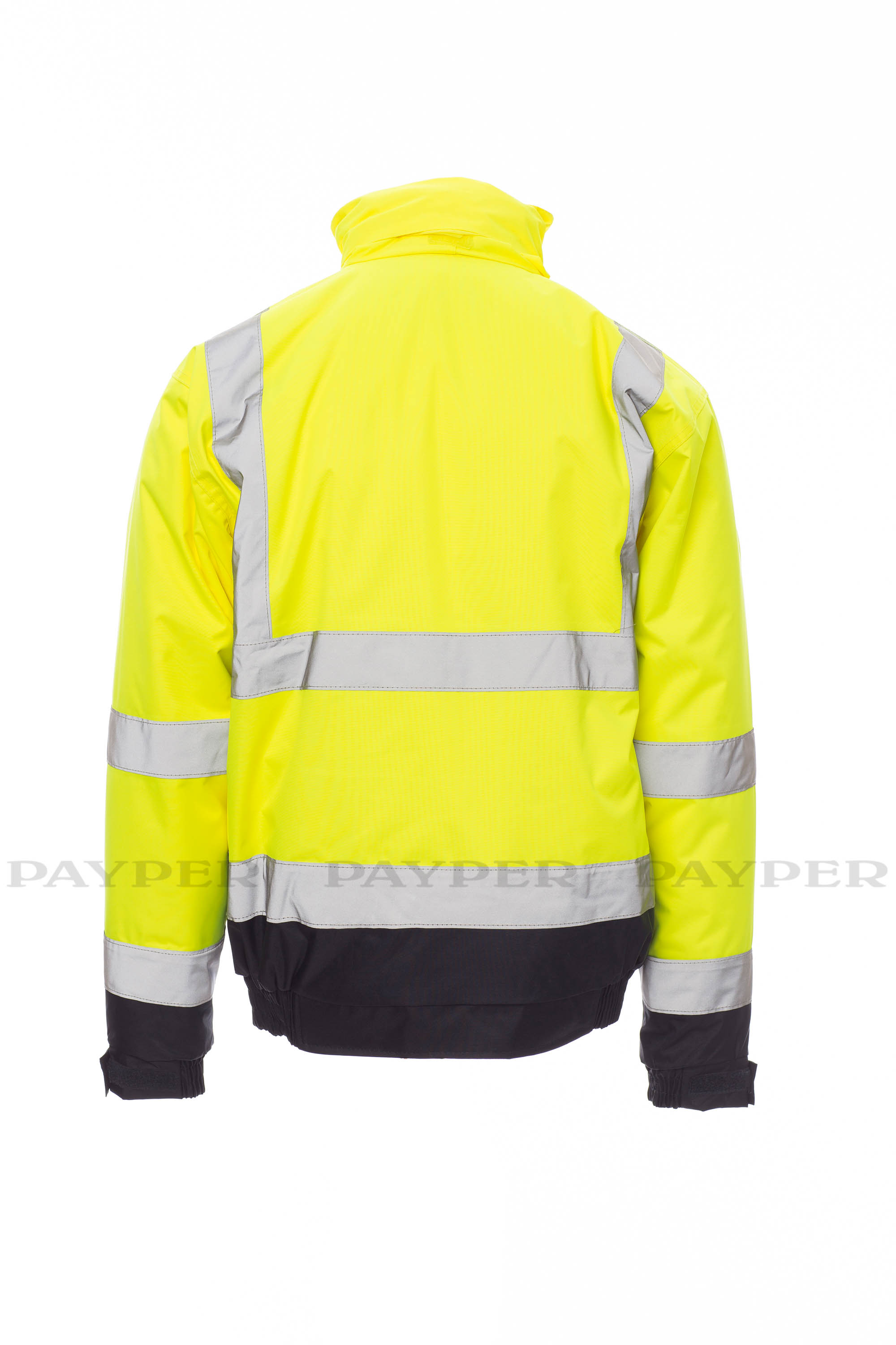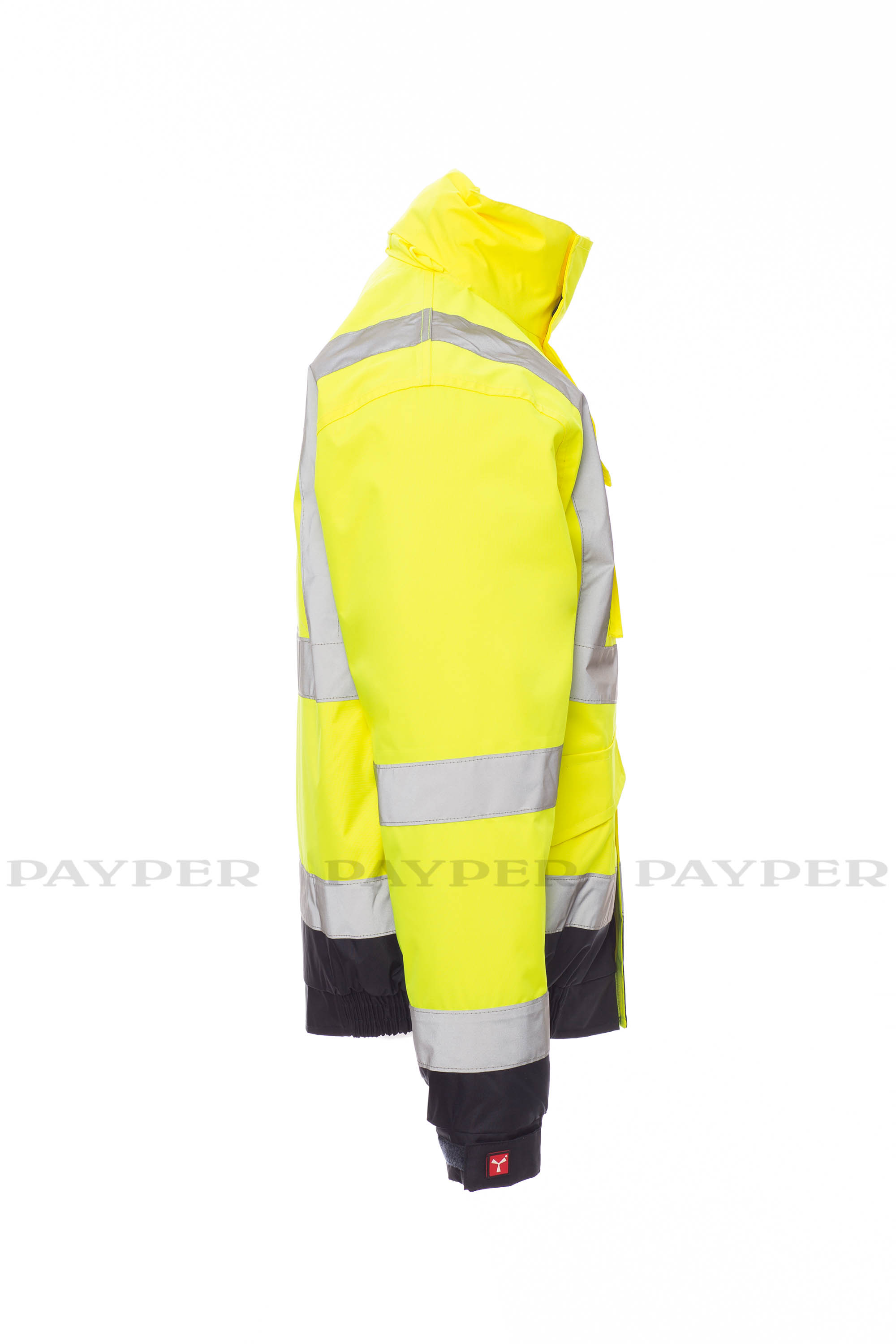 Chaqueta bicolor de alta visibilidad con bandas reflectantes, cremallera entera con tapeta, capucha plegable en el cuello, cintura y puños elásticos, dos amplios bolsillos frontales con tapeta y velcro, con porta móvil y gancho porta tarjeta de identificación. Interior: acolchado, un bolsillo con velcro, costuras termoencintadas