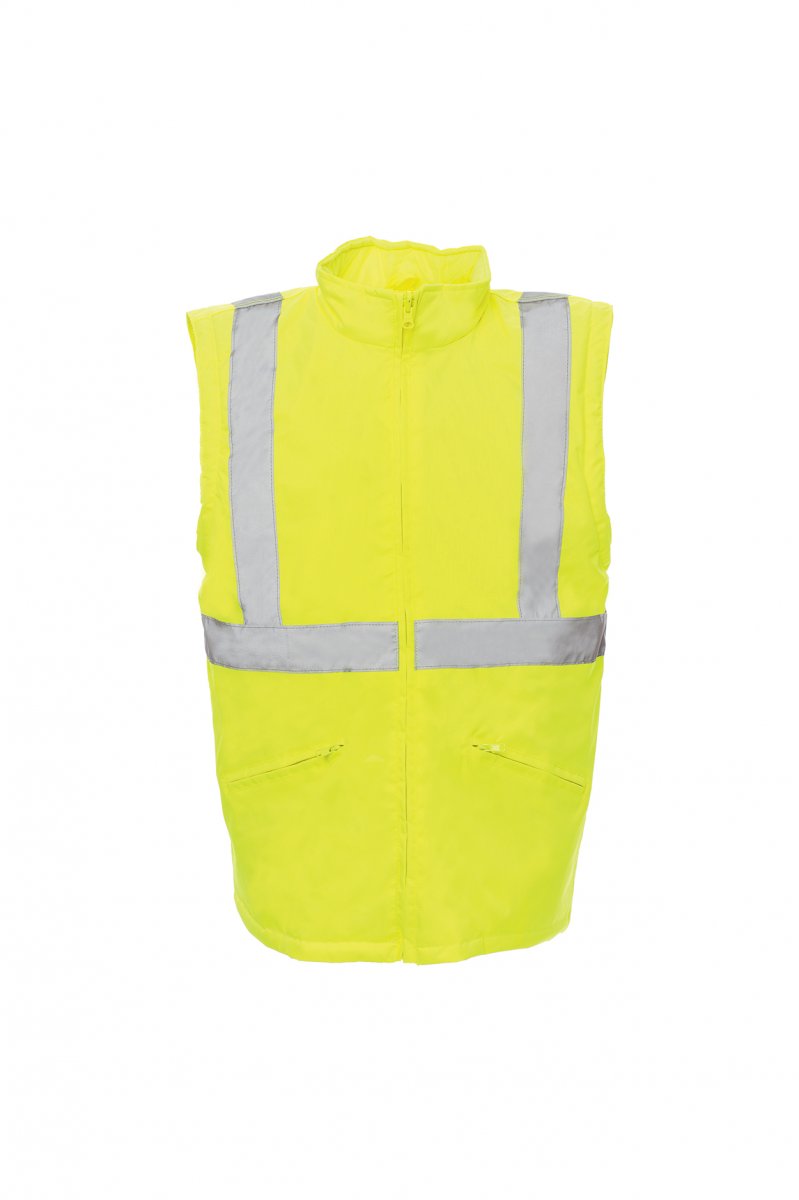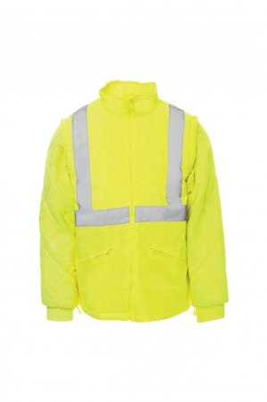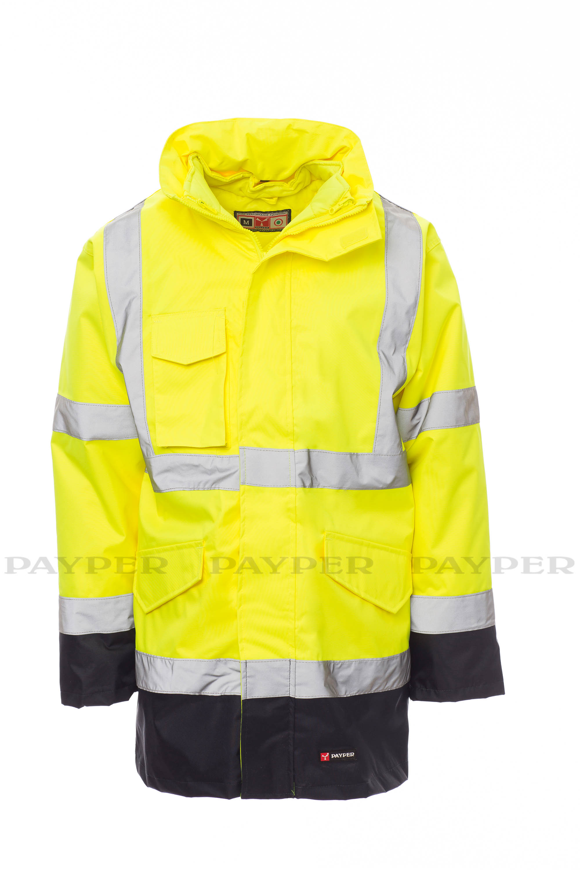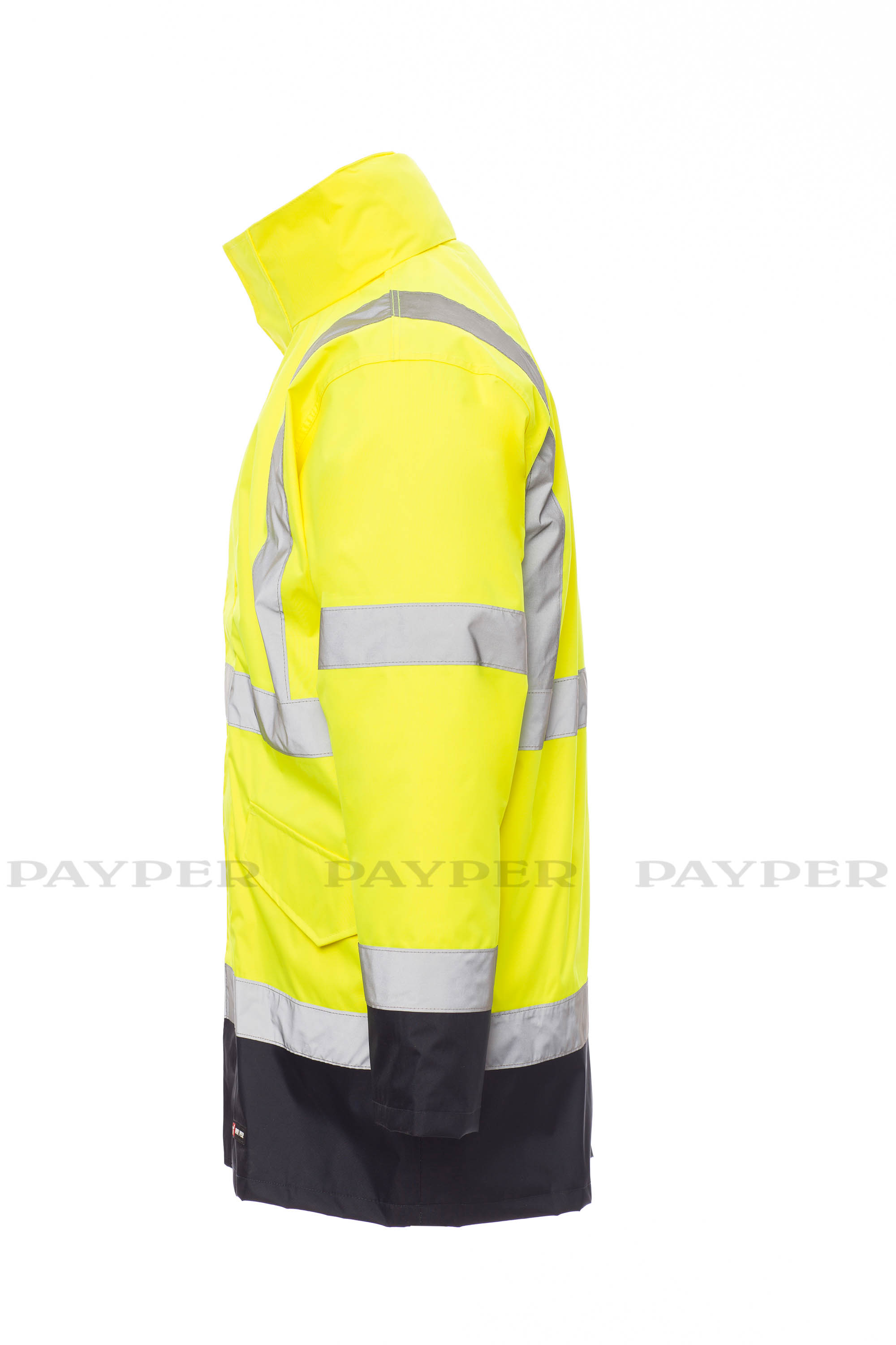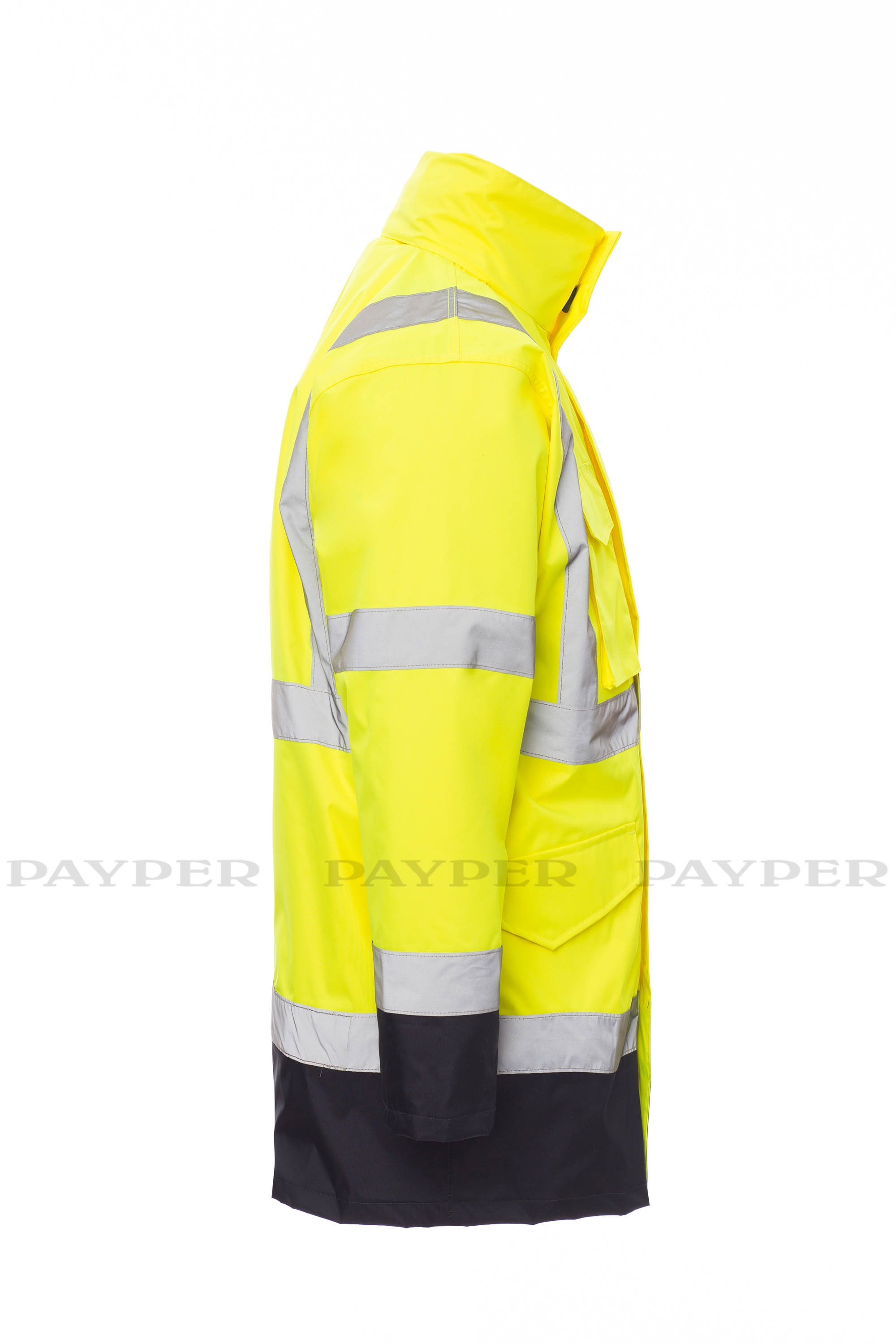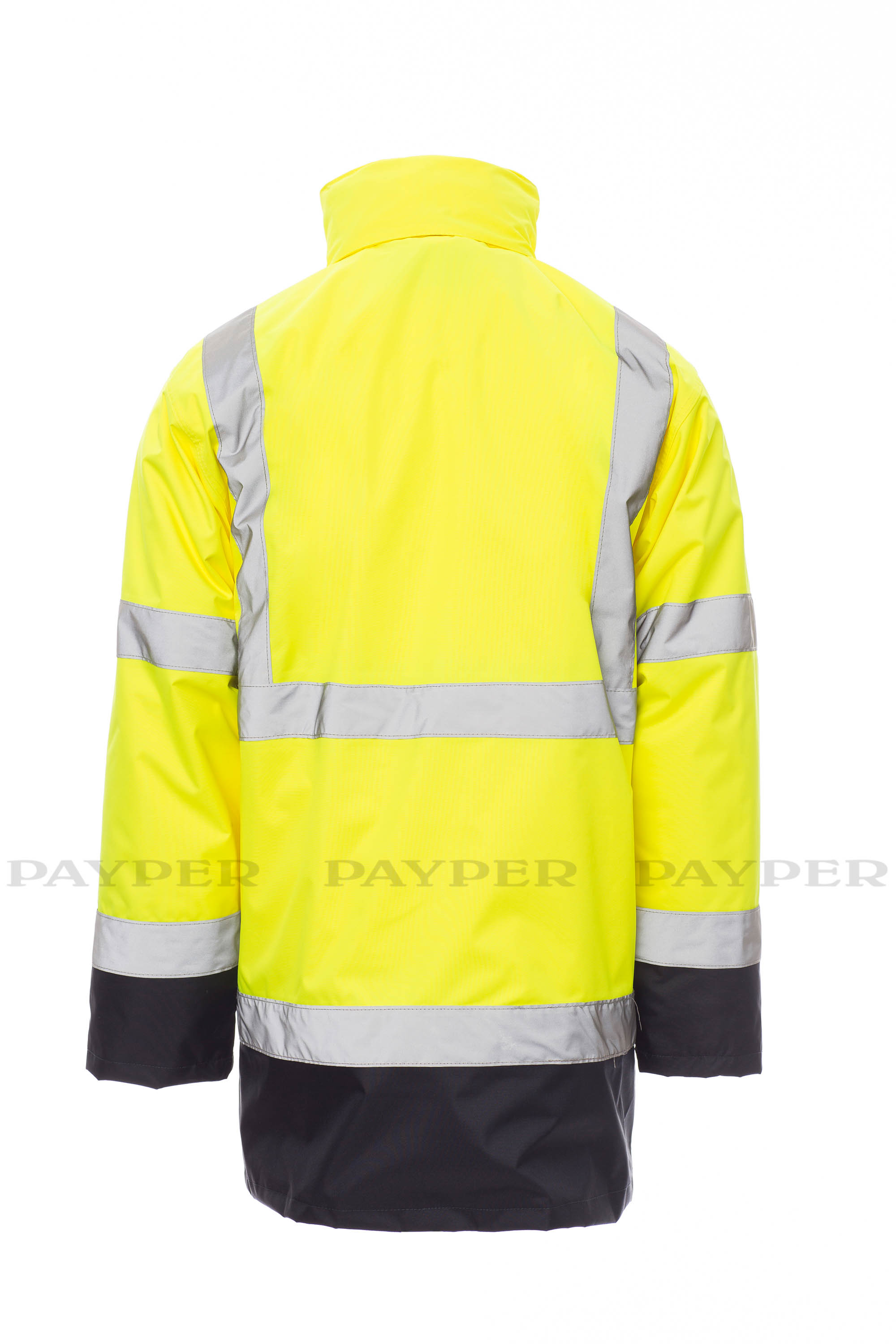 Parka bicolor 4 en 1 de alta visibilidad. Chaqueta exterior sin forro, apertura con cremallera de plástico cubierta con tapeta con cierre velcro, capucha plegable en el cuello, mangas pegadas. Dos bolsillos frontales con tapeta y velcro: a la altura del pecho derecho con velcro, soporte para teléfono móvil y anilla para tarjeta de identificación en su interior, un bolsillo interno con velcro. Dos bandas alrededor del tórax, los hombros y las mangas. Costuras termoselladas. Chaqueta interior desmontable y acolchada con mangas extraíbles, apertura con cremallera de plástico, puños elásticos de canalé, dos bolsillos frontales con cremallera, un bolsillo interno con cremallera, una banda alrededor del tórax y dos bandas verticales en los hombros.