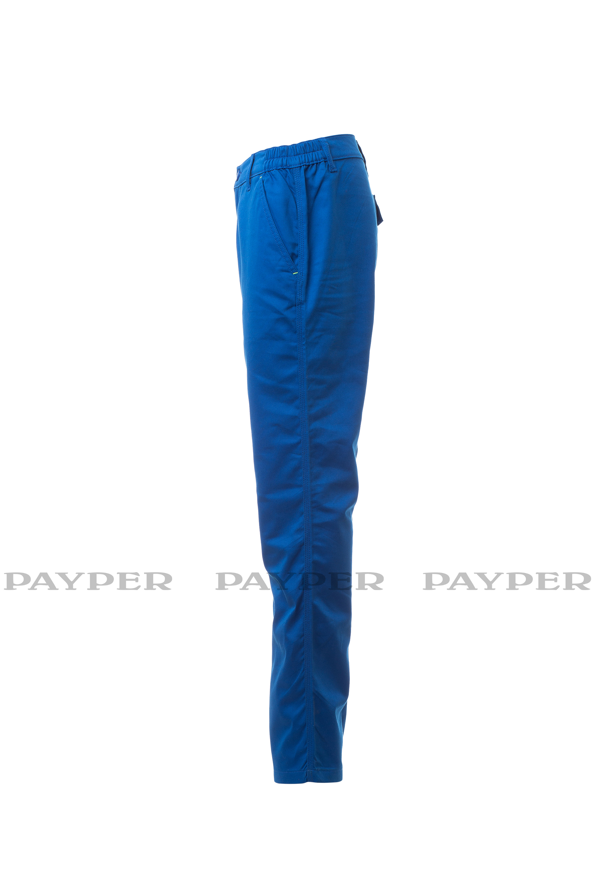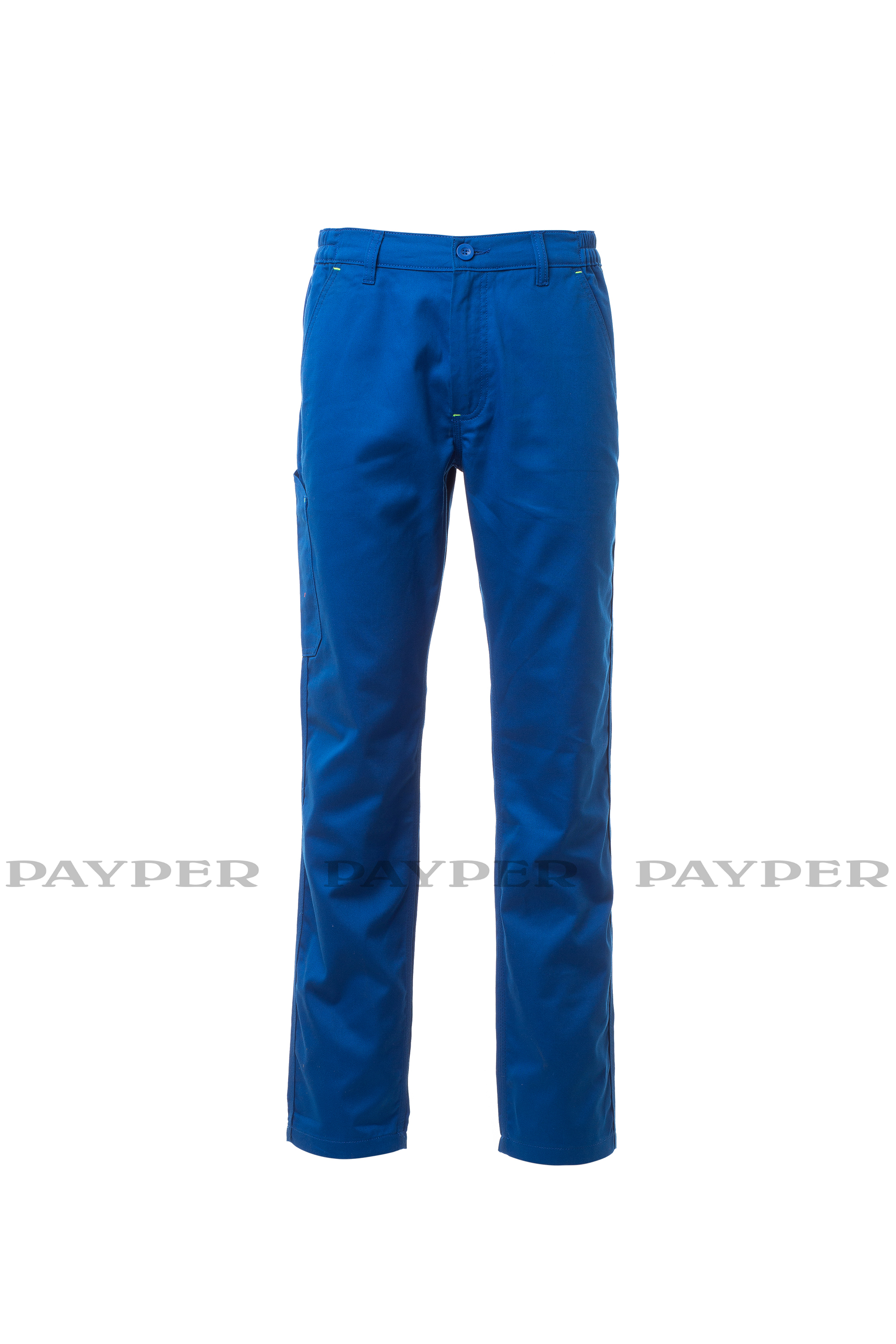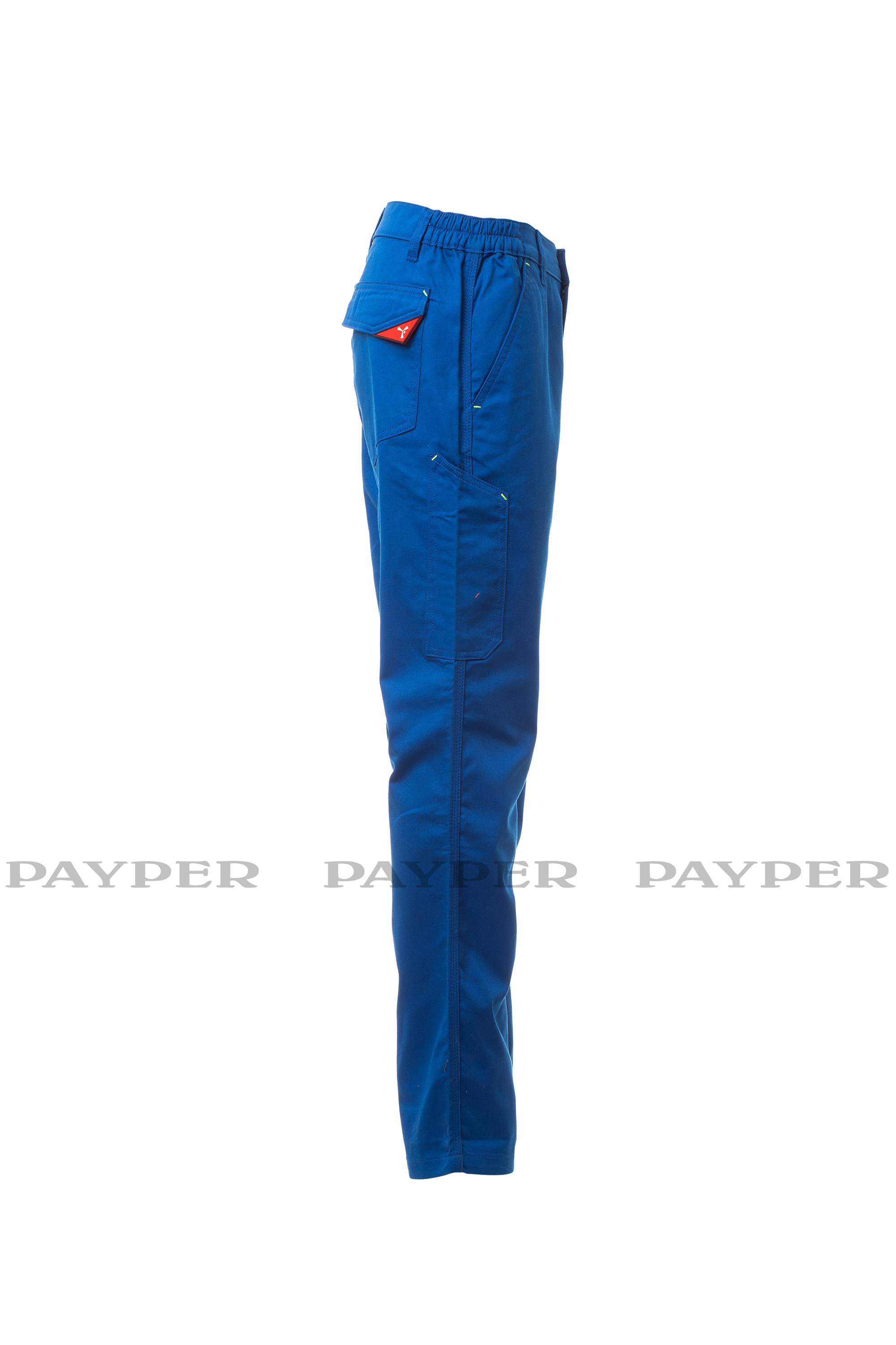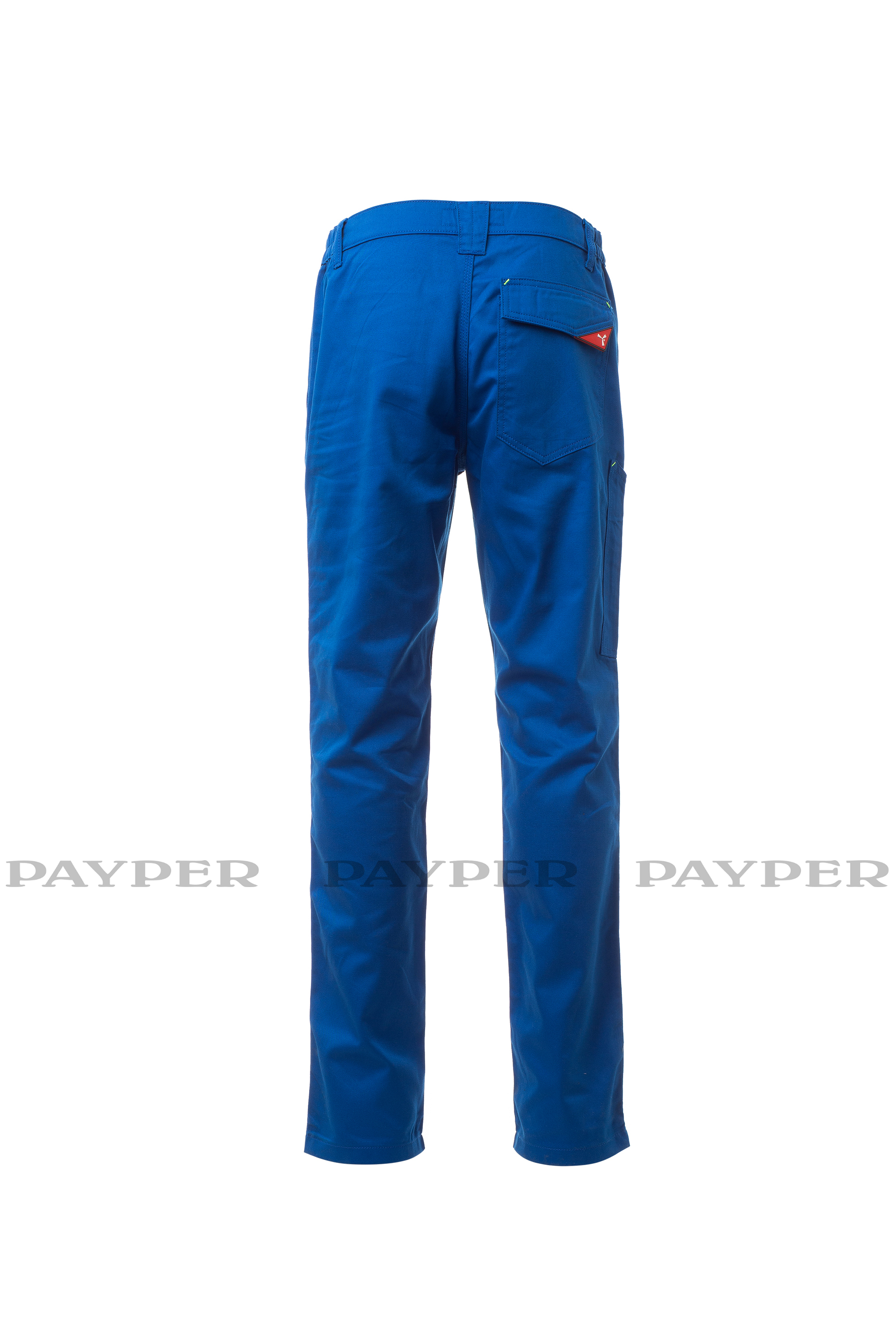Pantalón con trabillas y elástico en la cintura, cierre con cremallera y botón. Dos bolsillos delanteros de corte clásico, soporte para metro lateral derecho, bolsillo trasero con tapeta y velcro. Costuras de triple aguja.