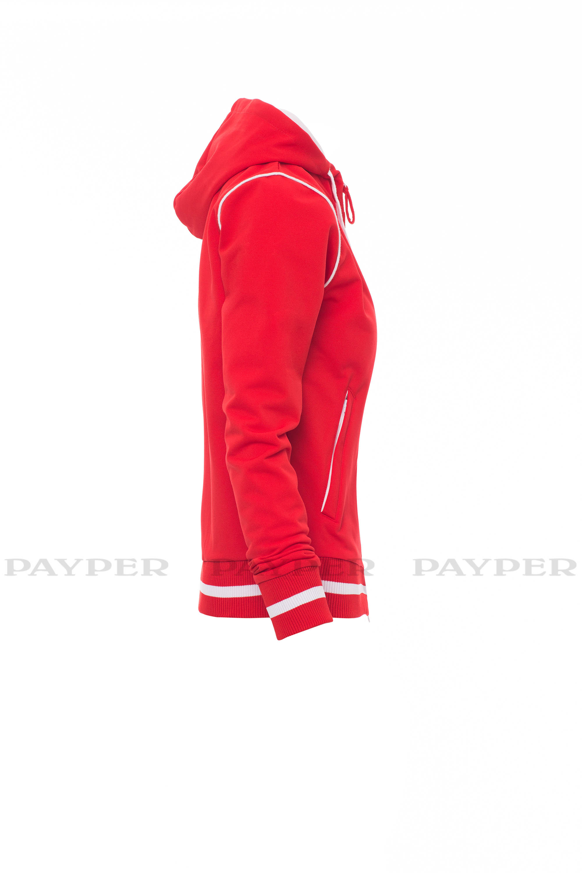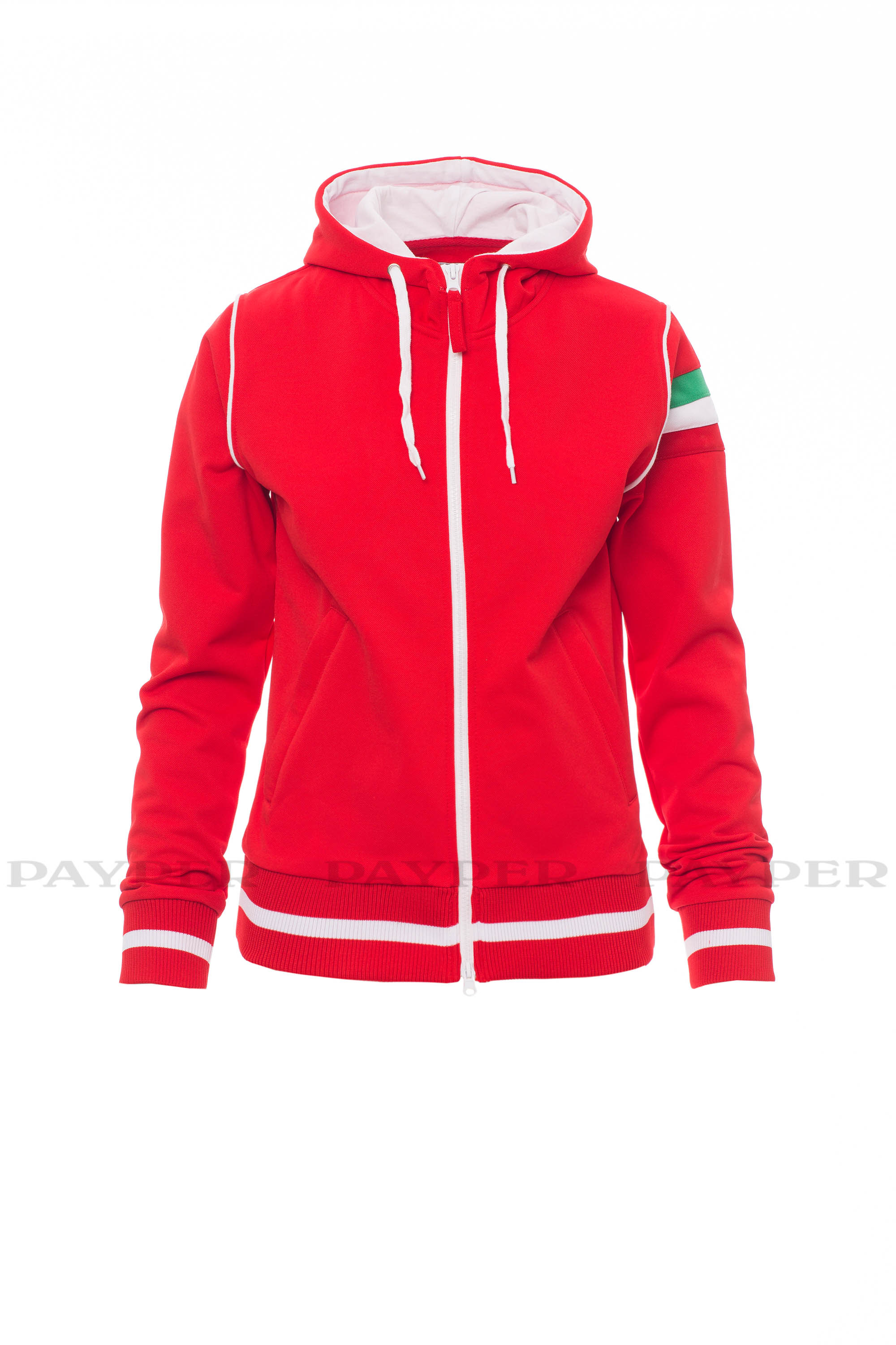 Sudadera ceñida para mujer con cremallera completa de plástico de contraste y doble tirador metálico. Capucha y cordón de contraste, cuello y dobladillo elásticos de contraste, cinta en puño de contraste, ribete (colores de la andera) en la manga izquierda, 2 bolsillos con cremallera, costuras reforzadas y tejido tipo piqué para mayor capacidad de transpiración.