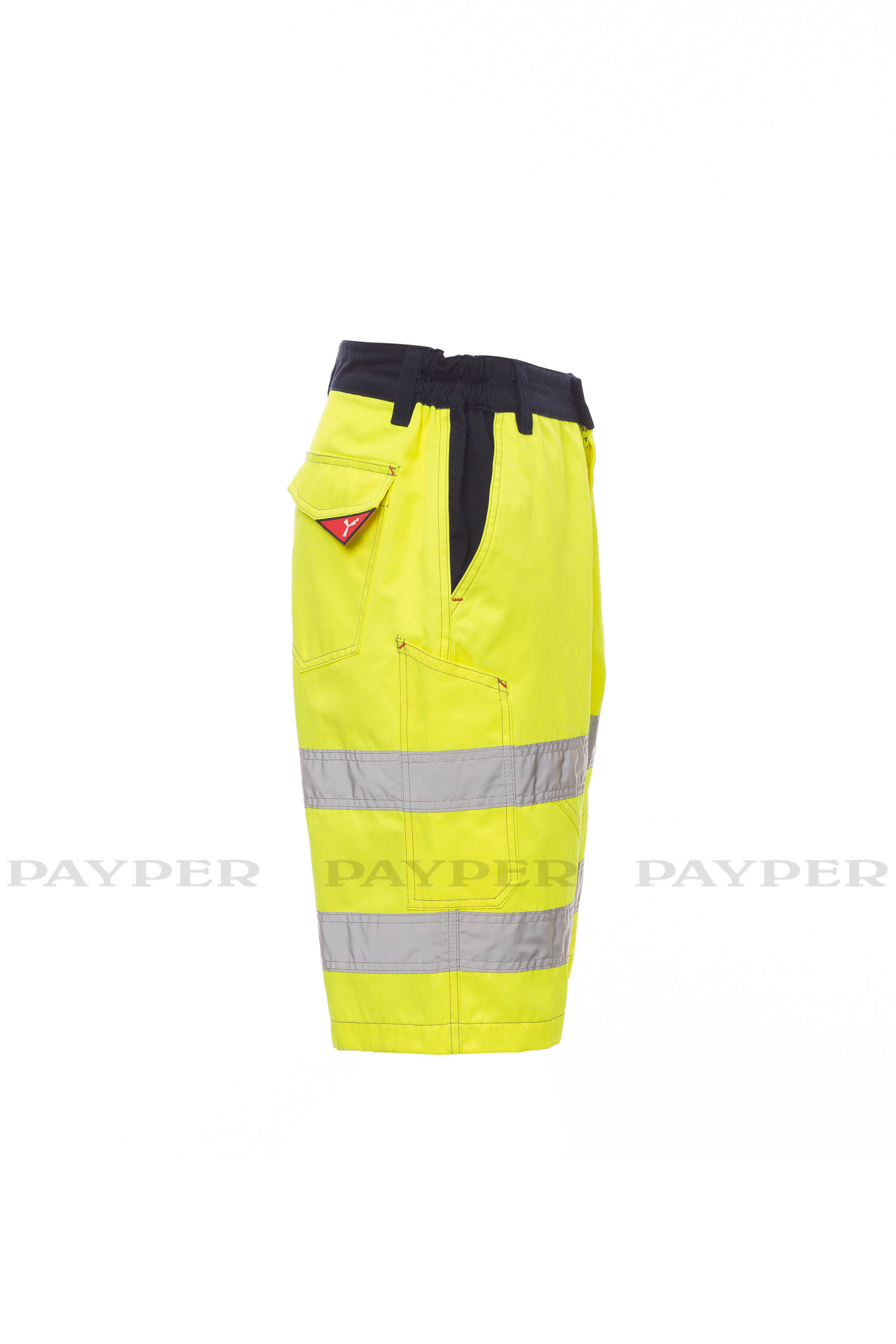 Bermudas para hombre, de alta visibilidad con bandas reflectantes, elásticos laterales y trabillas en la cintura, cierre con cremallera y botón de plástico, dos bolsillos delanteros de corte clásico, bolsillo lateral con LOCK SYSTEM, soporte para metro, dos bolsillos traseros, uno con tapeta y velcro y otro abierto. Costuras de contraste, costuras de la entrepierna e interior de la pierna con triple aguja.