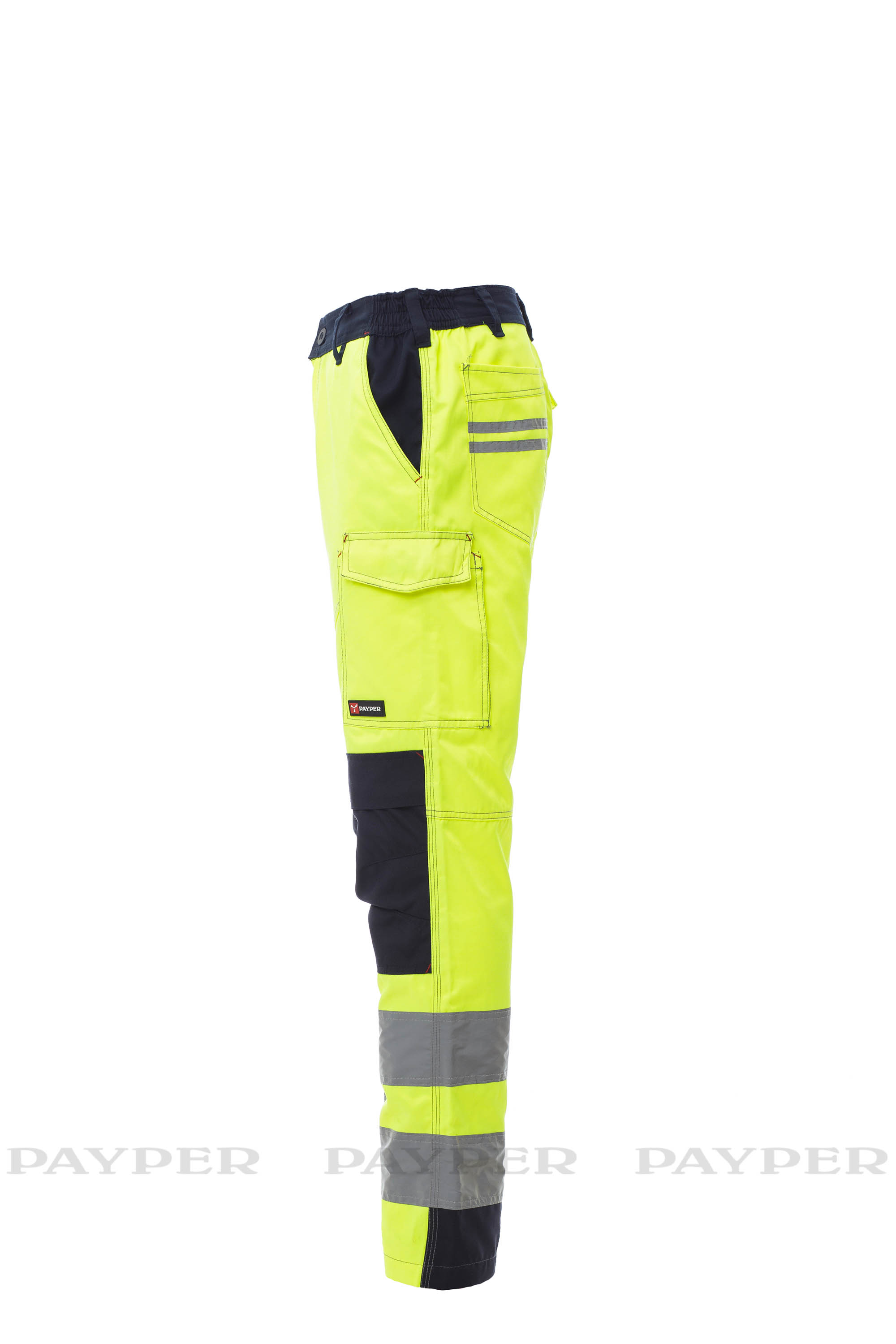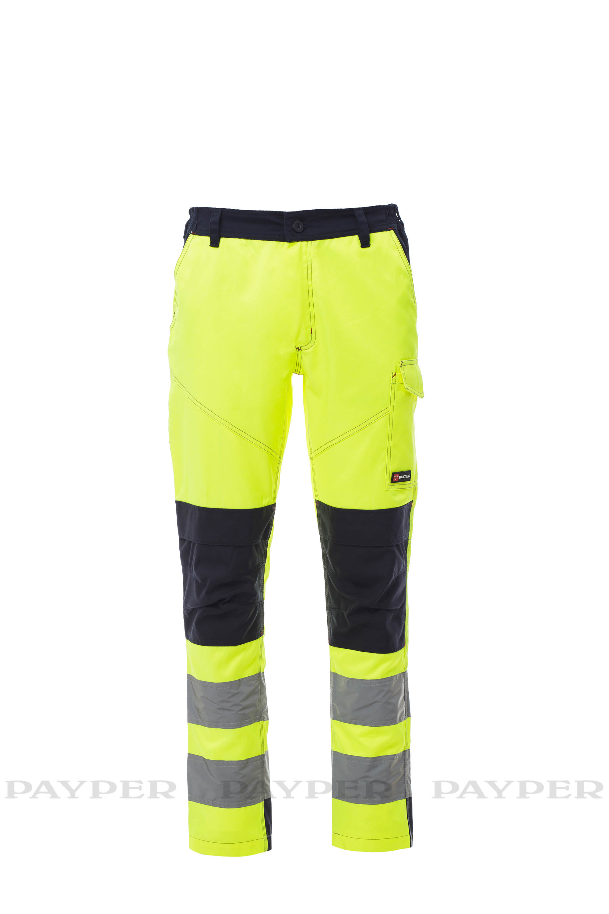 Pantalones para hombre, con soportes para almohadillas (rodilleras), multiestación, de alta visibilidad con bandas reflectantes, elásticos laterales y trabillas en la cintura, cierre con cremallera y botón de plástico, dos bolsillos delanteros de corte clásico, bolsillo lateral con LOCK SYSTEM, soporte para metro, soporte para smartphone, dos bolsillos traseros, un abierto con banda reflectante y otro cerrado con velcro. Costuras de contraste, costuras de la entrepierna e interior de la pierna con triple aguja.