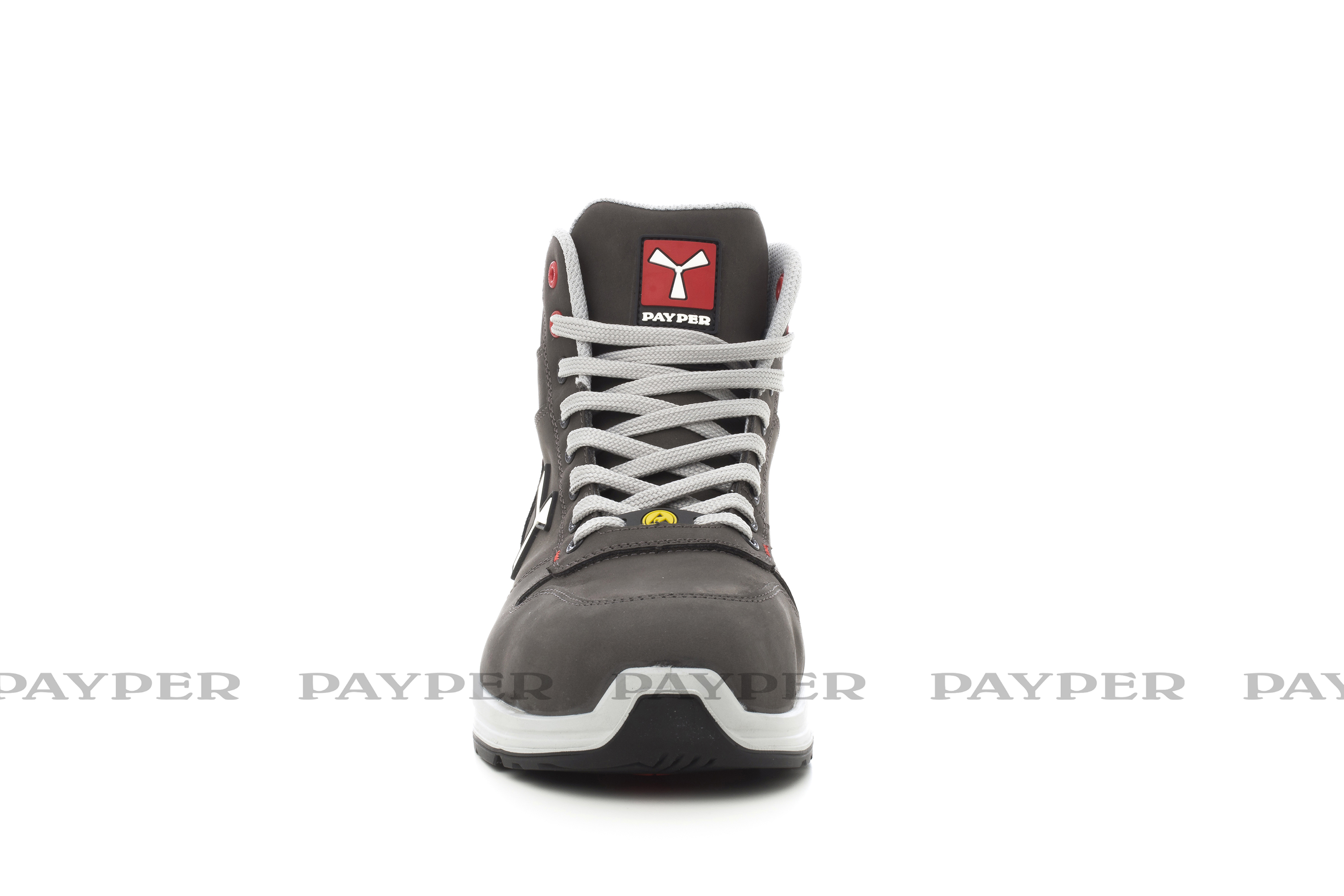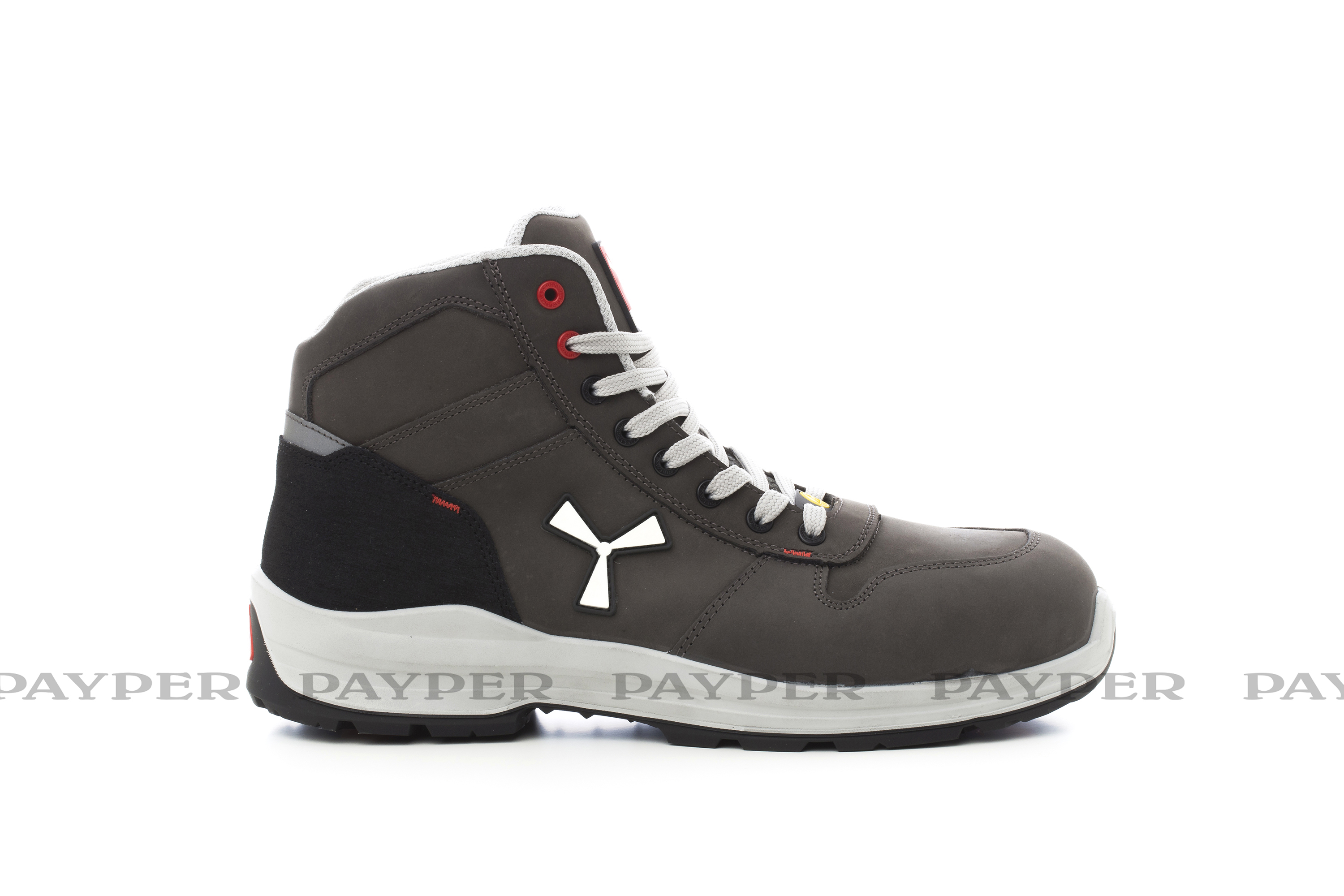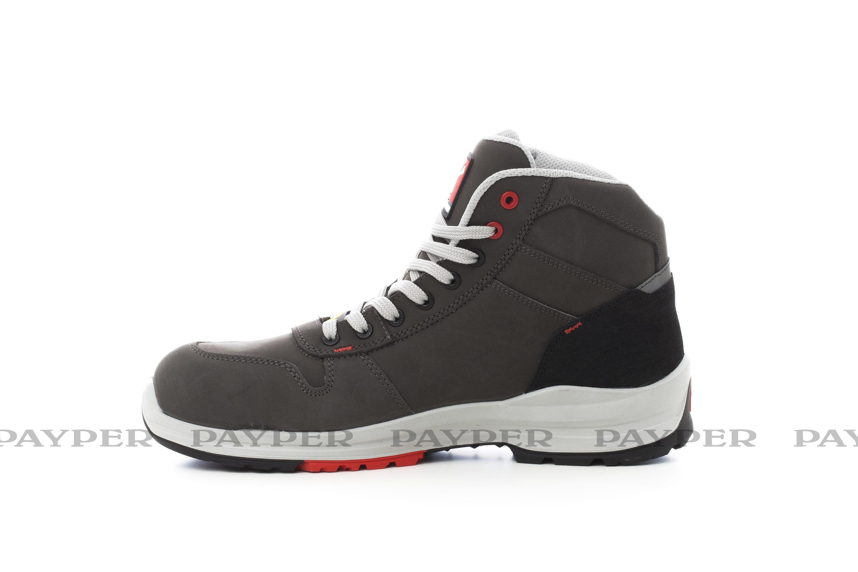 Zapato de seguridad antiestático de altura media de hombre, pala de piel repelente al agua y transpirable, forro interior (en toda la superficie interna) transpirable y resistente a la abrasión, 8+8 ojales sin metal, protector de tacón en grano técnico con inserción reflectante, puntera de aluminio moldeado a presión, plantilla extraíble Ortholite X40 016, plantilla de lámina textil certificada antiperforación, cambrillón antitorsión, base de la puntera con forma de herradura, entresuela de poliuretano ultraligero, amortiguador MASTER BALANCE en PU poliéter de alta tenacidad y densidad equilibrada, suela XTRAIL GRIP en TPU con protector de tacón y de punta.