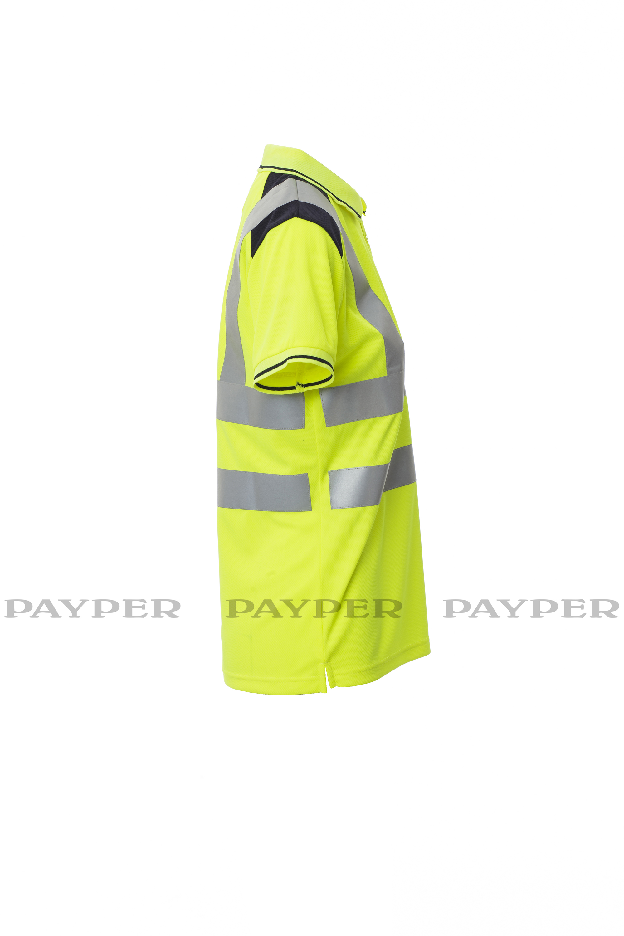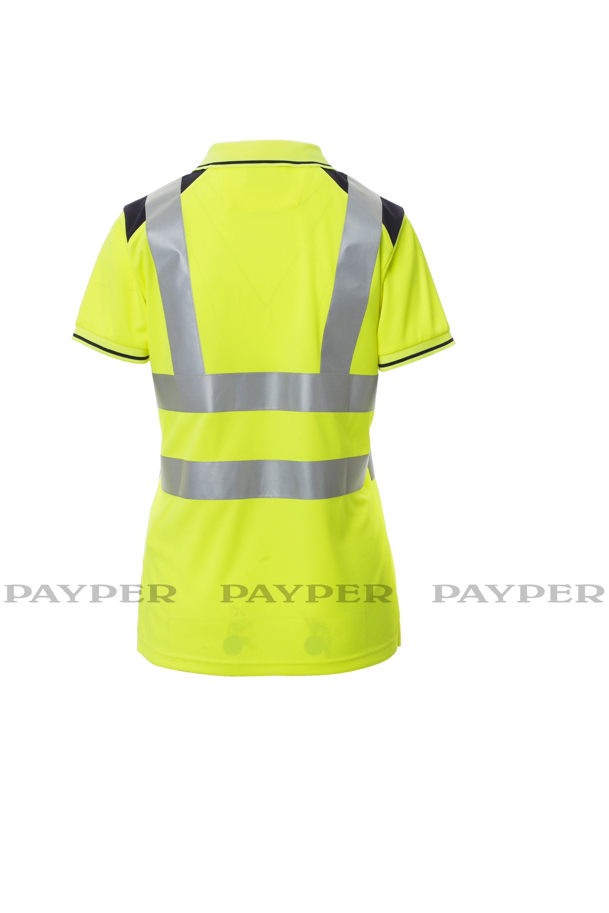 Polo bicolor de mujer de manga corta, de alta visibilidad con bandas reflectantes, con 4 botones a juego en color perla, cuello y puños con un fino perfil en contraste, cuello y puños acanalados, aberturas laterales, costuras del cuello cubiertas.