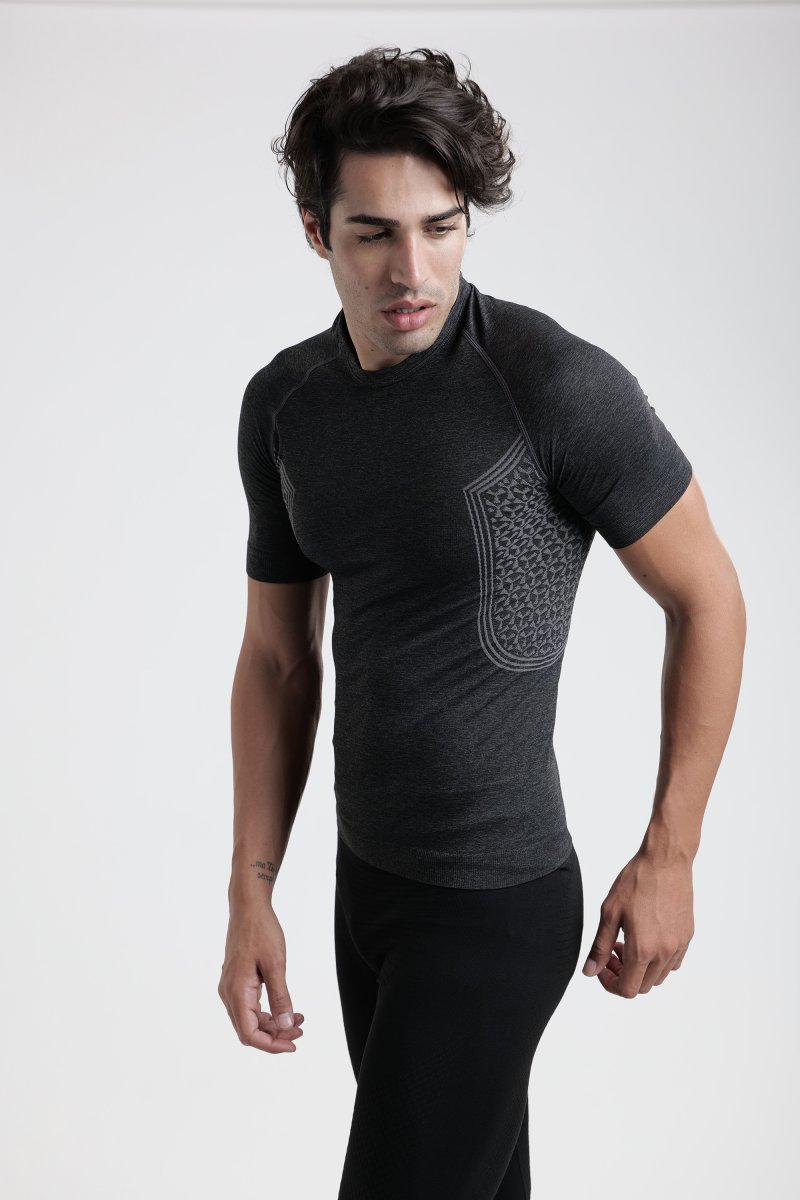 Camiseta térmica de hombre, de cuello redondo y manga corta raglán. Tejido suave y elástico, motivos de hélice en relieve en los costados para garantizar una buena transpiración y una termorregulación constante. El cuello, el bajo y los bordes de las mangas son de punto canalé del mismo material para un mejor confort. Estructura tubular ergonómica para garantizar una adaptación perfecta a la fisonomía del cuerpo.