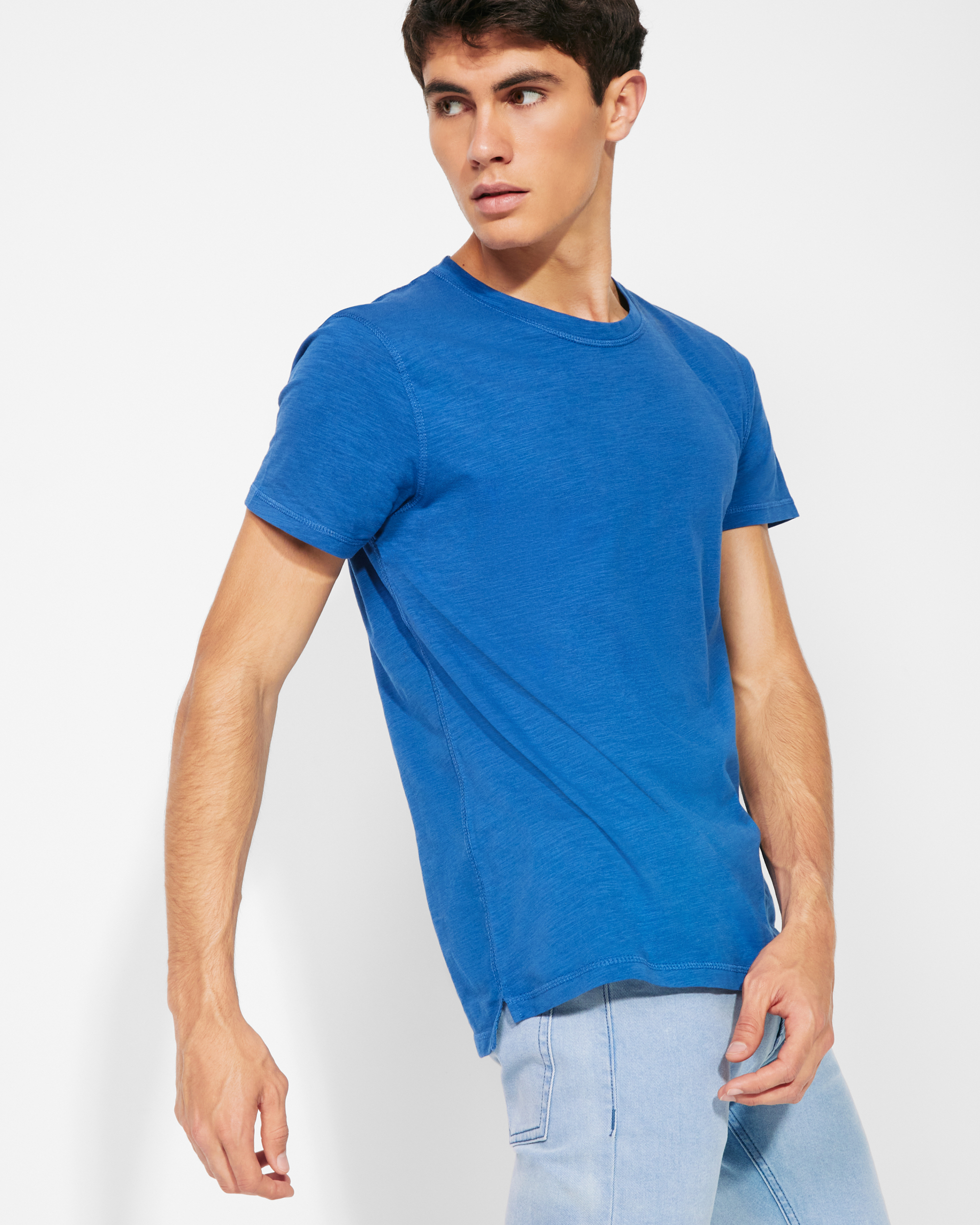 Camiseta de manga corta, en tejido vigoré inclinado. Cuello redondo del mismo tejido. Cubrecosturas interior a contraste de hombro a hombro. Costuras laterales remalladas de adorno. Bajo con aperturas laterales y el patronaje de la espalda es ligeramente más largo que el delantero.
