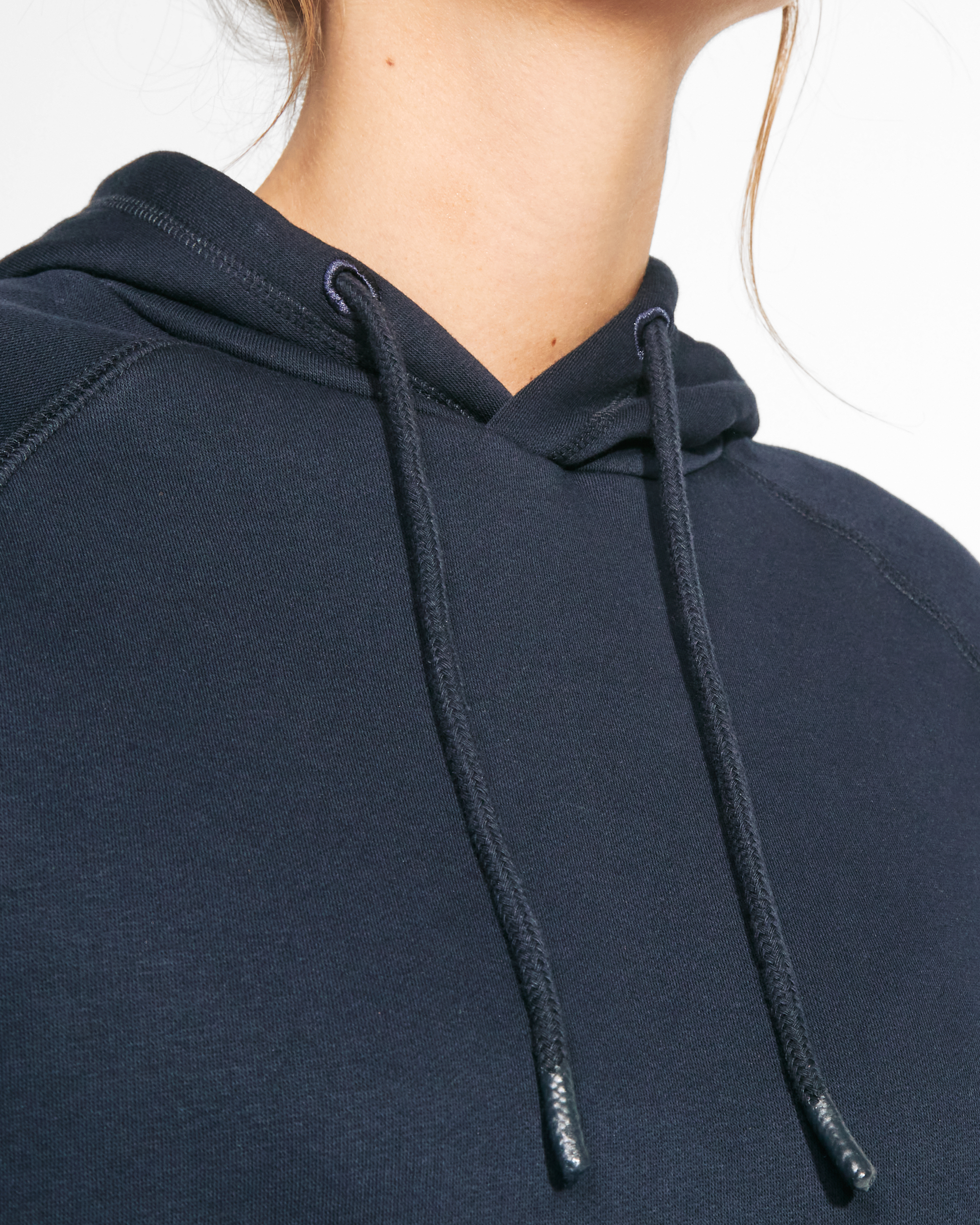 Sudadera con capucha Unisex en Algodón Orgánico Peinado y Poliéster Reciclado. Bolsillo Canguro. Capucha forrada de punto liso y cordones redondos ajustables , ojales bordados. cuello puños y cinturilla de punto canalé 2x1.