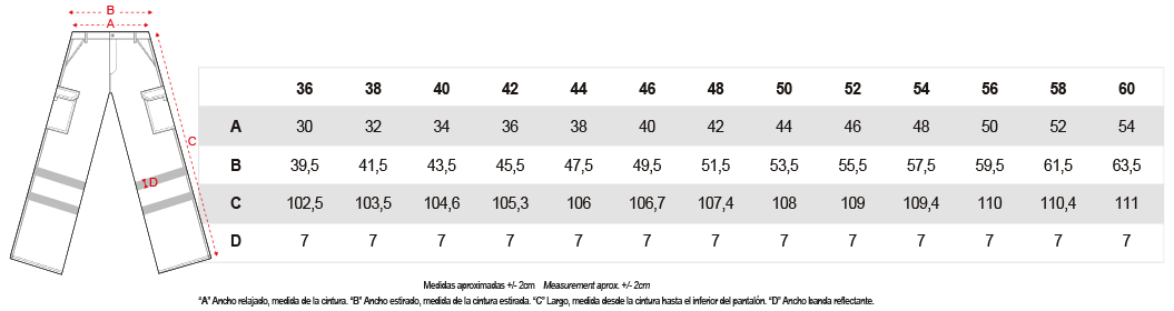 2 bandas reflectantes cosidas en el bajo de las piernas