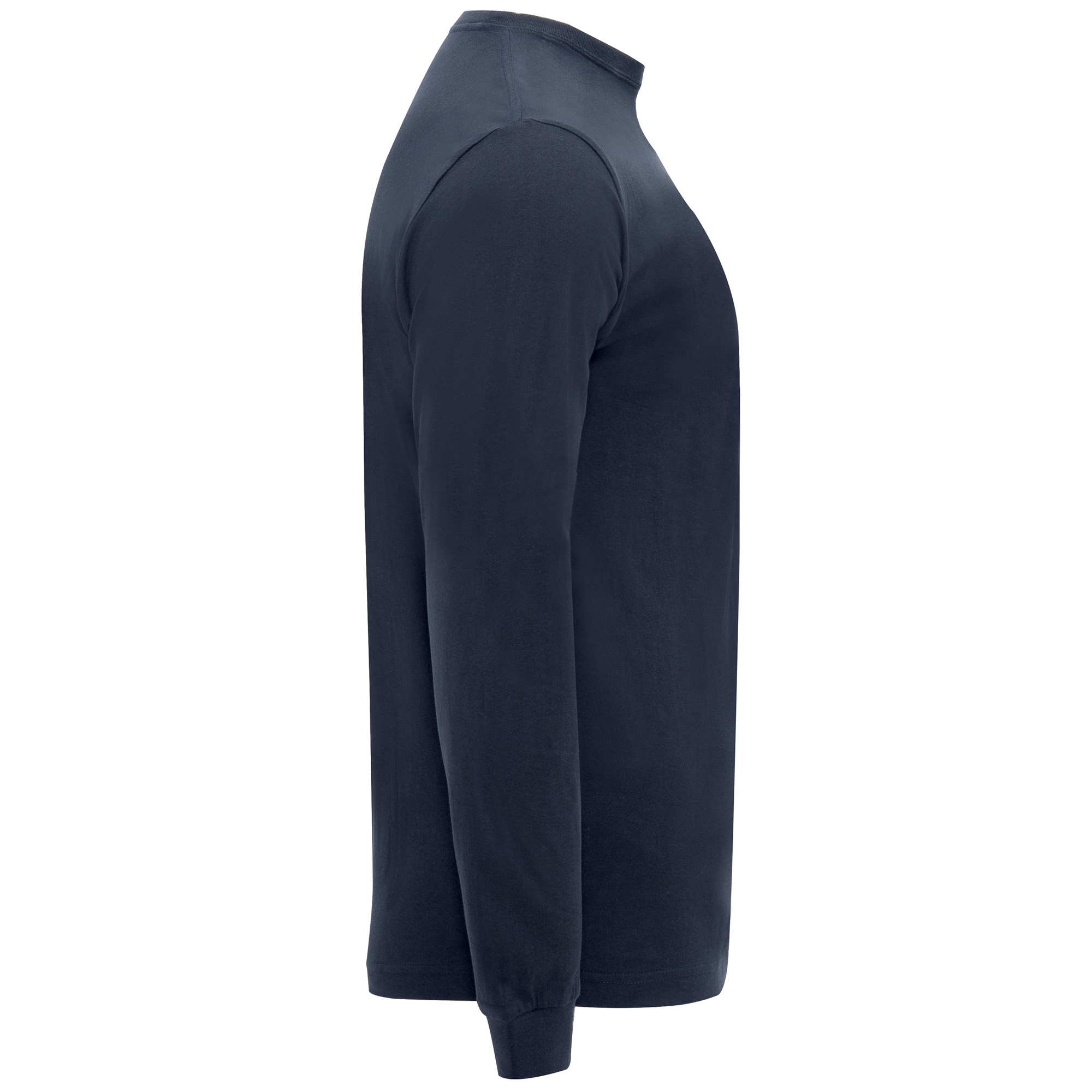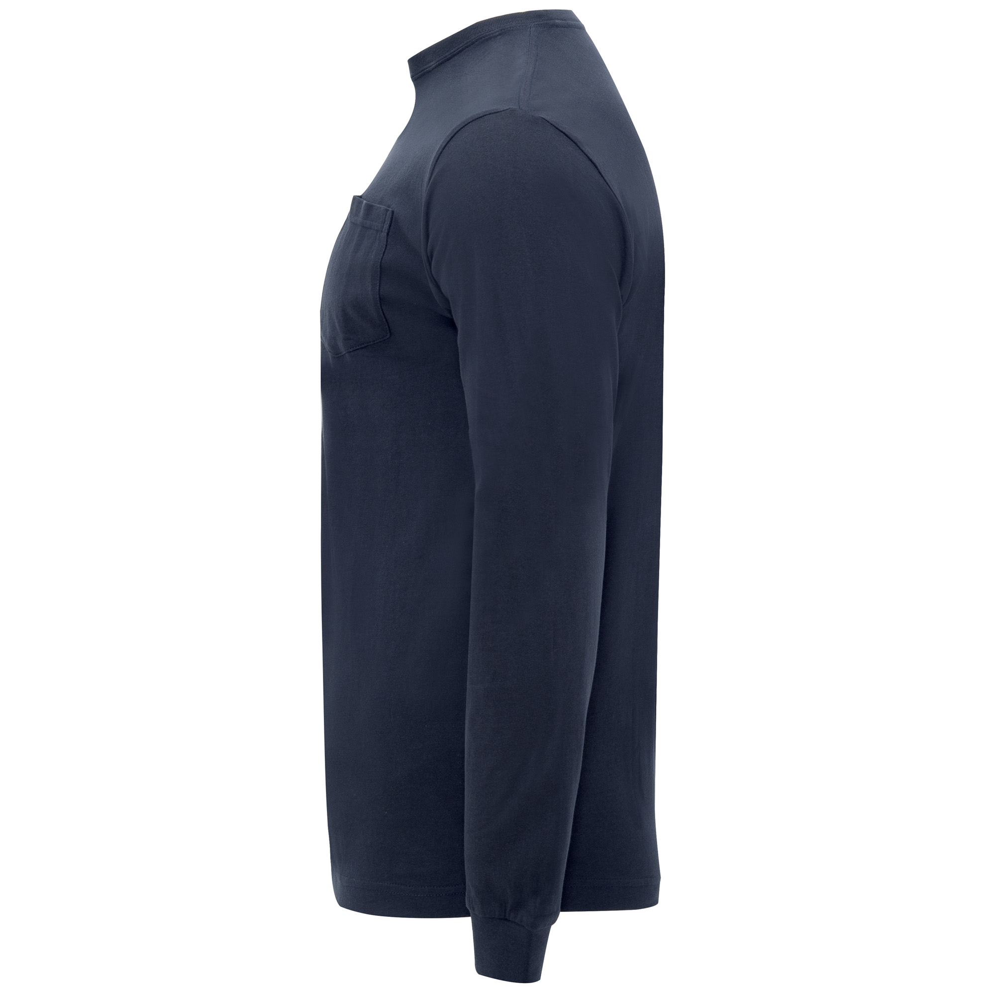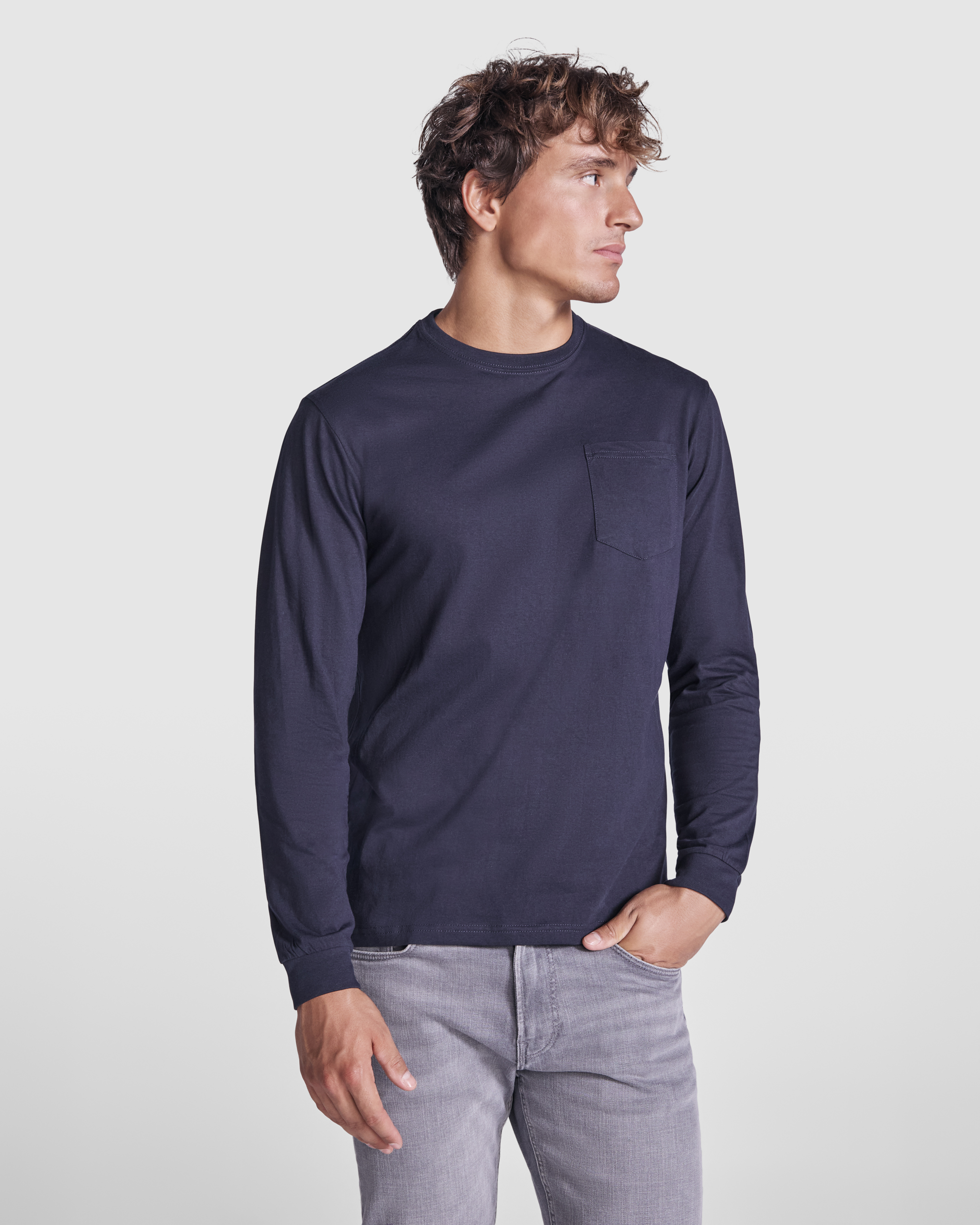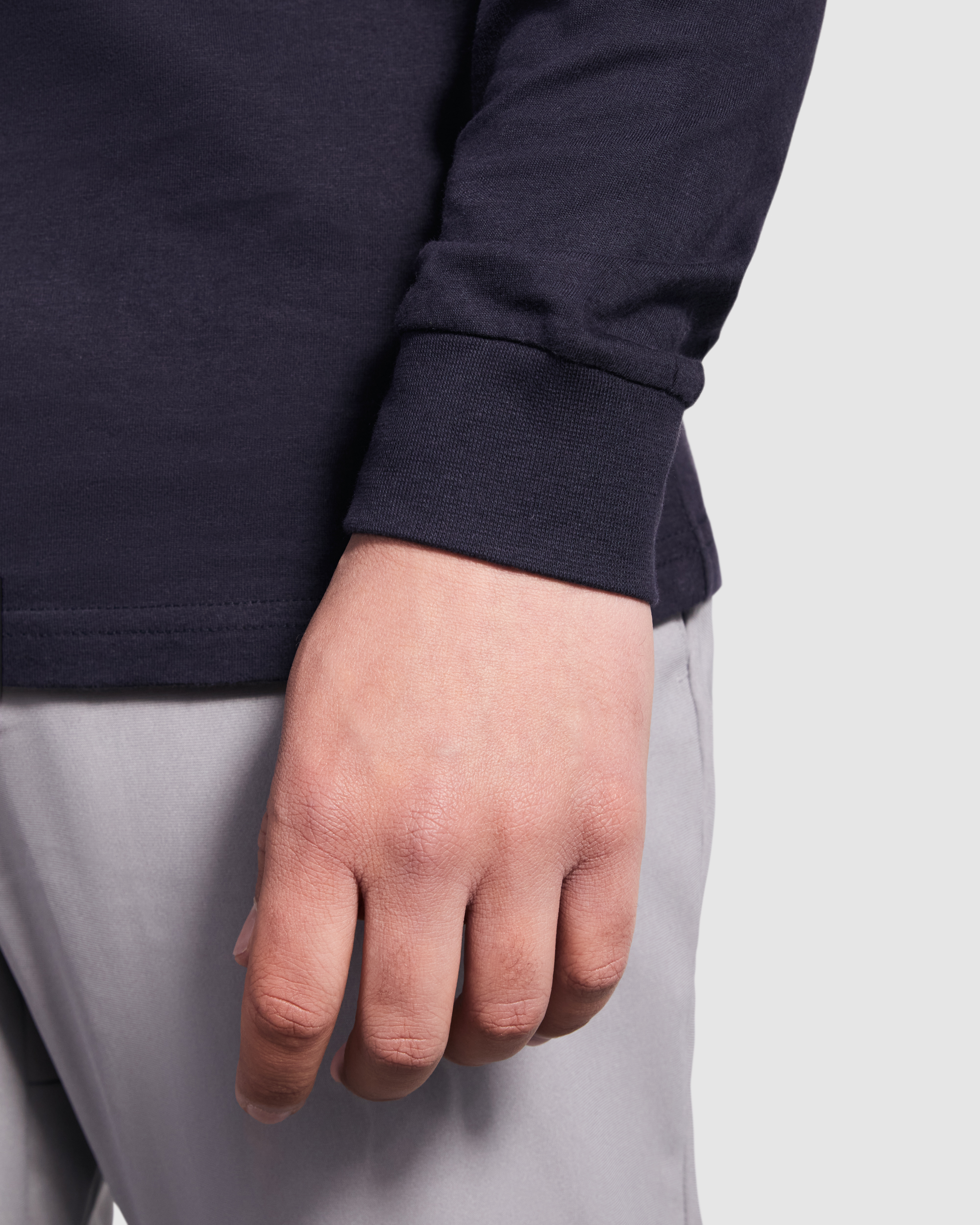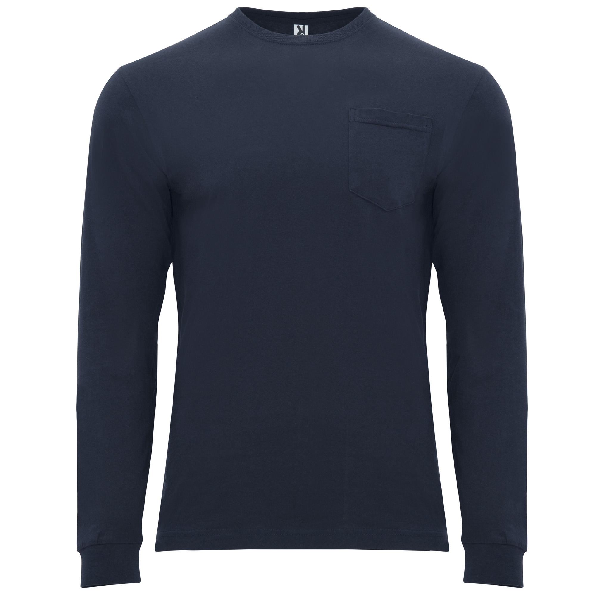 Camiseta de manga larga con cuello redondo y puños en canalé 1x1. Bolsillo en pecho izquierdo. Cubrecosturas reforzado en cuello y hombros.