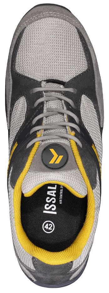 Zapato ligero y flexible con empeine en tejido rejilla y piel serraje. Puntera en composite y lámina anti-perforante textil.