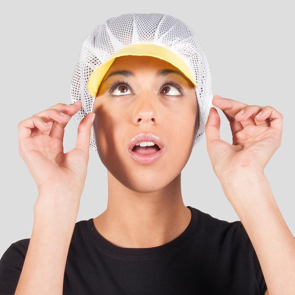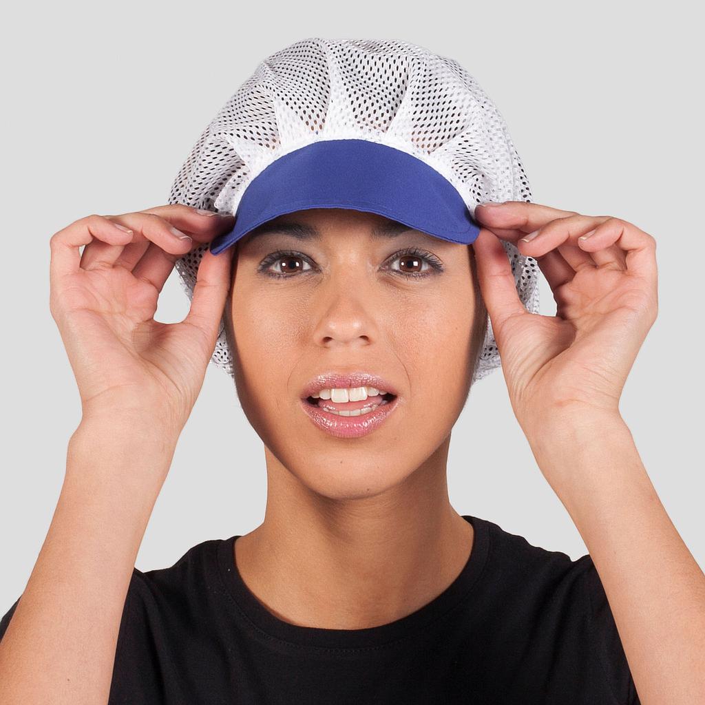 Gorra mujer con rejilla blanca y visera semi rígida de color. Posibilidad de elección entre 17 colores de visera. Cuenta con elástico en parte trasera para recoger el pelo de forma cómoda. Ideal para uniformes de hostelería y restauración, alimentación, almacén, cocina, limpieza o comercio.