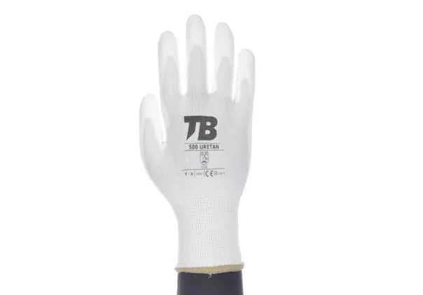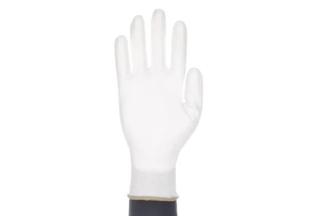 Guante soporte nailon blanco sin costuras. • Recubrimiento poliuretano blanco en palma. • Puño elástico. • Galga 13.