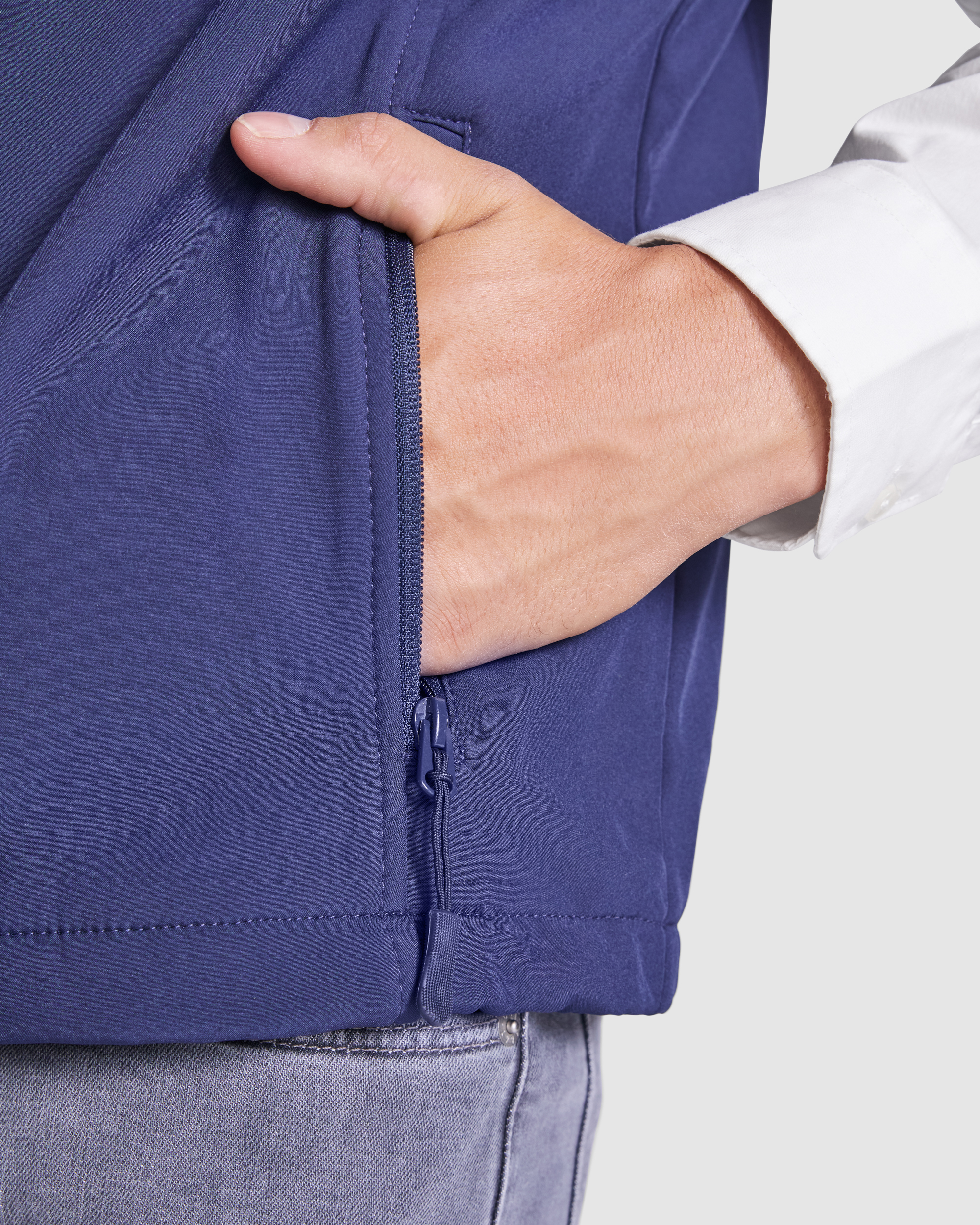 Chaleco softshell compuesto de 2 capas. Cuenta con cremallera invertida a tono, con protector de barbilla y tirador. Forro interior en tejido polar. Bolsillo exterior en pecho derecho con cremallera a tono y tirador, y dos bolsillos exteriores con cremallera a tono y tirador. Bajo con cordón elástico y topes.