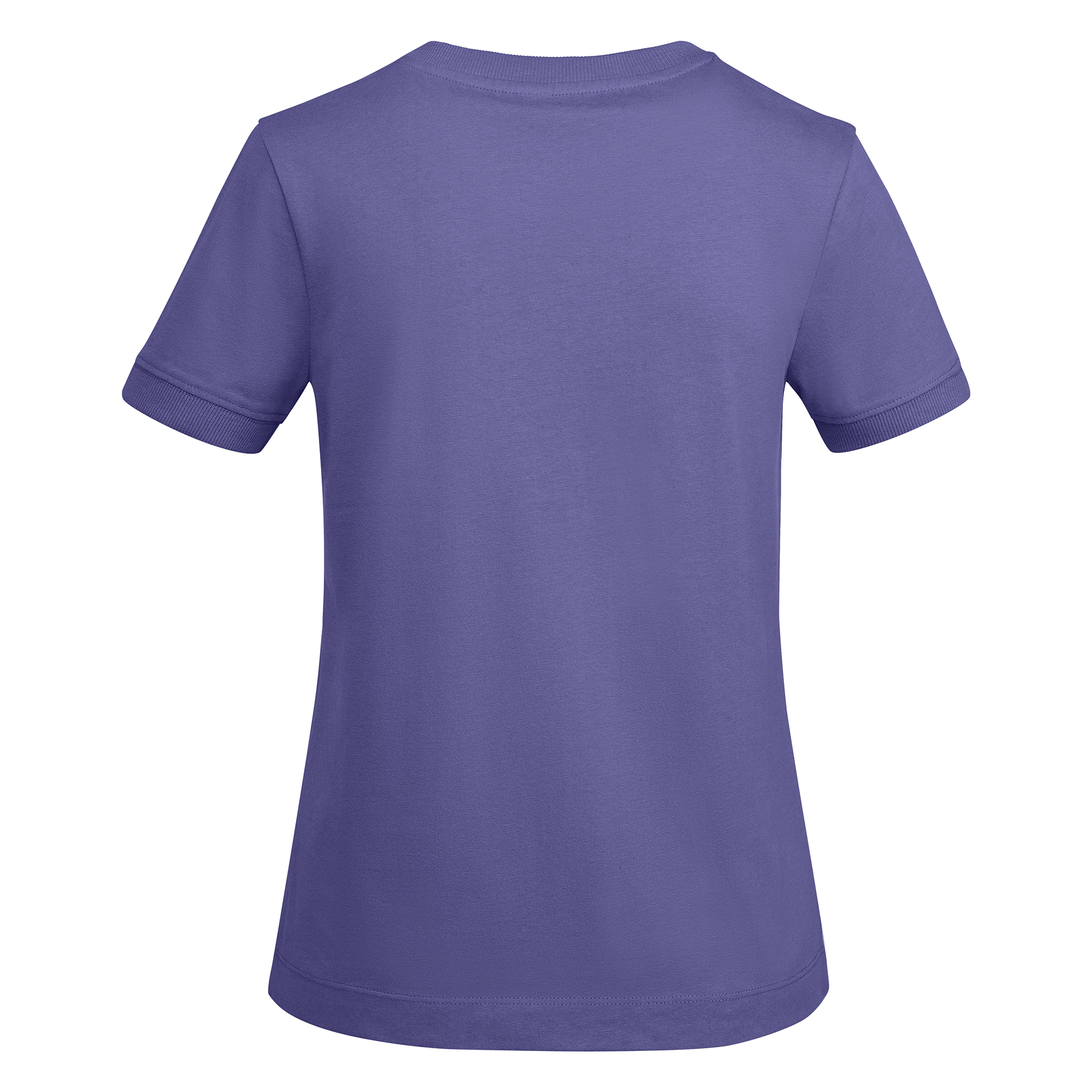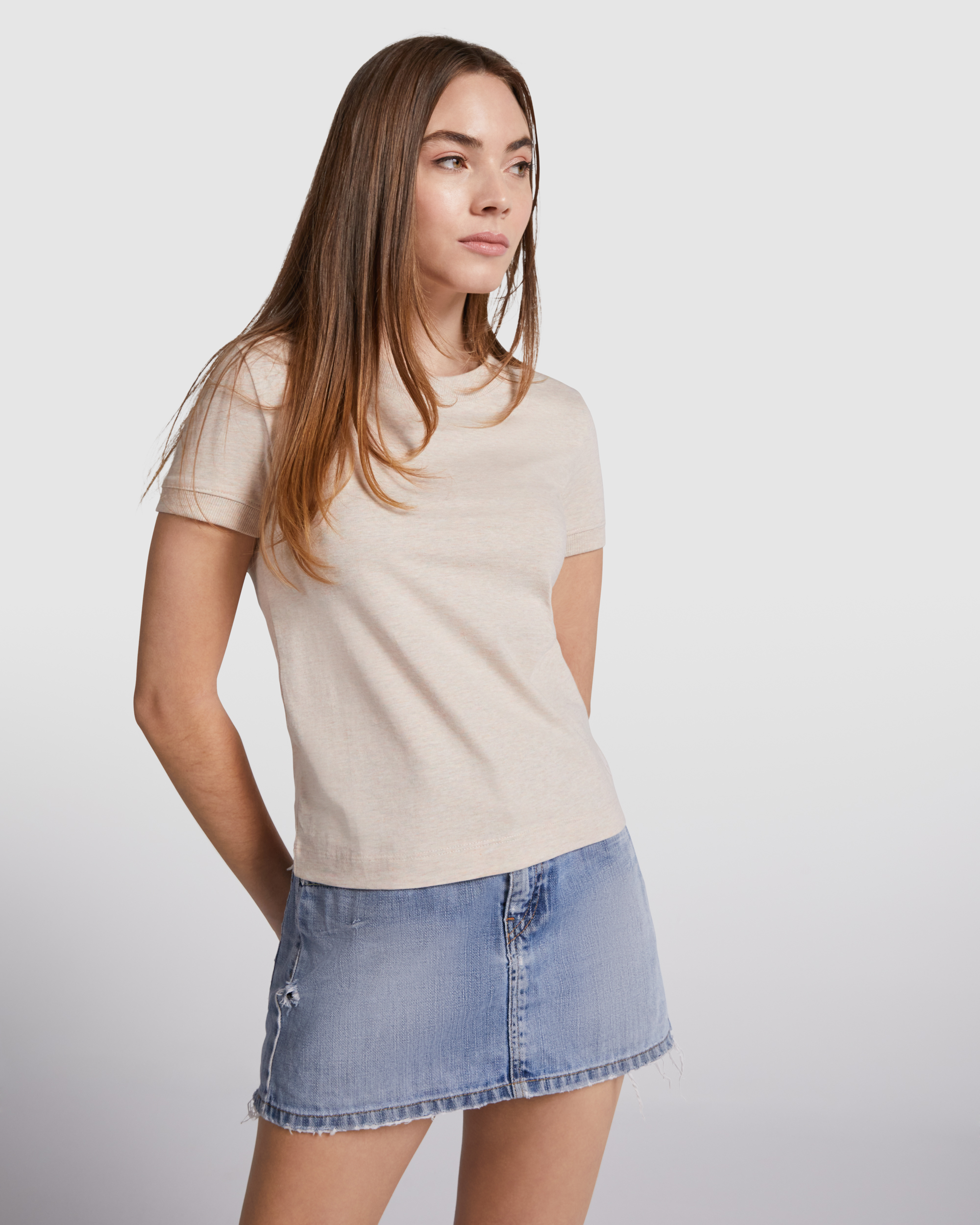Camiseta gruesa de mujer en manga corta de algodón. Cuello redondo y ribete mangas en canalé ancho 2x1. Cubrecosturas reforzado en cuello. Costuras laterales. Logo Roly a tono en bajo lateral izquierdo. Costura ancha en el bajo.