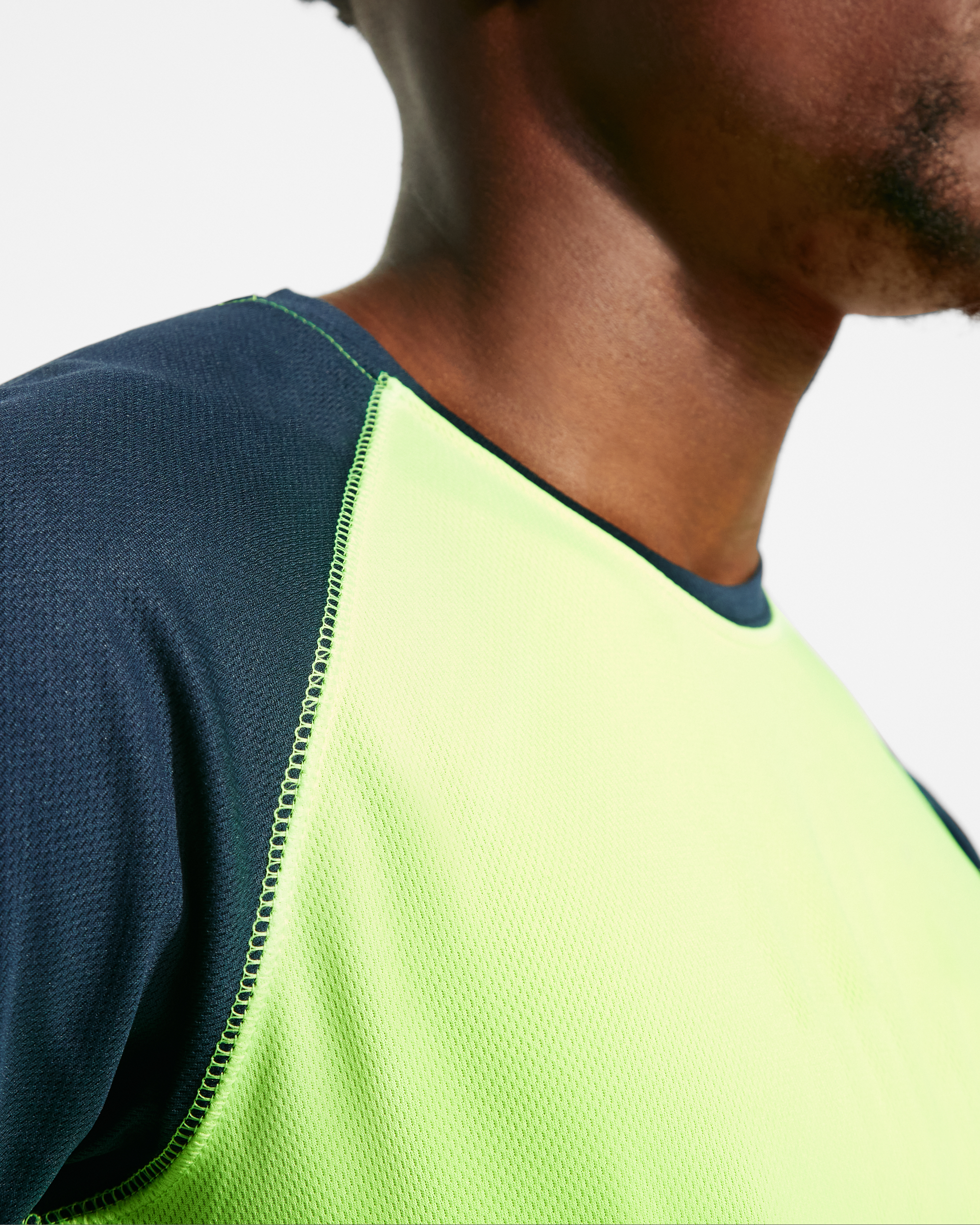 Camiseta deportiva de manga corta estilo ranglan en contraste. Cuello redondo en contraste con cubrecosturas de refuerzo.