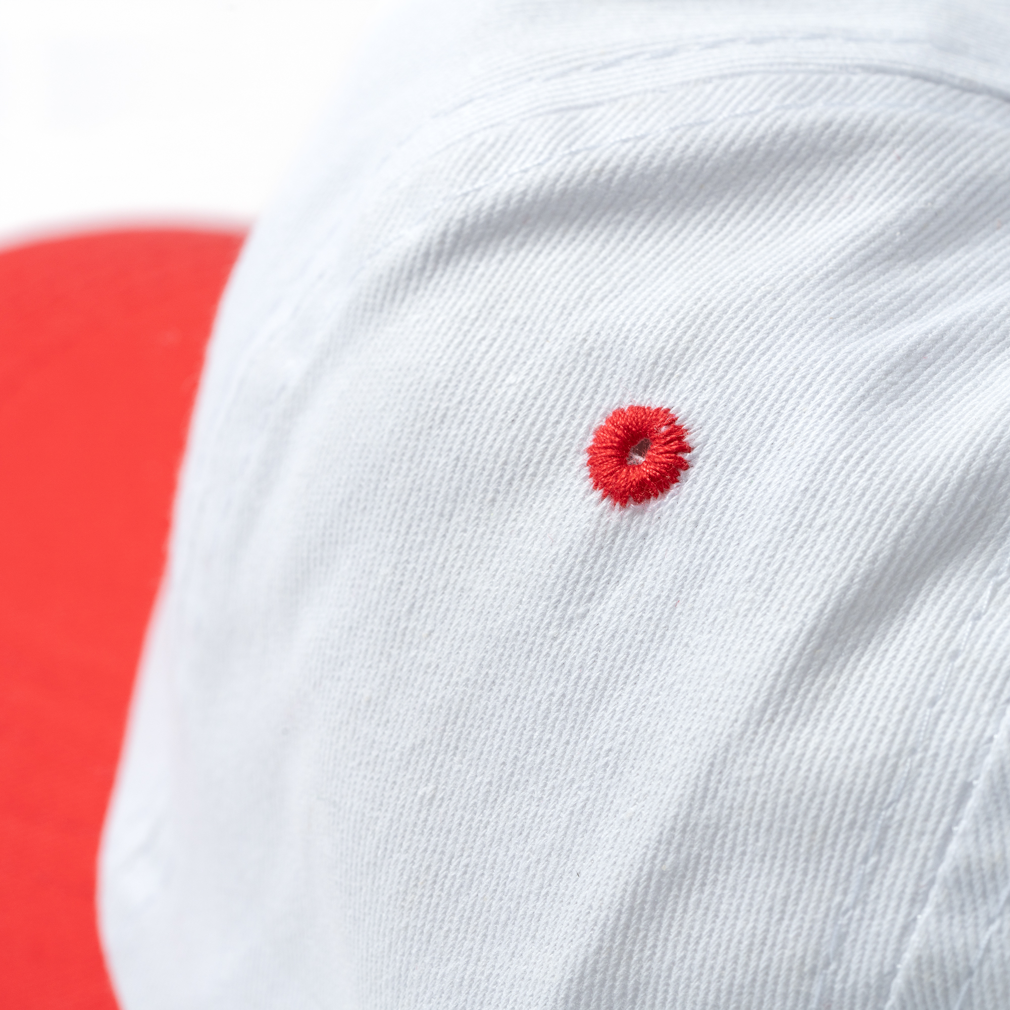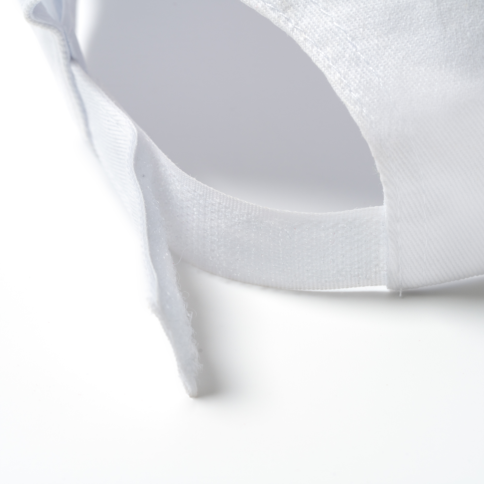 Gorra de 5 paneles 100% algodón. Cierre ajustable de velcro y orificios de ventilación.