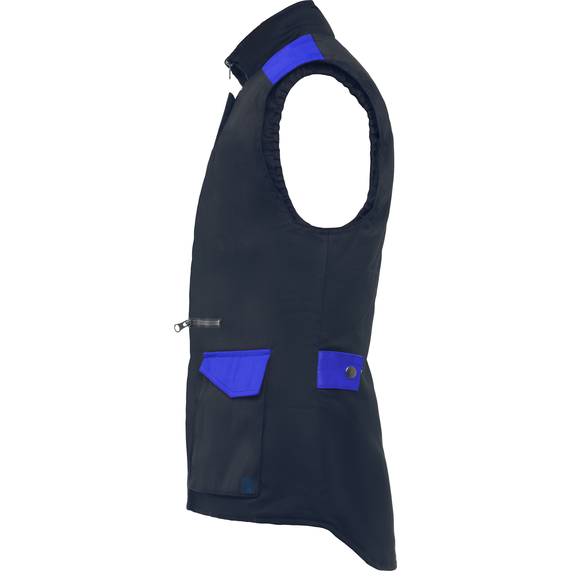 Chaleco laboral multibolsillos con cuello alto en colores combinados.