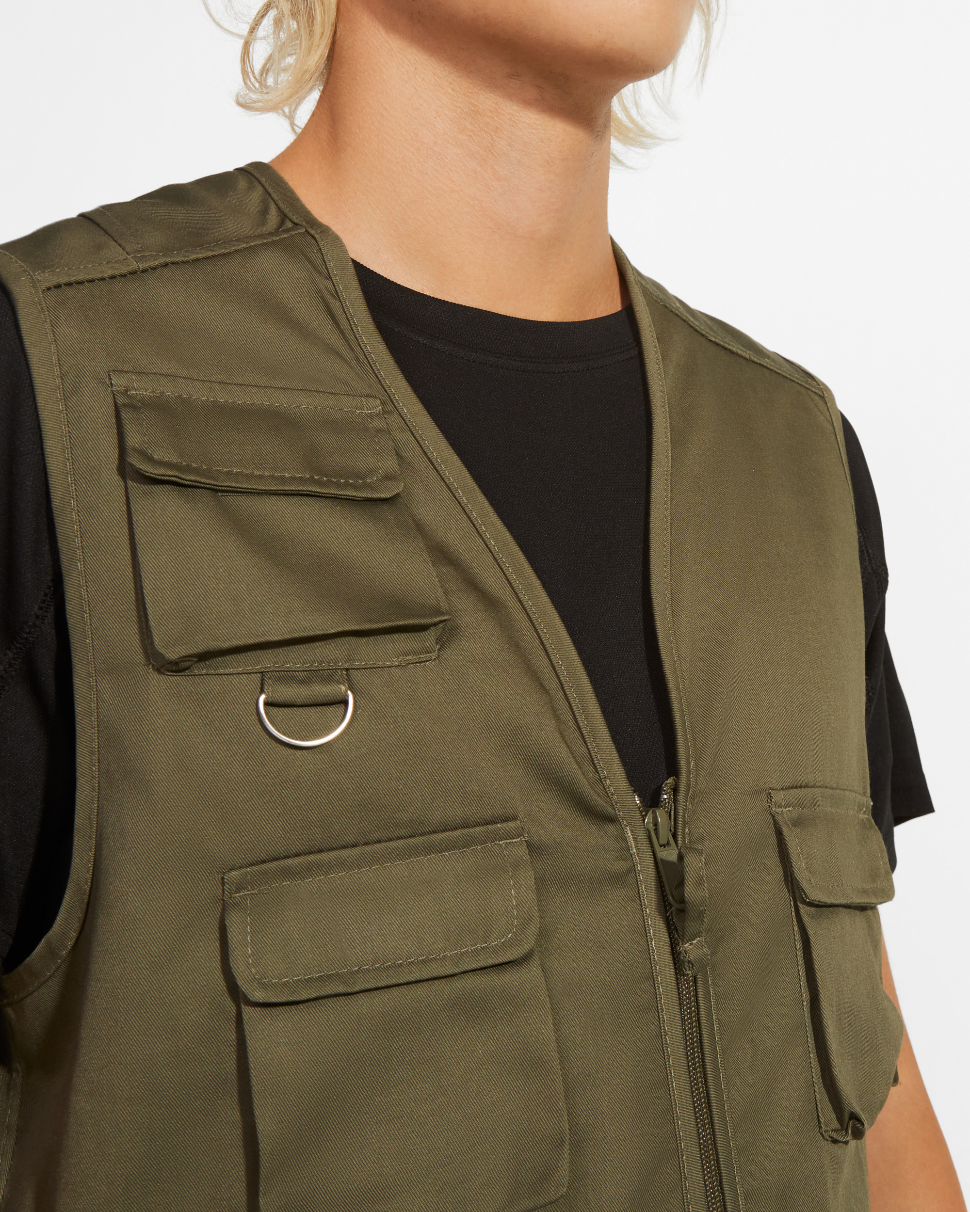 Chaleco laboral multibolsillos con cuello en pico.