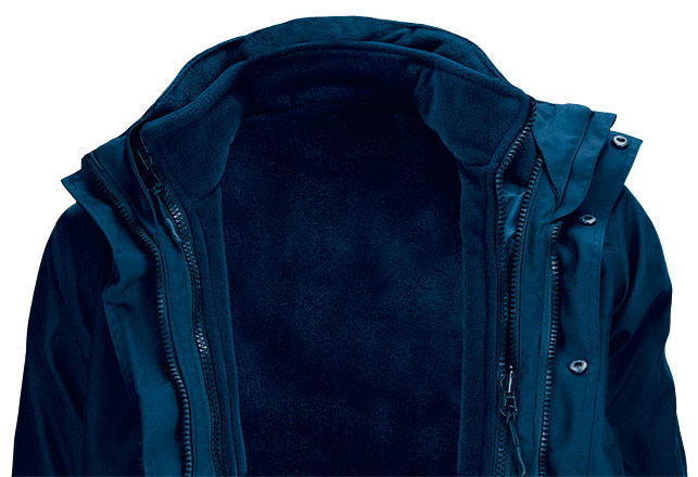 Parka multifunción 3 en 1: como prenda cálida de abrigo, el forro polar se puede usar como prenda independiente extrayéndolo mediante cremalleras y botones de sujeción interiores y queda una parka ligera impermeable con capucha extraíble.
