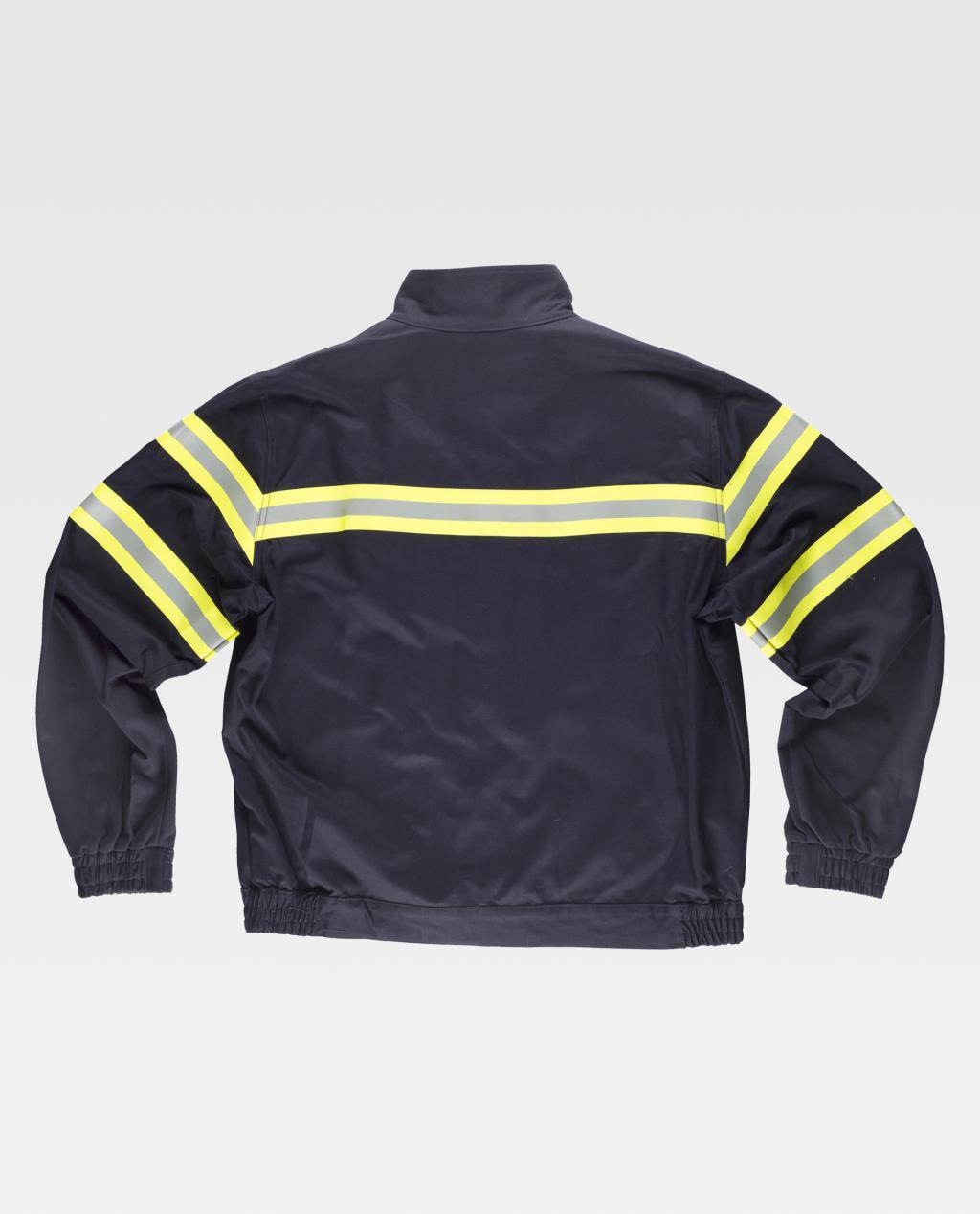 Cazadora ignífuga, antiestática con protección para soldadura y arco eléctrico con cintas reflectante-fluorescentes. Cuello alto, cierre de cremallera de metal y corchetes ocultos por solapa postiza. Un bolso de pecho y dos bolsos laterales, todos de ojal con solapa de seguridad y corchete oculto. Una cinta reflectante-fluorescente ignífuga en pecho y espalda, y dos en mangas. Puño con elástico. Elástico en los laterales de la cintura.