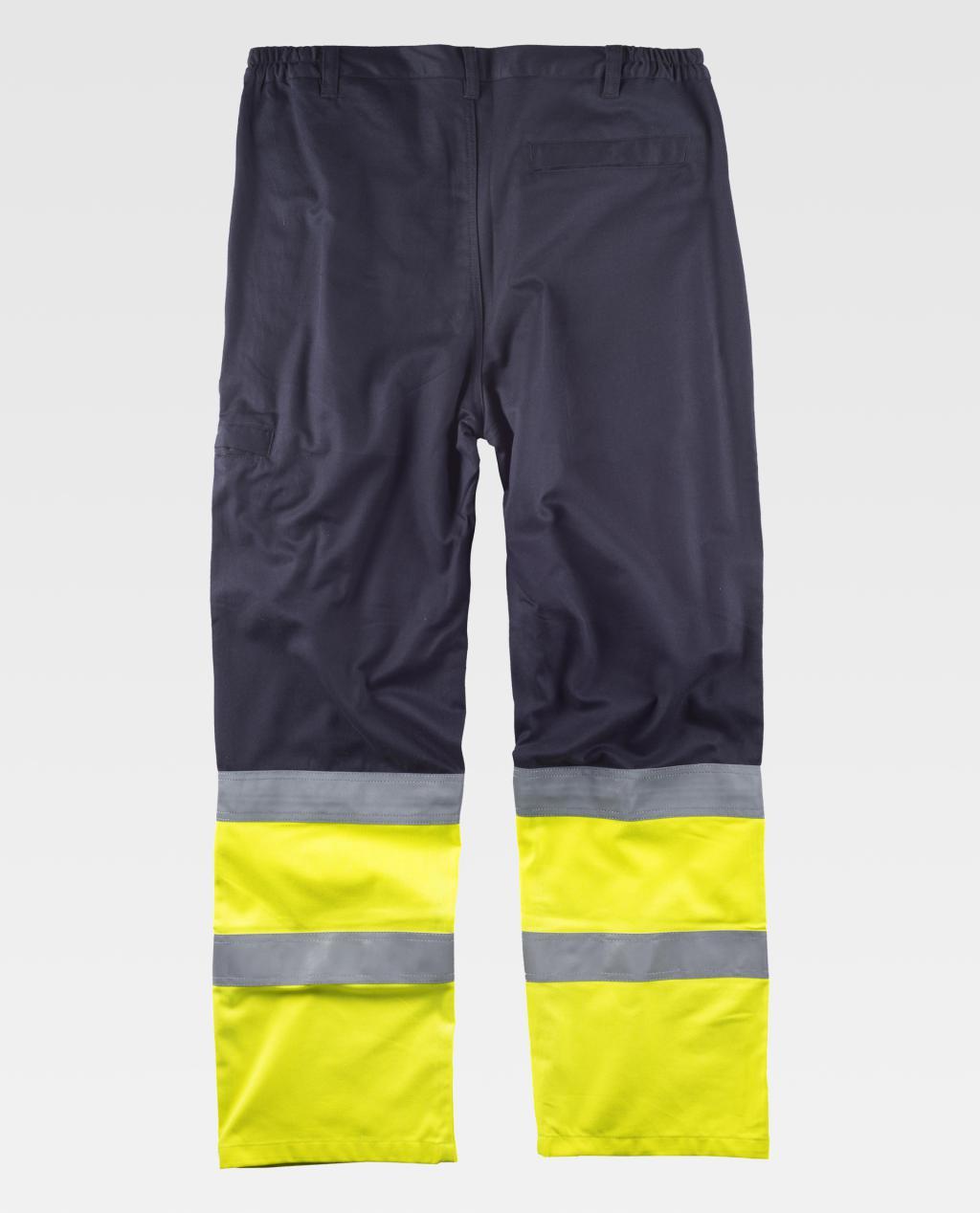Pantalón ignífugo, antiestático con protección para para soldadura, arco eléctrico y contra productos químicos, de alta visibilidad con cintas reflectantes. Dos bolsos de abertura vertical en los costados, un bolso lateral y un bolso trasero, todos de ojal con solapa de seguridad y corchete oculto. Dos cintas reflectantes ignífugas en perneras y combinado con tejido de alta visibilidad. Elástico en la cintura. Trabillas. Cierre de corchete oculto y bragueta de cremallera de metal.